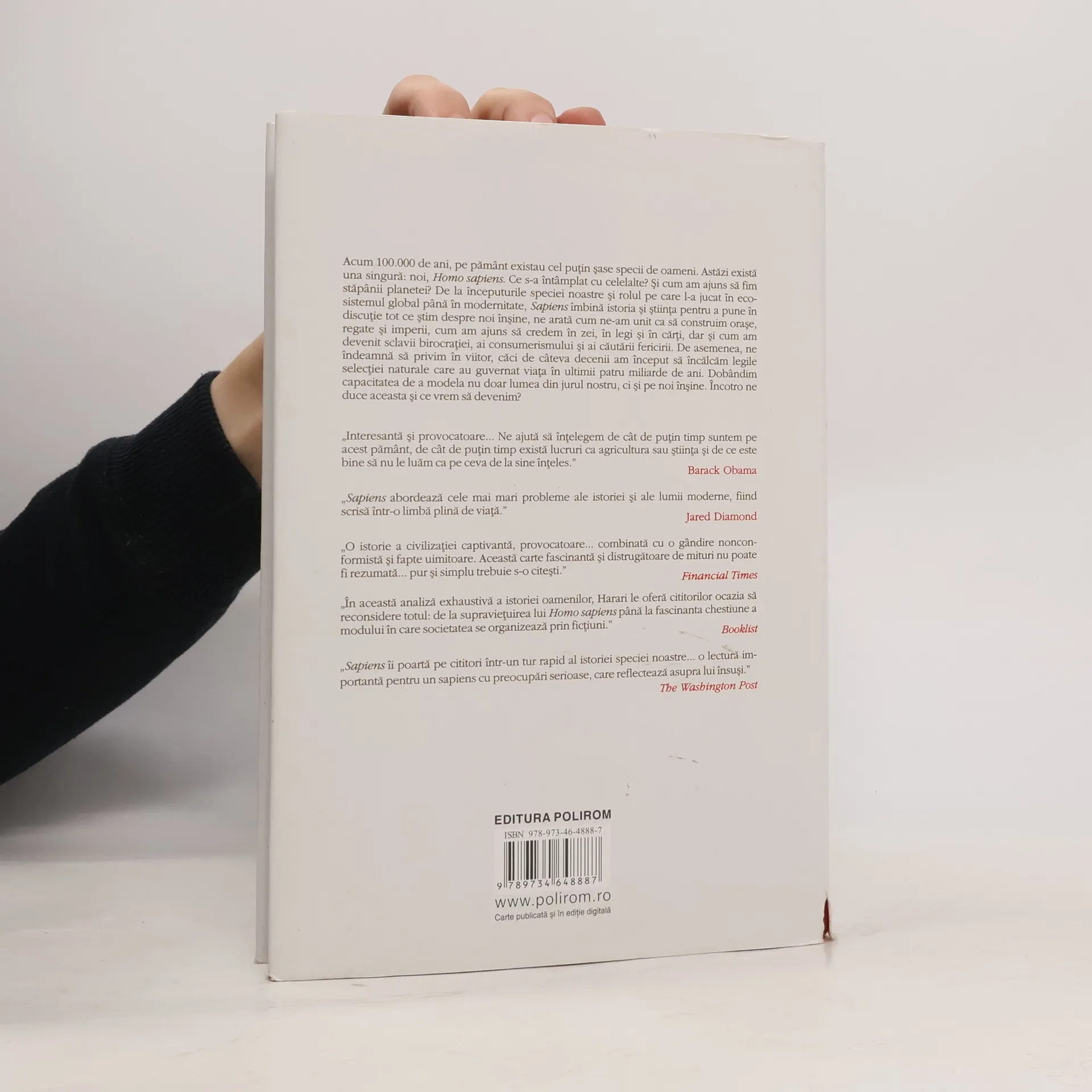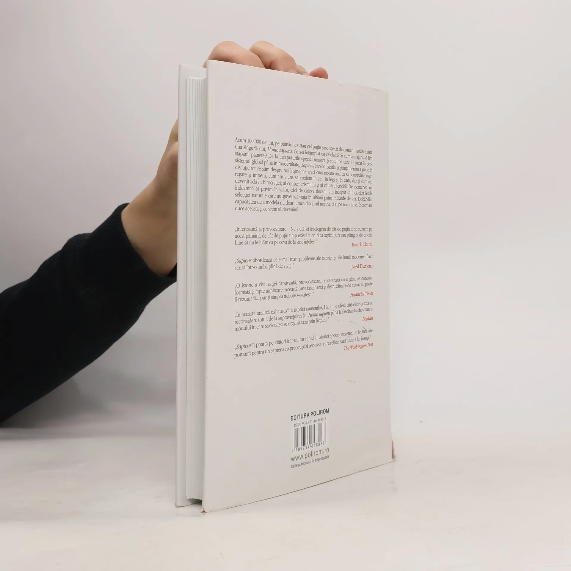 Publicată iniţial în Israel în 2011, Sapiens a devenit rapid bestseller internaţional, fiind tradusă în peste patruzeci de limbi. Acum 100.000 de ani, pe pămînt existau cel puţin şase specii de oameni. Astăzi există una singură: noi, Homo sapiens. Ce s-a întîmplat cu celelalte? Şi cum am ajuns să fim stăpînii planetei? De la începuturile speciei noastre şi rolul pe care l-a jucat în ecosistemul global pînă în modernitate, Sapiens îmbină istoria şi ştiinţa pentru a pune în discuţie tot ce ştim despre noi înşine, ne arată cum ne-am unit ca să construim oraşe, regate şi imperii, cum am ajuns să credem în zei, în legi şi în cărţi, dar şi cum am devenit sclavii birocraţiei, ai consumerismului şi ai căutării fericirii. De asemenea, ne îndeamnă să privim în viitor, căci de cîteva decenii am început să încălcăm legile selecţiei naturale care au guvernat viaţa în ultimii patru miliarde de ani. Dobîndim capacitatea de a modela nu doar lumea din jurul nostru, ci şi pe noi înşine. Încotro ne duce aceasta şi ce vrem să devenim? „Interesantă şi provocatoare... Ne ajută să înţelegem de cît de puţin timp sîntem pe acest pămînt, de cît de puţin timp există lucruri ca agricultura sau ştiinţa şi de ce este bine să nu le luăm ca pe ceva de la sine înţeles.” (Barack Obama) „Sapiens abordează cele mai mari probleme ale istoriei şi ale lumii moderne, fiind scrisă într-o limbă plină de viaţă.” (Jared Diamond) „O istorie a civilizaţiei captivantă, provocatoare... combinată cu o gîndire nonconformistă şi fapte uimitoare. Această carte fascinantă şi distrugătoare de mituri nu poate fi rezumată... pur şi simplu trebuie s-o citeşti.” (Financial Times) „În această analiză exhaustivă a istoriei oamenilor, Harari le oferă cititorilor ocazia să reconsidere totul: de la supravieţuirea lui Homo sapiens pînă la fascinanta chestiune a modului în care societatea se organizează prin ficţiuni.” (Booklist) „Sapiens îi poartă pe cititori într-un tur rapid al istoriei speciei noastre... o lectură importantă pentru un sapiens cu preocupări serioase, care reflectează asupra lui însuşi.” (The Washington Post)