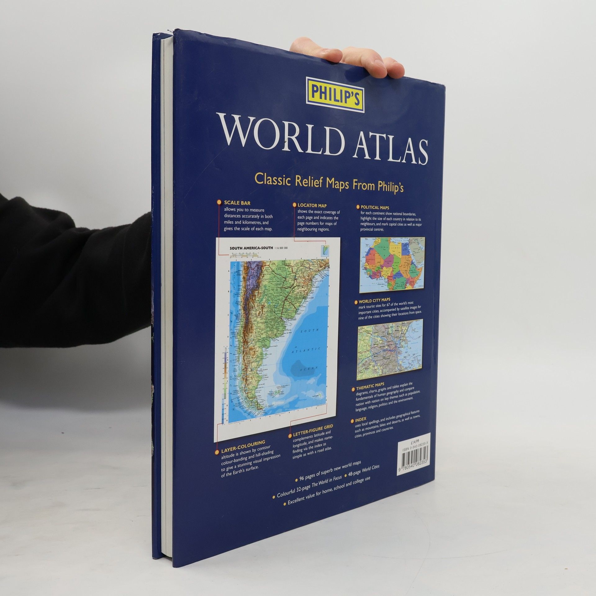 "Philip's World Atlas" is designed as a family atlas, suitable for junior and lower secondary school work, with a 32-page illustrated thematic section providing information on topics such as the Solar System, the structure of the Earth, climate and weather, the environment, population, resources, economics, politics and many others. This atlas also includes a special "World Cities" section, which provides urban area and city centre maps marking tourist sites for 67 of the world's most important cities, backed up by a comprehensive index. Full-page satellite images for 9 of the cities featured complete this section. The 96 pages of physical and political maps aim to give a balanced coverage of the world. Each map is accompanied by a locator diagram and adjoining pages indicator. The 35,000-name index includes geographical features as well as towns and cities, with both letter-figure grid references and latitude and longitude co-ordinates.