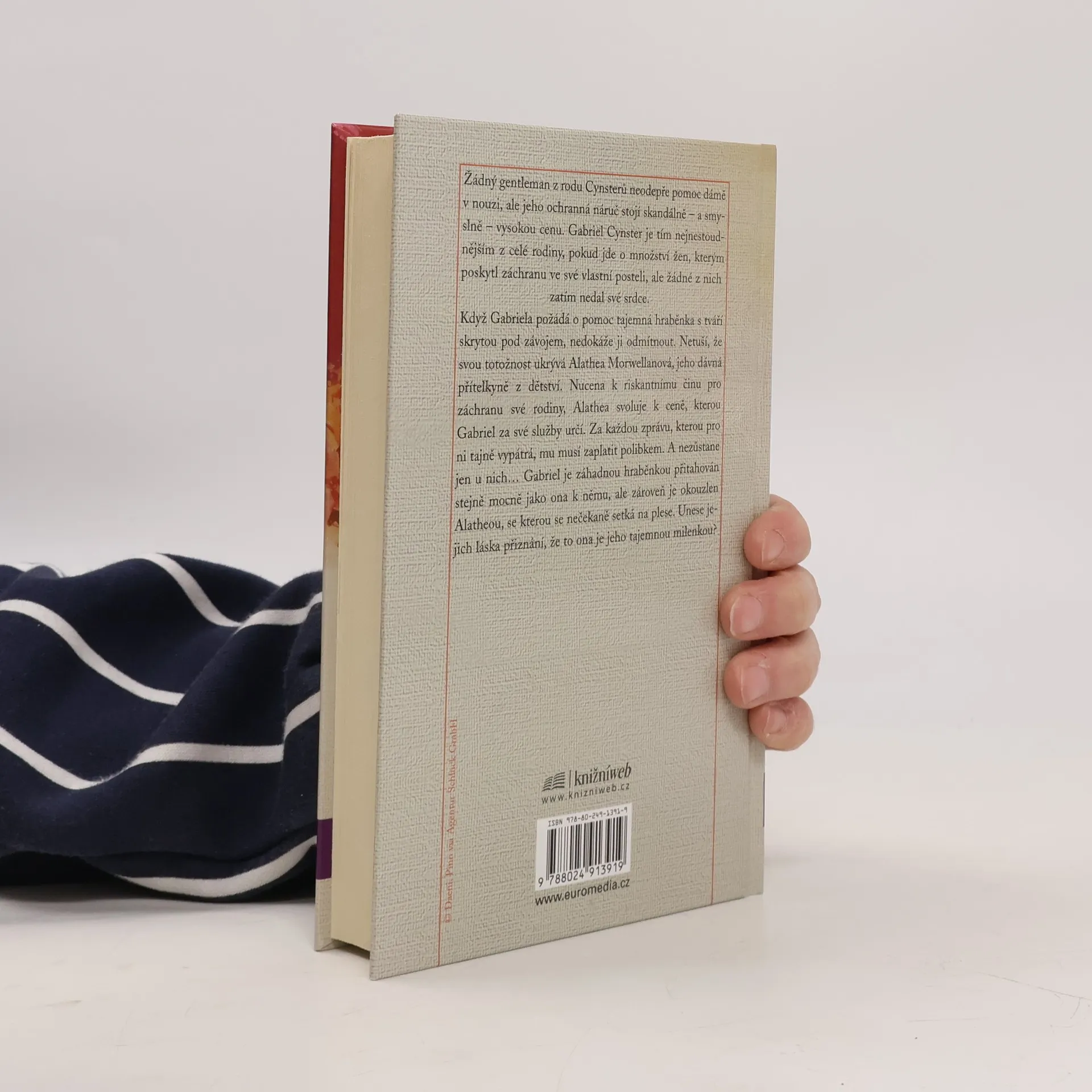 Londýn, 1820 Žádný gentleman z rodu Cynsterů neodepře pomoc dámě v nouzi, ale jeho ochranná náruč stojí skandálně - a smyslně - vysokou cenu. Gabriel Cynster je tím nejnestoudnějším z celé rodiny, pokud jde o množství žen, kterým poskytl záchranu ve své vlastní posteli, ale žádné z nich zatím nedal své srdce. Když Gabriela požádá o pomoc tajemná hraběnka s tváří skrytou pod závojem, nedokáže ji odmítnout. Netuší, že svou totožnost ukrývá Alathea Morwellanová, jeho dávná přítelkyně z dětství. Nucena k riskantnímu činu pro záchranu své rodiny, Alathea svoluje k ceně, kterou Gabriel za své služby určí. Za každou zprávu, kterou pro ni tajně vypátrá, mu musí zaplatit polibkem. A nezůstane jen u nich... Gabriel je záhadnou hraběnkou přitahován stejně mocně jako ona k němu, ale zároveň je okouzlen Alatheou, se kterou se nečekaně setká na plese. Unese jejich láska přiznání, že to ona je jeho tajemnou milenkou?
