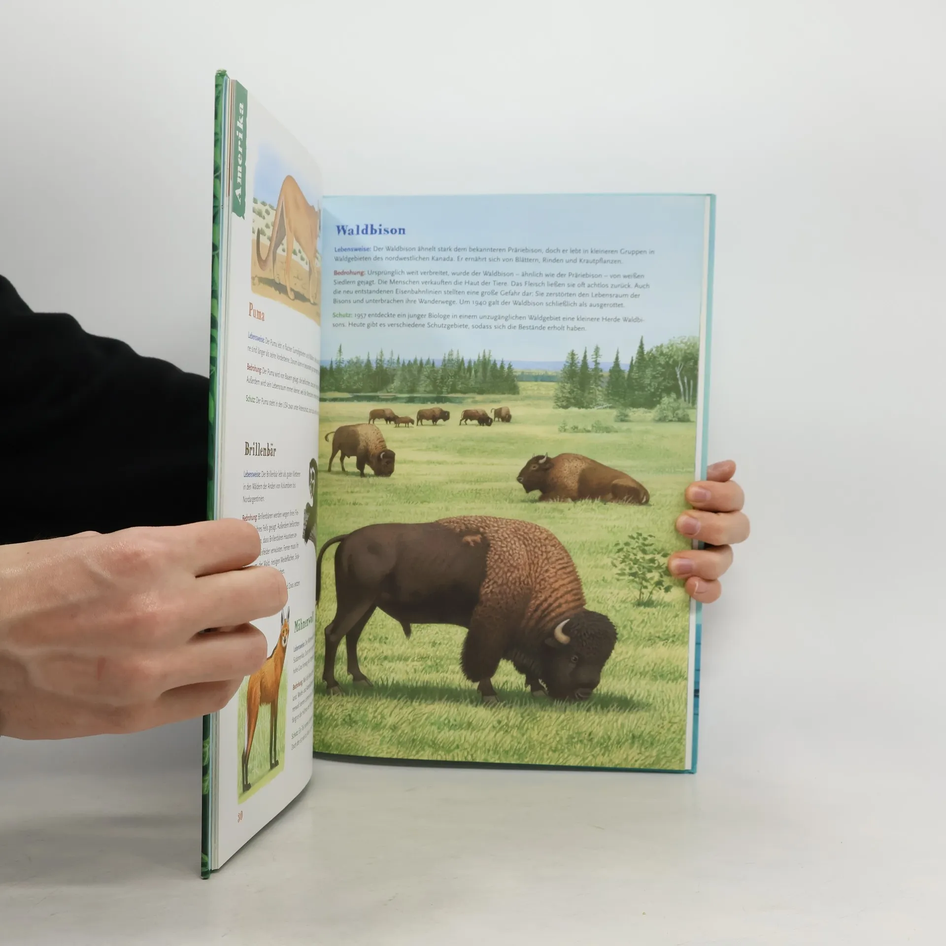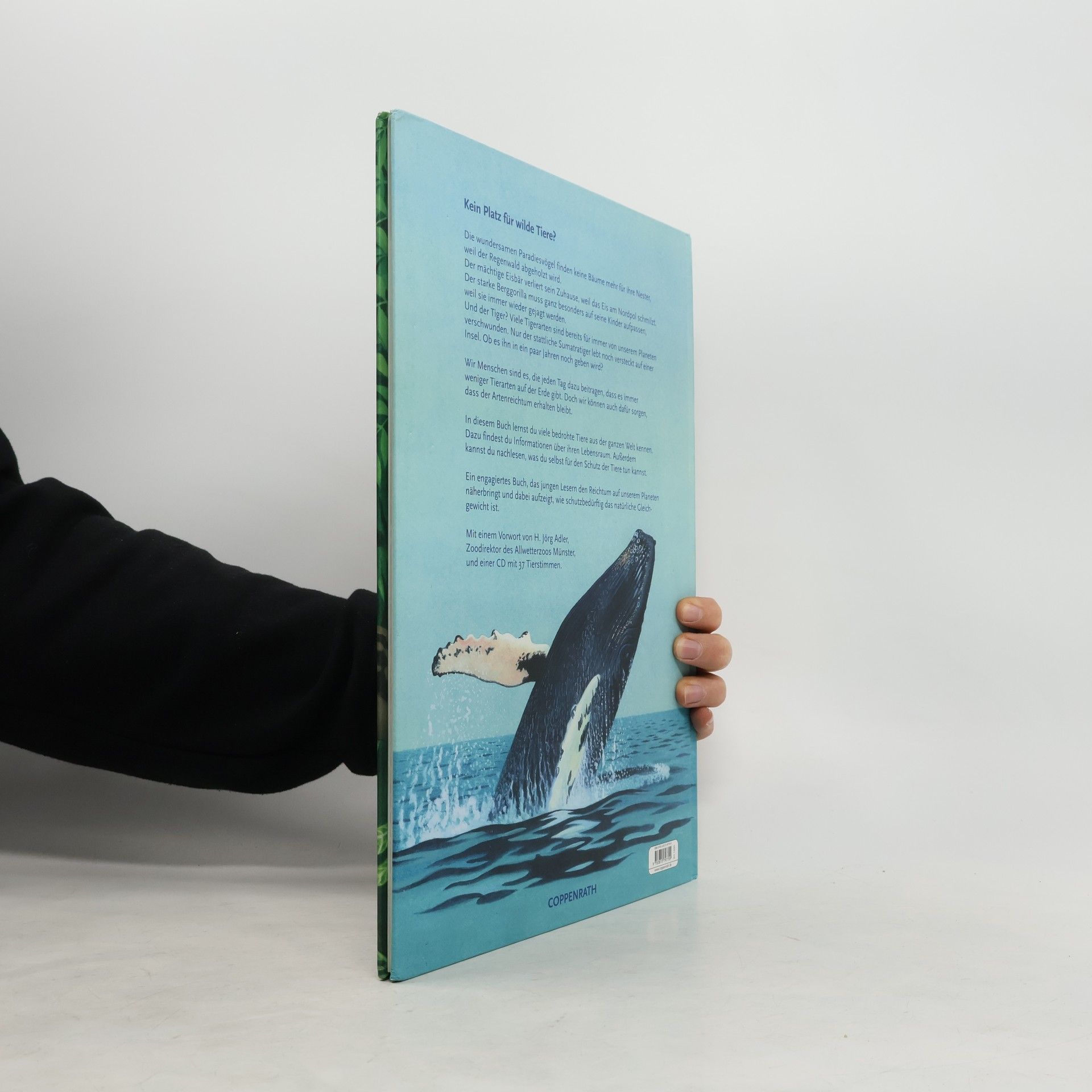 Geordnet nach Kontinenten bzw. Meeren werden gefährdete Tierarten vorgestellt. Die jeweiligen Einleitungsseiten zeigen auf einer Umrisskarte des Kontinents mit Ländergrenzen den Lebensbereich der Tiere. Der Text beschreibt eindringlich grundlegende Probleme und Schutzbemühungen. Die folgenden 4 Seiten zeigen dann 8 Tiere meist mit wenig Umgebung auf weissem Hintergrund, eines ganzseitig in seinem Lebensraum. Die Farbzeichnungen konzentrieren sich auf die wesentlichen Merkmale. Zu jedem Tier eine sehr knappe Beschreibung der Lebensweise, der Bedrohung und des Schutzes, dessen teilweise Vergeblichkeit nicht verschwiegen wird. Der Text spricht die Kinder z.T. direkt an, fordert sie zu konkretem Umweltschutz auf. Zum Schluss Adressen von Umweltorganisationen in Deutschland. Die beiliegende CD bringt die Stimmen von 37 der Tiere zu Gehör, leider ohne Nennung der Namen. Das Thema zuletzt auch in den Fotobüchern "Tierwelt in Gefahr", das viel umfangreicher ist, und "SOS Tiere". Sie lagen zum Vergleich leider nicht vor. Ab 9