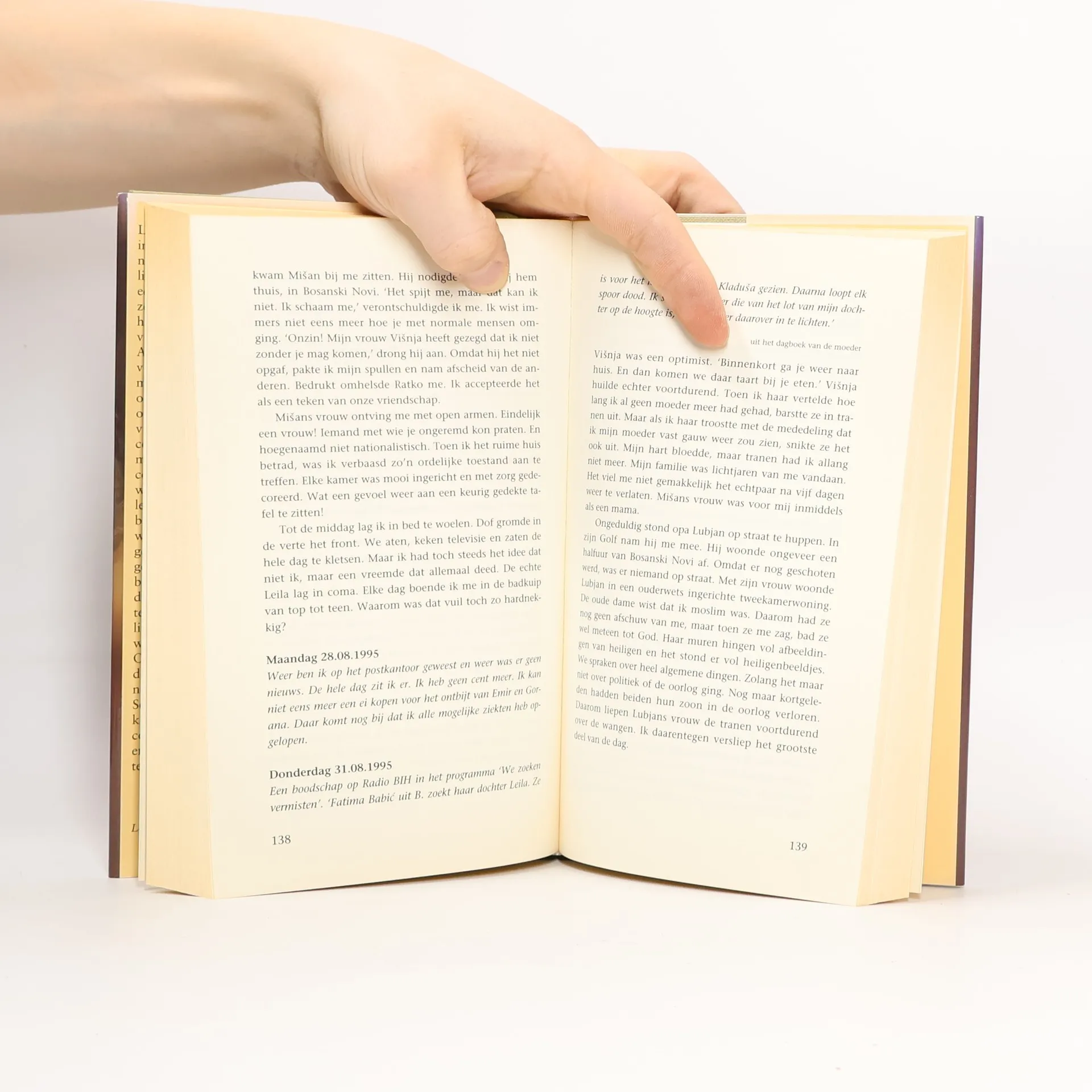 Leila is een gewoon meisje van 15 jaar oud dat in de buurt van Sarajevo woont als de waanzin van de oorlog uitbreekt. Korte tijd later wordt zij door militairen gevangengenomen en in een concentratiekamp gezet. Dat is het begin van een hel die twee jaar zal duren en waarin angst en waan haar bestaan bepalen. Ze wordt mishandeld, gefolterd en verkracht, en na verloop van tijd in een bordeel te werk gesteld. Leila's drang tot zelfmoord is groot, maar haar wil om te overleven blijkt sterker. Op avontuurlijke wijze weet zij te ontvluchten en na vele omzwervingen ziet zij haar moeder - die haar nauwelijks herkent - vijf jaar later weer terug. Leila is thans 24 jaar oud en getraumatiseerd voor het leven. Ondanks de kans op represailles wil zij door het publiceren van dit boek haar stem laten horen en de daders hun straf niet laten ontlopen. NBD|Biblion recensie Alexandra Cavelius heeft vele Bosnische vrouwen gesproken en geholpen om de verschrikkingen van verkrachting , dood en verlies van eigenwaarde in de oorlogstijd te boven te gaan. Het verhaal van Leila, die 15 is bij het uitbreken van de oorlog in Bosnie, is aangrijpend en schokkend: een menselijk bestaan gereduceerd tot het proberen te overleven temidden van pijn, verschrikking, honger en lijden. Cavelius laat Leila haar verhaal cool en afstandelijk vertellen. Tegelijkertijd volgen we via het dagboek van haar moeder de gevoelens van de moeder die jarenlang niet weet of ze haar dochter weer zal zien. Het laatste deel, dat van Leila's gevecht om een waardig bestaan te vinden na de oorlog, getuigt van haar overlevingskracht en moed om te getuigen tegen haar beulen. De stroom van oorlogsmemoires van vooral vrouwen na de oorlogen in voormalig Joegoslavie getuigt ervan dat vrouwen niet meer gebruikt willen worden als oorlogsbuit en vergeldingsobject. Hoe gruwelijk deze verhalen ook zijn, ze zijn uiterst belangrijk voor de emancipatie van onze cultuur. Kleine druk. (Biblion recensie, E. Agoston-Nikolova)