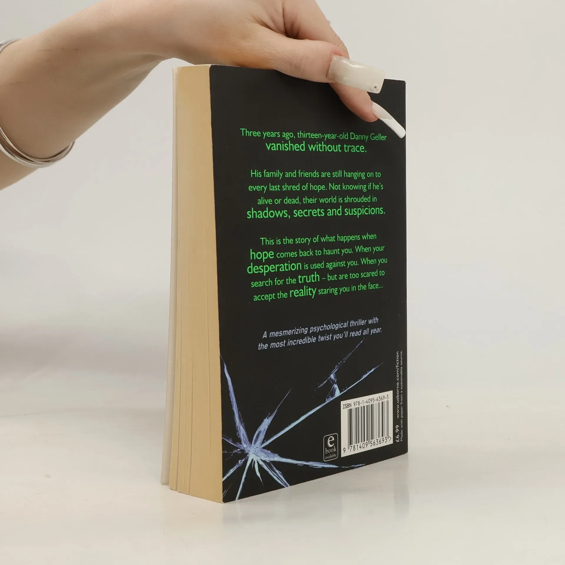Three years ago, thirteen-year-old Danny Geller vanished without trace. His family and friends are still hanging on to every last shred of hope. Not knowing if he's alive or dead, their world is shrouded in shadows, secrets and suspicions. This is the story of what happens when hope comes back to haunt you. When your desperation is used against you. When you search for the truth – but are too scared to accept the reality staring you in the face... A mesmerizing psychological thriller with the most incredible twist you'll read all year.
