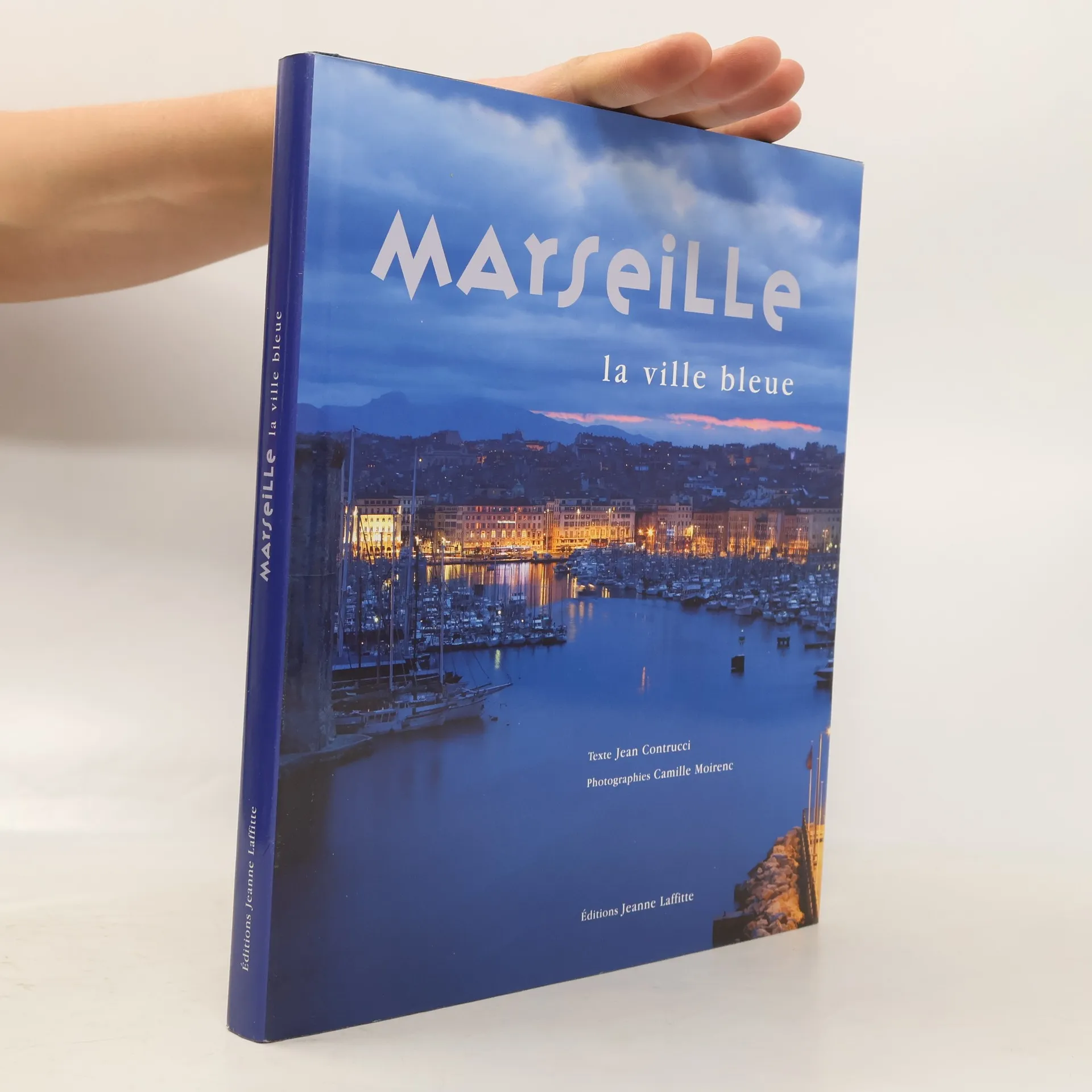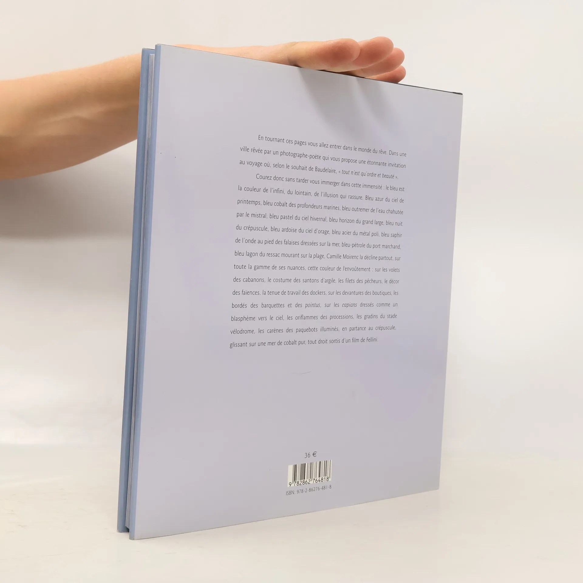 En tournant ces pages vous allez entrer dans le monde du rêve. Dans une ville rêvée par un photographe-poète qui vous propose une étonnante invitation au voyage où, selon le souhait de Baudelaire, « tout n’est qu’ordre et beaut頻. Courez donc sans tarder vous immerger dans cette immensité : le bleu est la couleur de l’infini, du lointain, de l’illusion qui rassure. Bleu azur du ciel de printemps, bleu cobalt des profondeurs marines, bleu outremer de l’eau chahutée par le mistral, bleu pastel du ciel hivernal, bleu horizon du grand large, bleu nuit du crépuscule, bleu ardoise du ciel d’orage, bleu acier du métal poli, bleu saphir de l’onde au pied des falaises dressées sur la mer, bleu-pétrole du port marchand, bleu lagon du ressac mourant sur la plage, Camille Moirenc la décline partout, sur toute la gamme de ses nuances, cette couleur de l'envoûtement : sur les volets des cabanons, le costume des santons d’argile, les filets des pêcheurs, le décor des faïences, la tenue de travail des dockers, sur les devantures des boutiques, les bordés des barquettes et des pointus, sur les capians dressés comme un blasphème vers le ciel, les oriflammes des processions, les gradins du stade vélodrome, les carènes des paquebots illuminés, en partance au crépuscule, glissant sur une mer de cobalt pur, tout droit sortis d’un film de Fellini