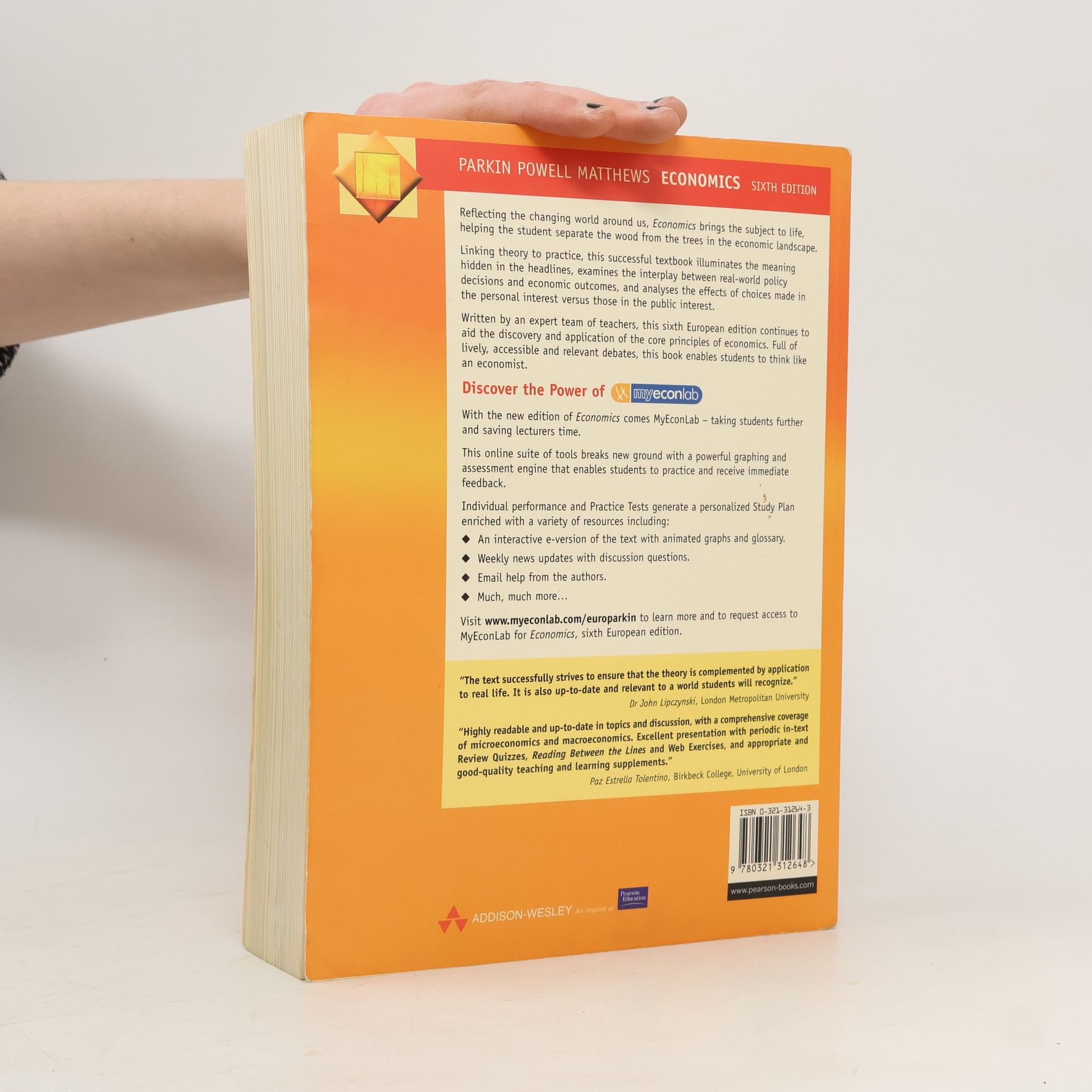 Reflecting the changing world around us, Economics brings the subject to life, helping the student separate the wood from the trees in the economic landscape.Linking theory to practice, this successful textbook illuminates the meaning hidden in the headlines, examines the interplay between real-world policy decisions and economic outcomes, and analyses the effects of choices made in the personal interest versus those in the public interest.Written by an expert team of teachers, this sixth European edition continues to aid the discovery and application of the core principles of economics. Full of lively, accessible and relevant debates, this book enables students to think like an economist.Discover the Power of MyEconLabWith the new edition of Economics comes MyEconLab - taking students further and saving lecturers time. This online suite of tools breaks new ground with a powerful graphing and assessment engine that enables students to practice and receive immediate feedback.Individual performance and Practice Tests generate a personalized Study Plan enriched with a variety of resources including: * An interactive e-version of the text with animated graphs and glossary.* Much, much more...Visit www <a target="_blank" rel="noopener nofollow" href="http://myeconlab.com/europarkin">myeconlab.com/europarkin</a> to learn more and to request access to MyEconLab for Economics, sixth European edition.The text successfully strives to ensure that the theory is complemented by application to real life. It is also up-to-date and relevant to a world students will recognize.Dr John Lipczynski, London Metropolitan University Highly readable and up-to-date in topics and discussion, with a comprehensive coverage of microeconomics and macroeconomics. Excellent presentation with periodic in-text Review Quizzes, Reading Between the Lines and Web Exercises, and appropriate and good-quality teaching and learning supplements.Paz Estrella Tolentino, Birkbeck College, University of Londo