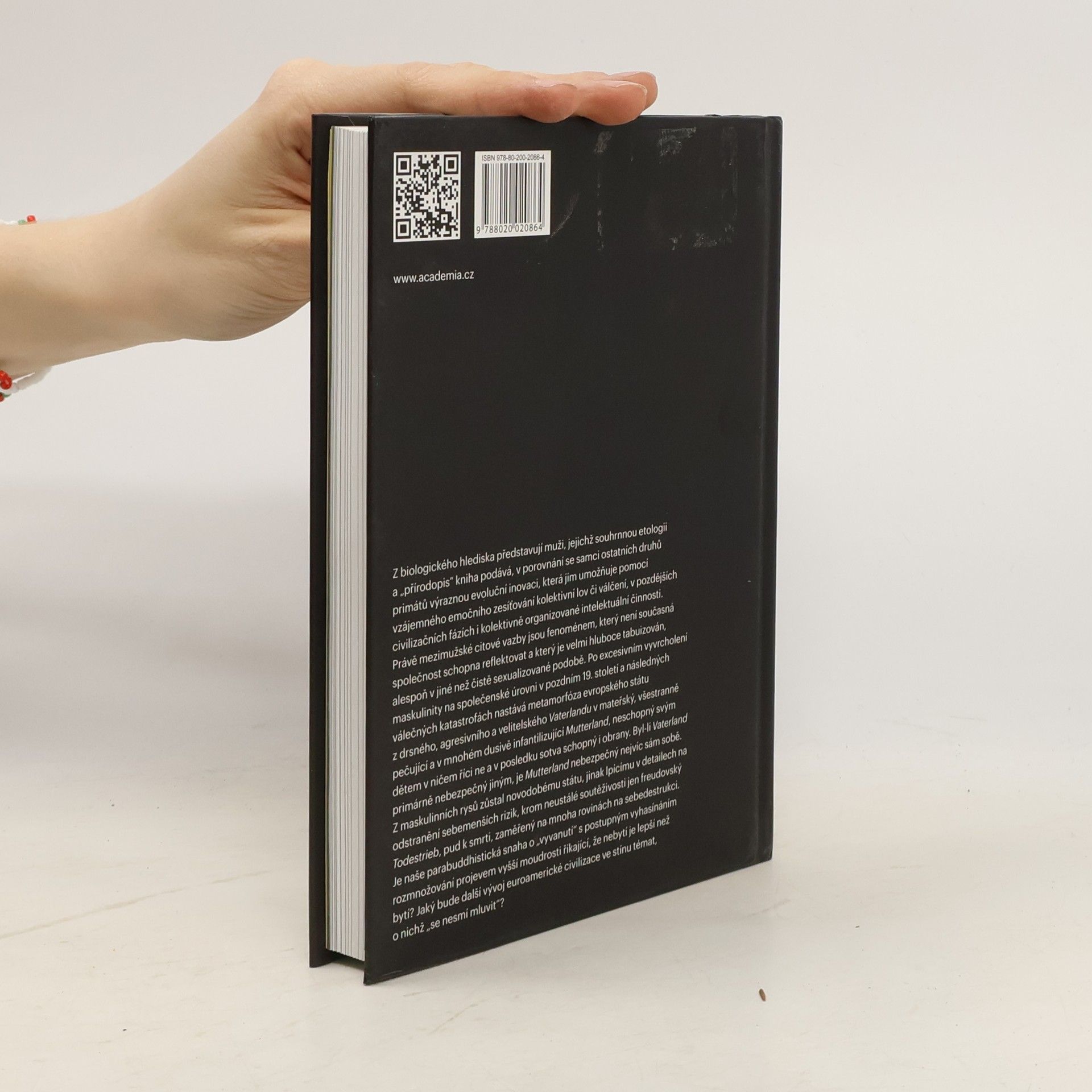 Jaké jsou etologie a životní strategie příslušníků mužského pohlaví u lidí i v živočišné říši? Jak vlastně fungují mužské society a co je jejich emocionálním tmelem? Nadchází v západní společnosti soumrak tradiční maskulinity a kam se vlastně stáhla či v co se proměnila? Jak se změnil stát, kdysi drsný a k obětem vyzývající Vaterland, ve všeobjímavě pečující Mutterland? Nejeví se islámský svět jako ohrožující hlavně proto, že v něm tato proměna neproběhla? Směřuje západní svět k pozvolnému „vyvanutí“ a „ublahobytnění“, souvisejícímu se stále nižší produkcí potomstva? Jak moc jsou rozdíly mezi pohlavími dané dědičně a v jakém rozsahu kulturně, nedochází vlastně paralelně s „krizí maskulinity“ i ke „krizi femininity“?