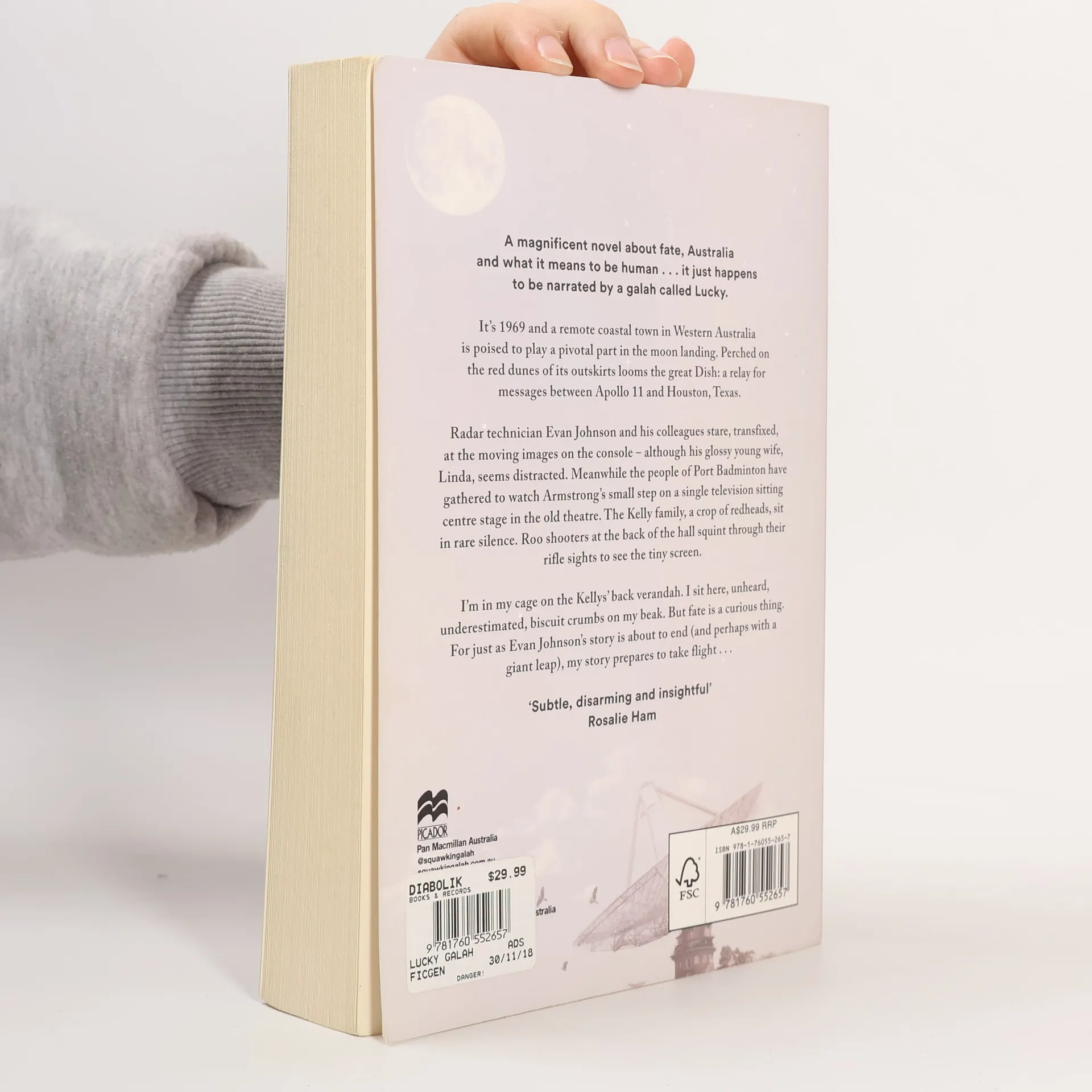 It's 1969 and a remote coastal town in Western Australia is poised to play a pivotal part in the moon landing. Perched on the red dunes of its outskirts looms the great Dish: a relay for messages between Apollo 11 and Houston, Texas. Crouched around a single grainy set, radar technician Evan Johnson and his colleagues stare at the screen, transfixed, as Armstrong takes that first small step. I was in my cage of course, unheard, underestimated, biscuit crumbs on my beak. But fate is a curious thing. For just as Evan Johnson's story is about to end (and perhaps with a giant leap), my story prepares to take flight... <i>The Lucky Galah</i> is a novel about fate. About Australia. About what it means to be human. It just happens to be narrated by a galah called Lucky.