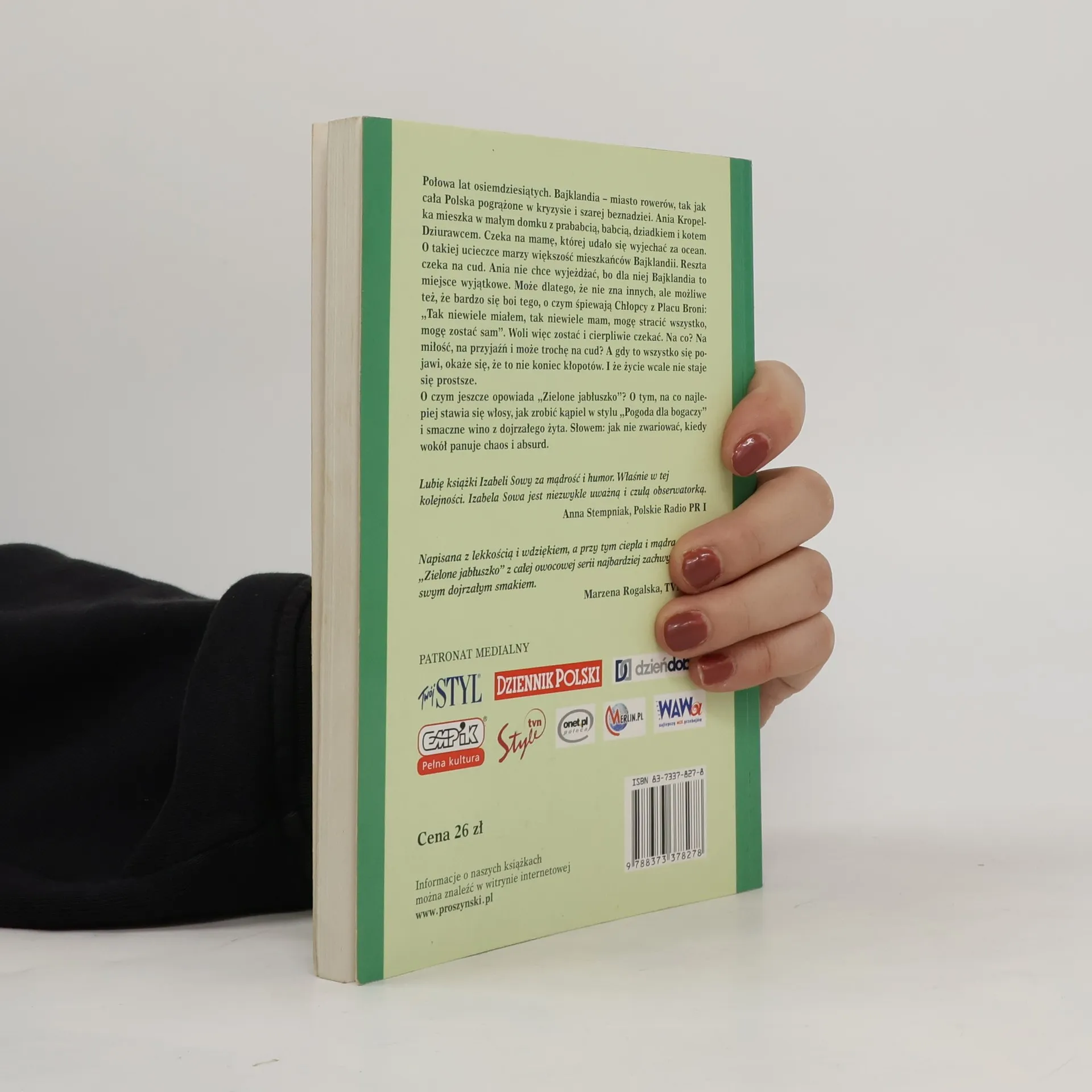 Połowa lat osiemdziesiątych. Bajklandia - miasto rowerów, tak jak cała Polska pogrążone w kryzysie i szarej beznadziei. Ania Kropelka mieszka w małym domku. Razem z prababcią, babcią, dziadkiem i kotem Dziurawcem czeka na mamę, której udało się wyjechać z Polski. O takiej ucieczce za ocean marzy większość mieszkańców Bajklandii. Reszta biernie czeka na cud. Ania nie chce wyjeżdżać. Dla niej Bajklandia to miejsce wyjątkowe. Być może dlatego, że nie zna innych. A możliwe, że bardzo się boi tego, o czym śpiewają Chłopcy z Placu Broni: „Tak niewiele miałem, tak niewiele mam, mogę stracić wszystko, mogę zostać sam”. Woli więc zostać i cierpliwie czekać. Na co? Na miłość, na przyjaźń i może trochę na cud? A gdy to wszystko się pojawi, okaże się, że to nie koniec kłopotów. I że życie wcale nie staje się prostsze. O czym jeszcze opowiada „Zielone jabłuszko”? O tym, na co najlepiej stawia się włosy, jak zrobić kąpiel w stylu „Pogoda dla bogaczy” i smaczne wino z dojrzałego żyta. Słowem: jak nie zwariować, kiedy wokół panuje chaos i absurd.
