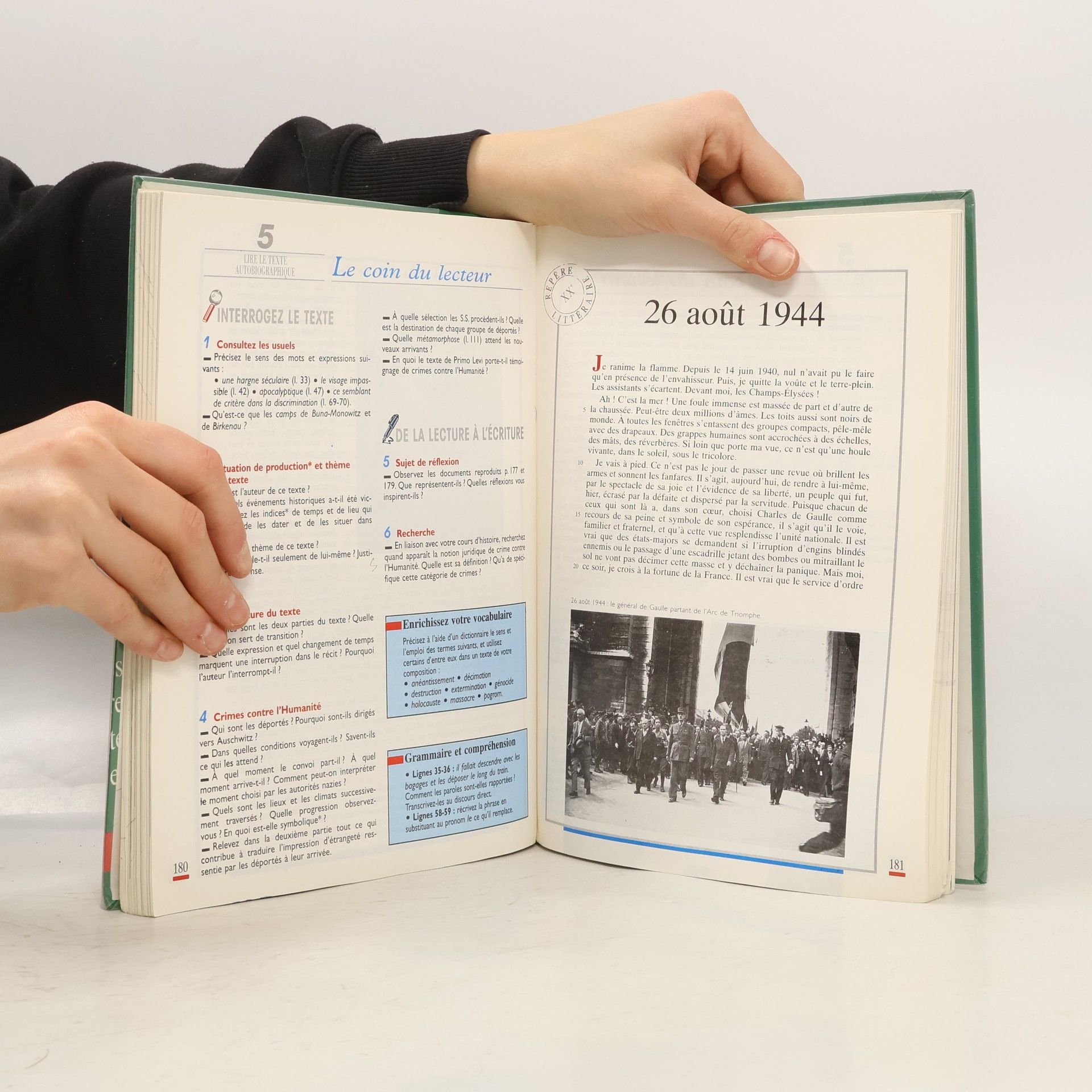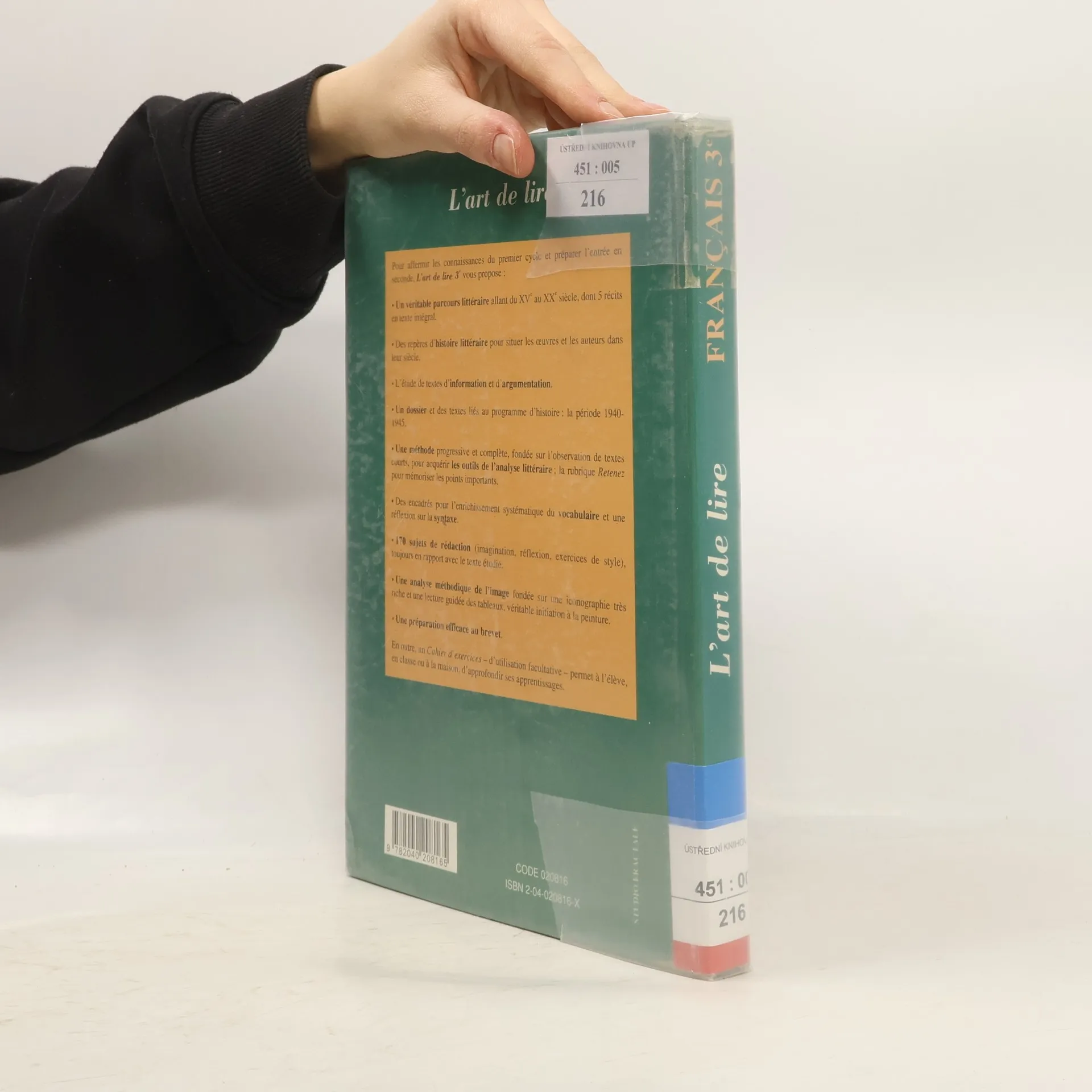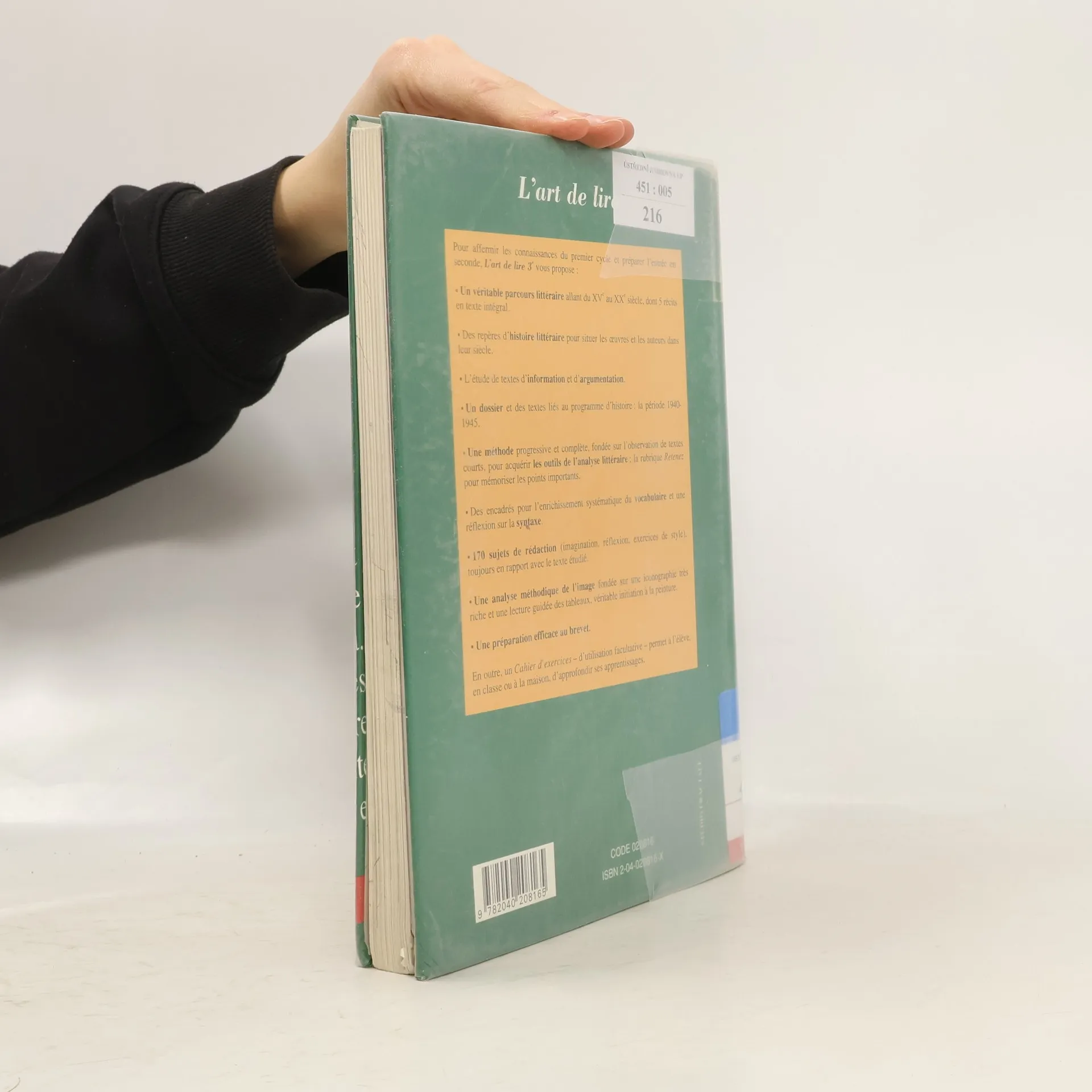 Pour affermir les connaissances du premier cycle et préparer l'entrée en seconde, L'art de lire 3ème vous propose : - un véritable parcours littéraire allant du XVème au XXème siècle, dont 5 récits en texte intégral. - des repères d'histoIre littéraire pour situer les œuvres et les auteurs dans leur siècle. - l'étude de textes d'information et d'argumentation. - un dossier et des textes liés au programme d'histoire : la période 1940-1945. - une méthode progressive et complète, fondée sur l'observation de textes courts, pour acquérir les outils de l'analyse littéraire ; la rubrique Retenez pour mémoriser les points importants. - des encadrés pour l'enrichissement systématique du vocabulaire et une réflexion sur la syntaxe. - 170 sujets de rédaction (imagination, réflexion, exercices de style), toujours en rapport avec le texte étudié. - une analyse méthodique de l'image fondée sur une iconographie très riche et une lecture guidée des tableaux, véritable initiation à la peinture. - une préparation efficace au brevet.