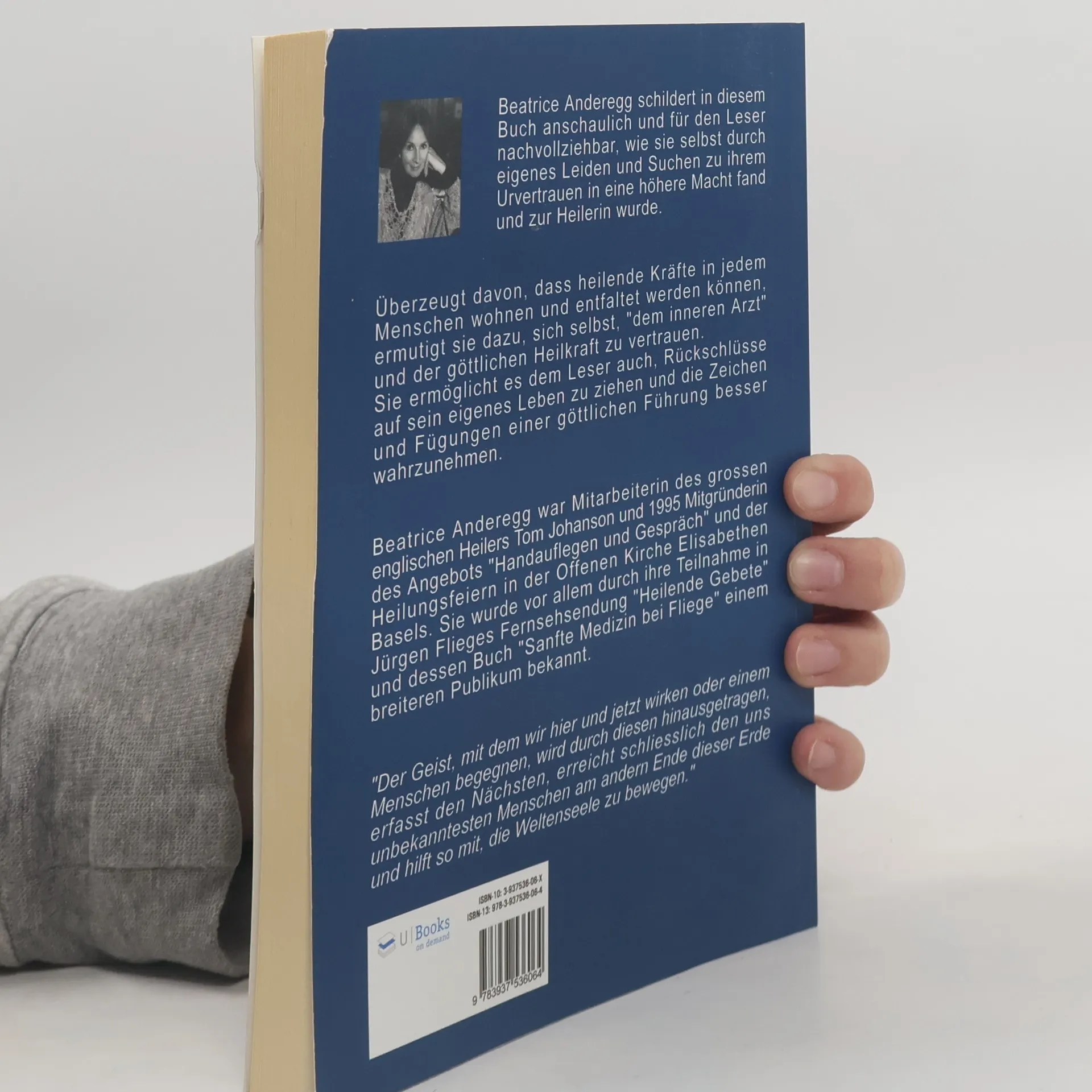Beatrice Anderegg schildert in diesem Buch anschaulich und für den Leser nachvollziehbar, wie sie selbst durch eigenes Leiden und Suchen zu ihrem Urvertrauen in eine höhere Macht fand und zur Heilerin wurde. Überzeugt davon, dass heilende Kräfte in jedem Menschen wohnen, und entfaltete werden könne, ermutigt Sie dazu, sich selbst „dem inneren Arzt“ und der göttlichen Heilkraft zu vertrauen. Sie ermöglicht es dem Leser auch, Rückschlüsse auf sein eigenes Leben zu ziehen und die Zeichen und Fügungen einer göttlichen Führung besser wahrzunehmen. Beatrice Anderegg war Mitarbeiter des großen englischen Heilers Tom Johanson und 1995 Mitgründerin des Angebots „Handauflegen und Gespräch“ und der Heilungsfeiern in der offenen Kirch Elisabethen Basels. Sie wurde vor allem durch ihre Teilnahem in Jürgen Flieges Fernsehsendung „ Heilende Gebete“ und dessen Buch „Sanfte Medizin bei Fliege“ einem breiteren Publikum bekannt. „Der Geist, mit dem wir hier und jetzt wirken oder einem Menschen begegnen, wird durch diesen hinausgetragen, erfasst den Nächsten, erreicht schließlich den uns unbekanntesten Menschen am andern Ende dieser Erde und hilft so mit, die Weltenseele zu bewegen.“