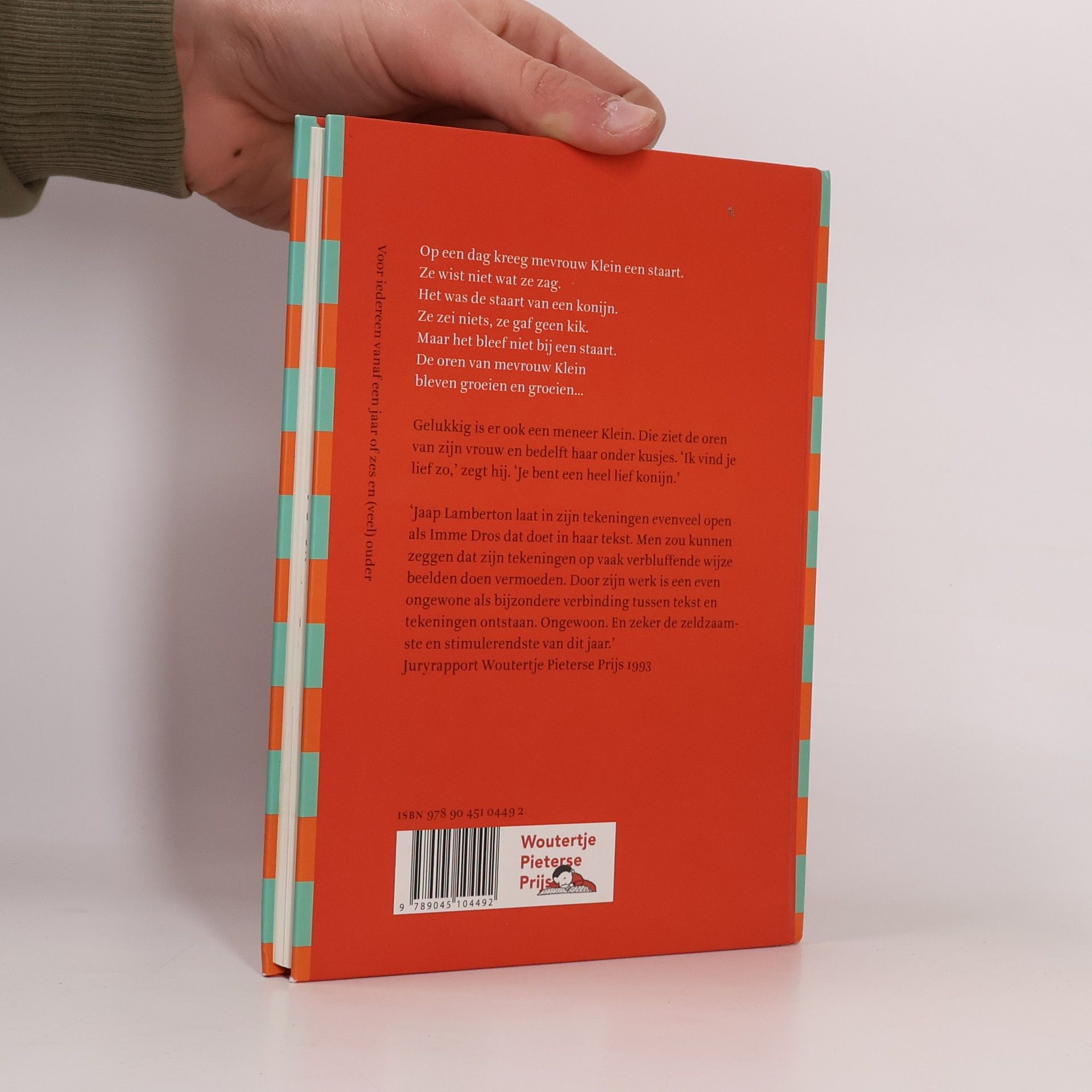 Als mevrouw Klein steeds meer op een konijn gaat lijken, vindt iedereen haar raar, behalve meneer Klein. Prentenboek met krasserige, quasikinderlijke tekeningen in zwart-wit. Vanaf ca. 6 jaar.