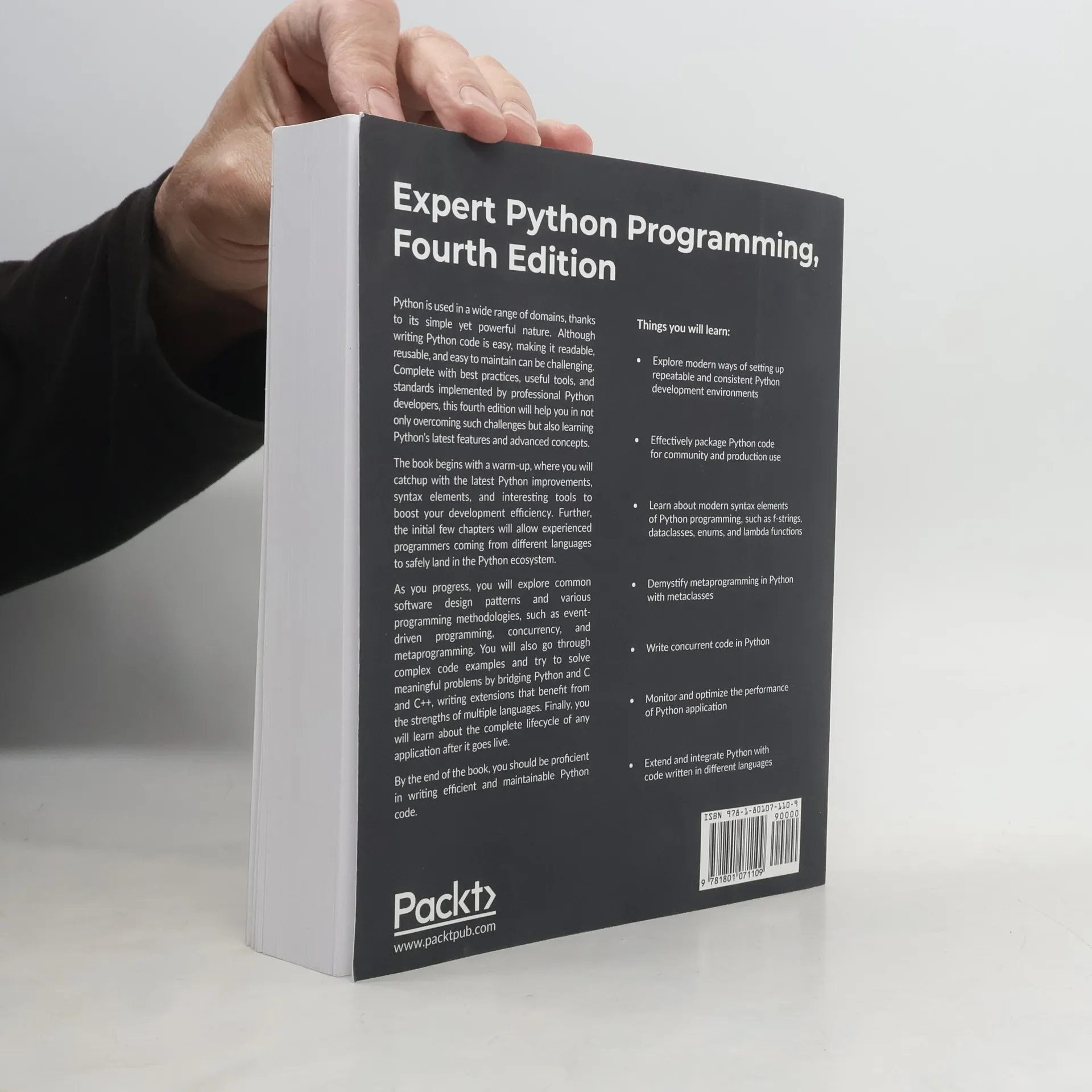 Gain a deep understanding of building, maintaining, packaging, and shipping robust Python applications This new edition of Expert Python Programming provides you with a thorough understanding of the process of building and maintaining Python apps. Complete with best practices, useful tools, and standards implemented by professional Python developers, this fourth edition has been extensively updated. Throughout this book, you'll get acquainted with the latest Python improvements, syntax elements, and interesting tools to boost your development efficiency. The initial few chapters will allow experienced programmers coming from different languages to transition to the Python ecosystem. You will explore common software design patterns and various programming methodologies, such as event-driven programming, concurrency, and metaprogramming. You will also go through complex code examples and try to solve meaningful problems by bridging Python with C and C++, writing extensions that benefit from the strengths of multiple languages. Finally, you will understand the complete lifetime of any application after it goes live, including packaging and testing automation. By the end of this book, you will have gained actionable Python programming insights that will help you effectively solve challenging problems. The Python programming book is intended for expert programmers who want to learn Python's advanced-level concepts and latest features. Anyone who has basic Python skills should be able to follow the content of the book, although it might require some additional effort from less experienced programmers. It should also be a good introduction to Python 3.9 for those who are still a bit behind and continue to use other older versions.
