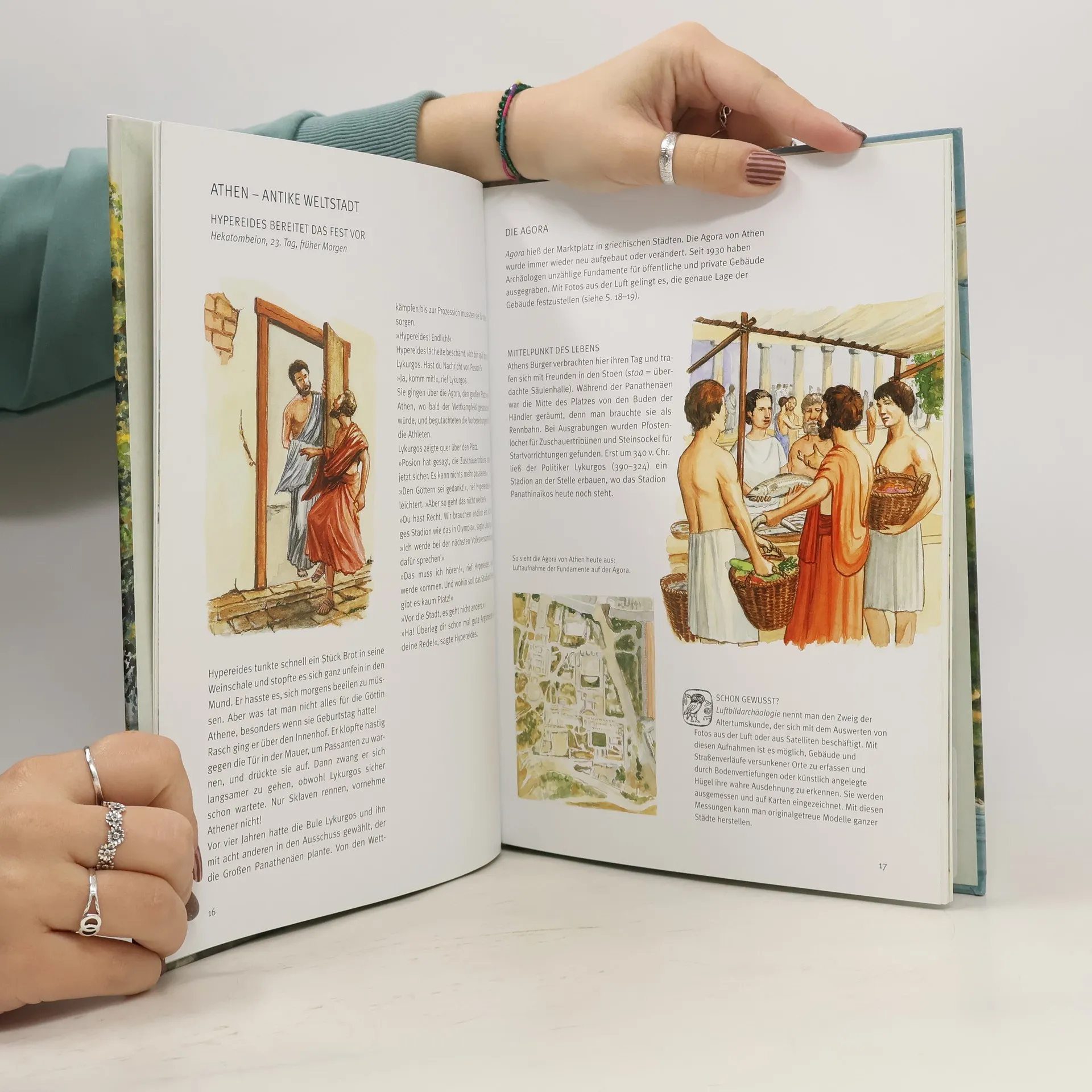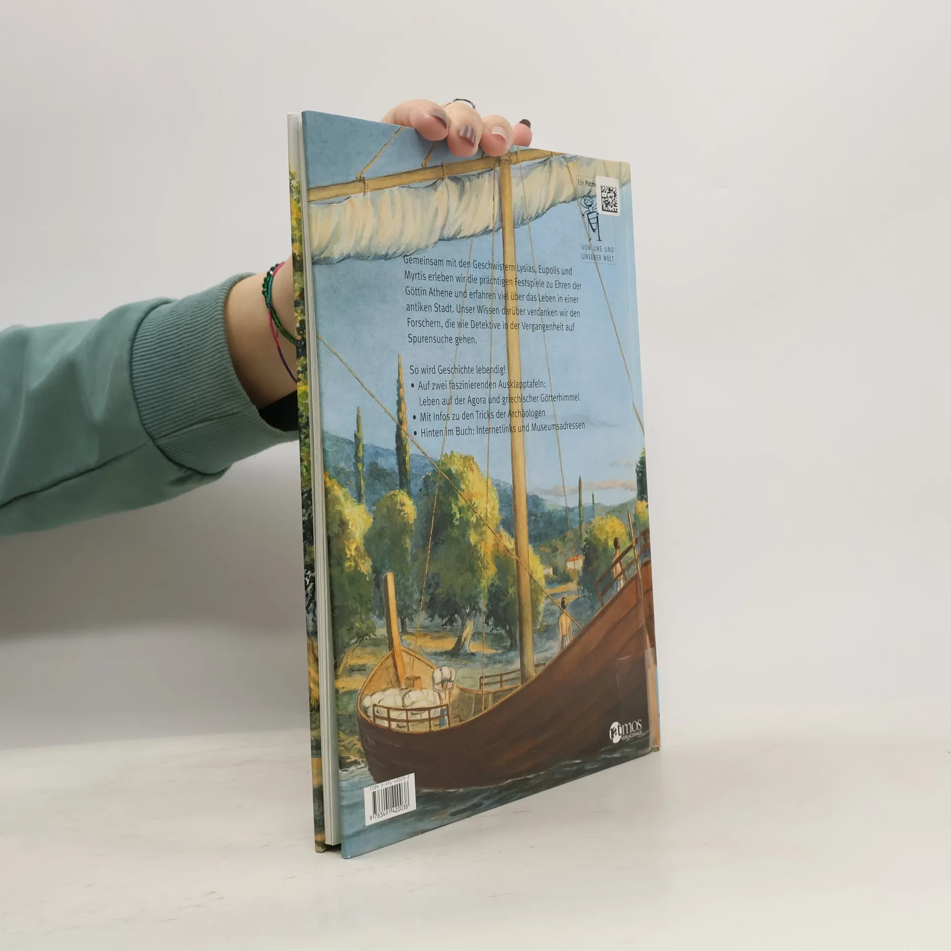 Tempel und Orakel, Athleten und Philosophen – eine Reise in das Alte Griechenland. Wer hat Lust auf eine Reise in die Vergangenheit? Eine durchgehende Geschichte entführt uns in die Antike: Gemeinsam mit Hypereides und seiner Familie erleben wir einen Tag im alten Athen. Die ganze Stadt ist beschäftigt mit den Vorbereitungen für das große Geburtstagsfest der Göttin Athene: Sportwettkämpfe, eine Prozession, ein Festmahl und Konzerte finden zu ihren Ehren statt. Und woher wissen wir, was damals geschah? Hier werden die Tricks der Archäologen verraten, die wie Detektive Scherben und alte Schriften, versunkene Schiffe und Ruinen untersuchen und so Stück für Stück eine vergangene Welt wieder aufleben lassen. Mit zwei prächtigen Ausklapptafeln: Stadtleben im antiken Athen und griechischer Götterhimmel, Internetlinks, alle wichtigen Museumsadressen und Register, Übersichtskarte des antiken Hellas.