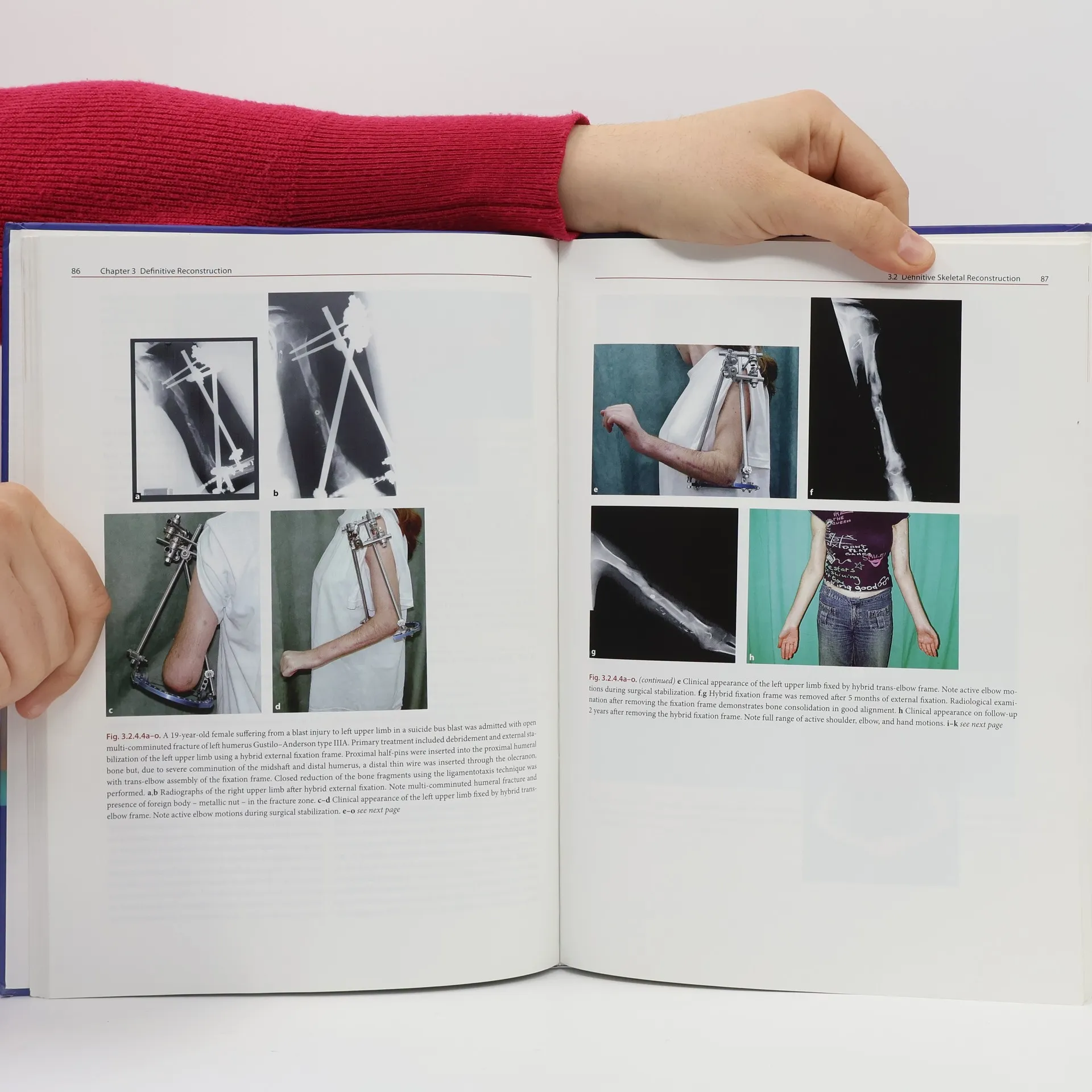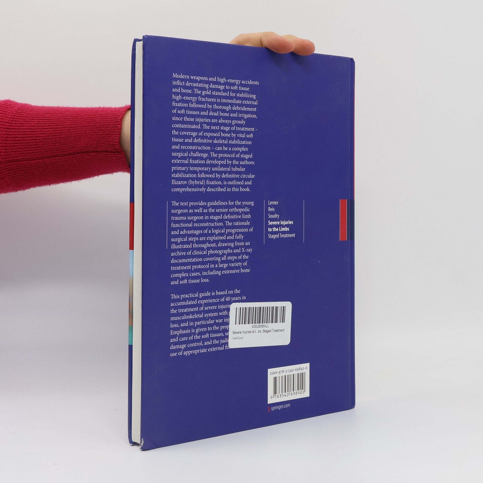 Modern weapons and high-energy accidents cause significant damage to soft tissue and bone, necessitating immediate external fixation and thorough debridement due to contamination. The subsequent treatment phase involves covering exposed bone with vital soft tissue and achieving definitive skeletal stabilization, which poses complex surgical challenges. The authors present a protocol for staged external fixation, beginning with primary temporary unilateral tubular stabilization, followed by definitive circular Ilizarov (hybrid) fixation. This comprehensive guide serves both young and senior orthopedic trauma surgeons in the staged reconstruction of limb function. It details the rationale and advantages of a logical progression of surgical steps, supported by an extensive collection of clinical photographs and X-ray documentation illustrating each treatment phase across various complex cases, including significant bone and soft tissue loss. Drawing on 40 years of experience in managing severe musculoskeletal injuries, particularly war-related trauma, the text emphasizes the importance of soft tissue care, sequential damage control, and the strategic use of external fixation.