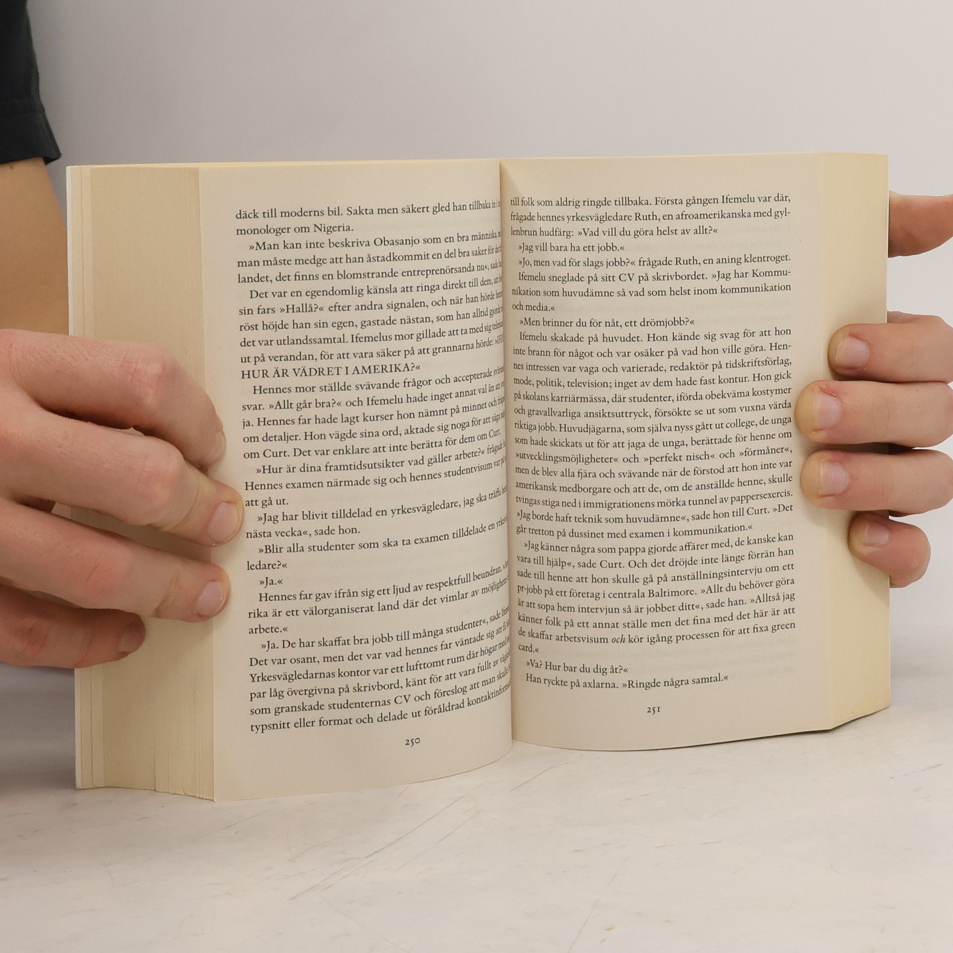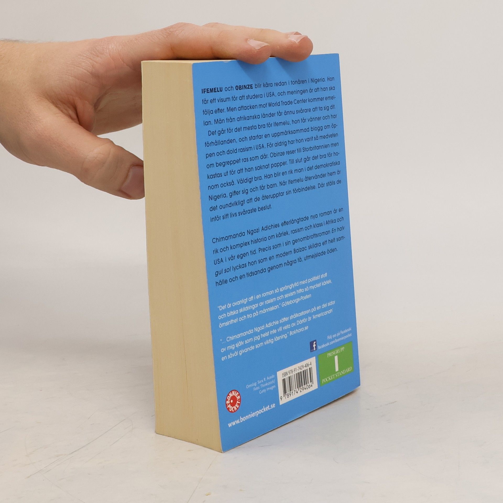 En rik och komplex historia om kärlek, rasism och klass i Afrika och USA Chimamanda Ngozi Adichies efterlängtade nya roman är en rik och komplex historia om kärlek, rasism och klass i Afrika och USA i vår egen tid. Precis som i sin genombrottsroman En halv gul sol lyckas hon som en modern Balzac skildra ett helt samhälle och en tidsanda genom några få, utmejslade öden. Ifemelu och Obinze blir kära redan i tonåren i Nigeria. Hon får ett visum för att studera i USA, och meningen är att han ska följa efter. Men attacken mot World Trade Center kommer emellan. Män från afrikanska länder får ännu svårare att ta sig dit. Det går för det mesta bra för Ifemelu, hon får vänner och har förhållanden, och startar en uppmärksammad blogg om öppen och dold rasism i USA. För aldrig har hon varit så medveten om begreppet ras som där. Obinze reser till Storbritannien men kastas ut för att han saknat papper. Till slut går det bra för honom också. Väldigt bra. Han blir en rik man i det demokratiska Nigeria, gifter sig och får barn. När Ifemelu återvänder hem är det oundvikligt att de återupptar sin förbindelse. Där ställs de inför sitt livs svåraste beslut. "Det är ovanligt att i en roman så sprängfylld med politiskt stoff och bitska skildringar av rasism och sexism hitta så mycket kärlek, ömsinthet och tro på människan." Göteborgs-Posten