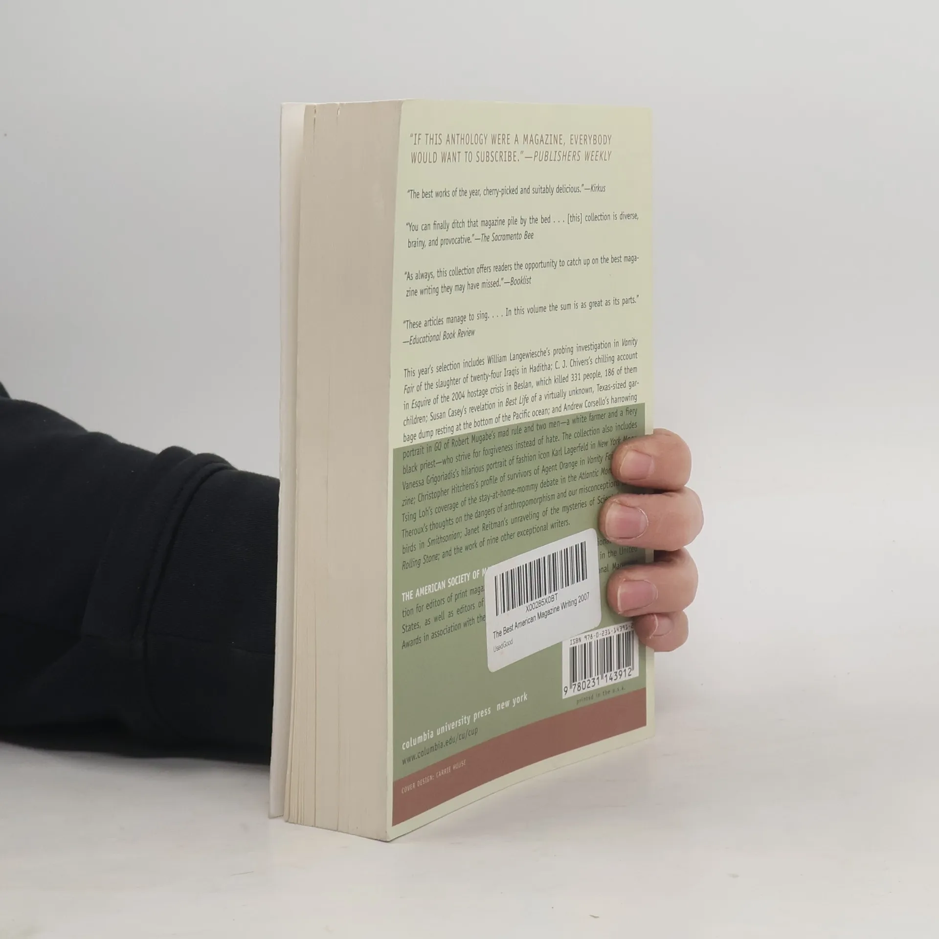 This year's selection includes William Langewiesche's probing investigation in Vanity Fair of the slaughter of twenty-four Iraqis in Haditha; C. J. Chivers's chilling account in Esquire of the 2004 hostage crisis in Beslan, which killed 331 people, 186 of them children; Susan Casey's revelation in Best Life of a virtually unknown, Texas-sized garbage dump resting at the bottom of the Pacific ocean; and Andrew Corsello's harrowing portrait in GQ of Robert Mugabe's mad rule and two men-a white farmer and a fiery black priest-who strive for forgiveness instead of hate. The collection also includes Vanessa Grigoriadis's hilarious portrait of fashion icon Karl Lagerfeld in New York Magazine; Christopher Hitchens's profile of survivors of Agent Orange in Vanity Fair; Sandra Tsing Loh's coverage of the stay-at-home-mommy debate in the Atlantic Monthly; Paul Theroux's thoughts on the dangers of anthropomorphism and our misconceptions about birds in the Smithsonian; Janet Reitman's unraveling of the mysteries of Scientology in Rolling Stone; and the work of nine other exceptional writers.