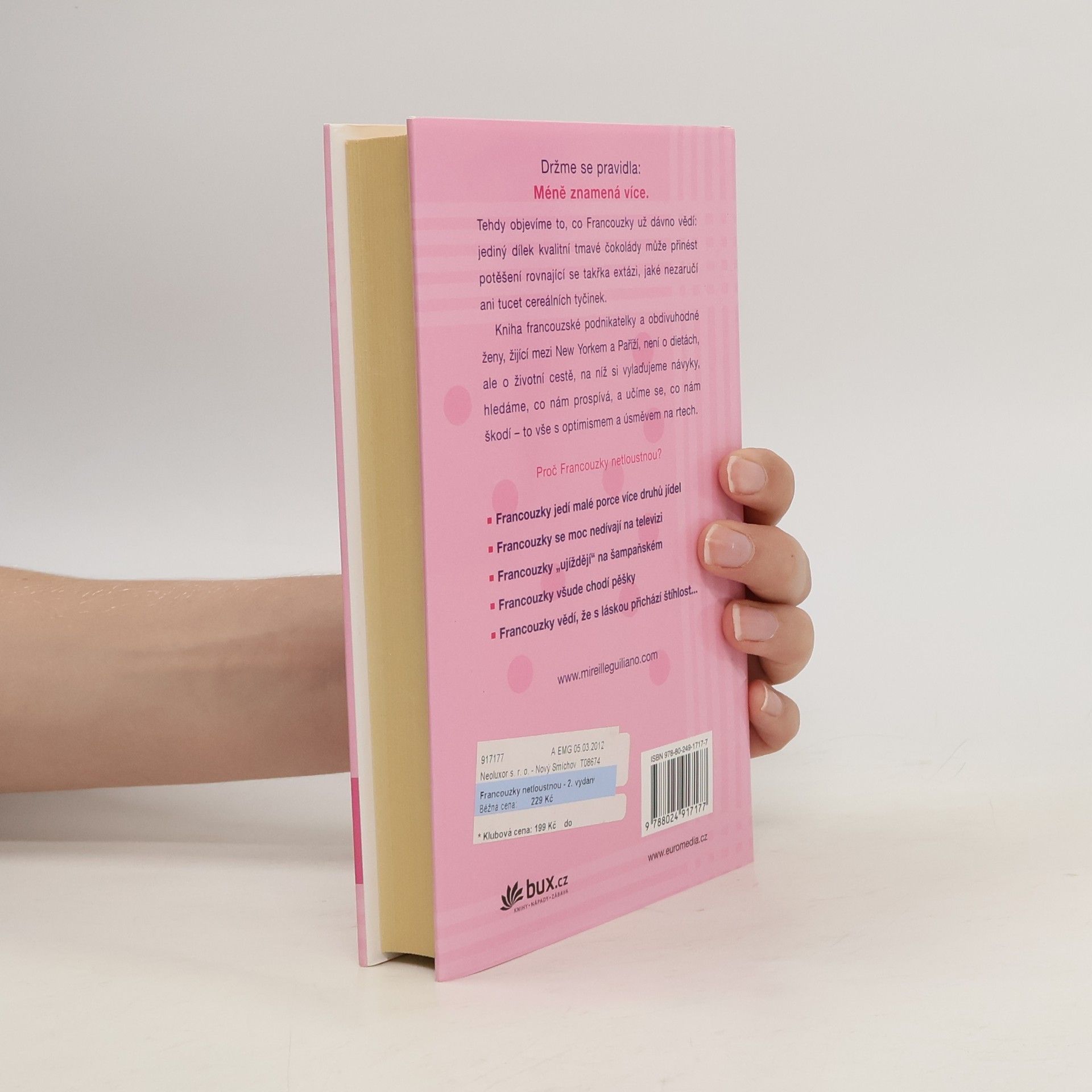 Autorka radí ženám, jak si, podle francouzského vzoru, upravit životosprávu a stravovací návyky a po celý život si udržet ideální hmotnost. Trik spočívá v tom, že nikdy nesmíte hladovět, naopak ke každému jídlu si dopřát několik chodů, ale pouze v malém množství. Občas si můžete dát i kousek svého oblíbeného vysoce kalorického jídla, ale musíte to v brzké době vykompenzovat větší zdrženlivostí. Cílovým pocitem má být uspokojení a radost z jídla, v žádném případě ne strádání. Stravovací návyky je třeba doplnit pitným režimem a pohybovou aktivitou (nikoli však týráním se v tělocvičnách). Dobrý dojem poněkud kalí poznání, že k dosažení uspokojivého výsledku musíte tento nový životní styl praktikovat už do konce života. Součástí textu jsou zajímavé recepty.