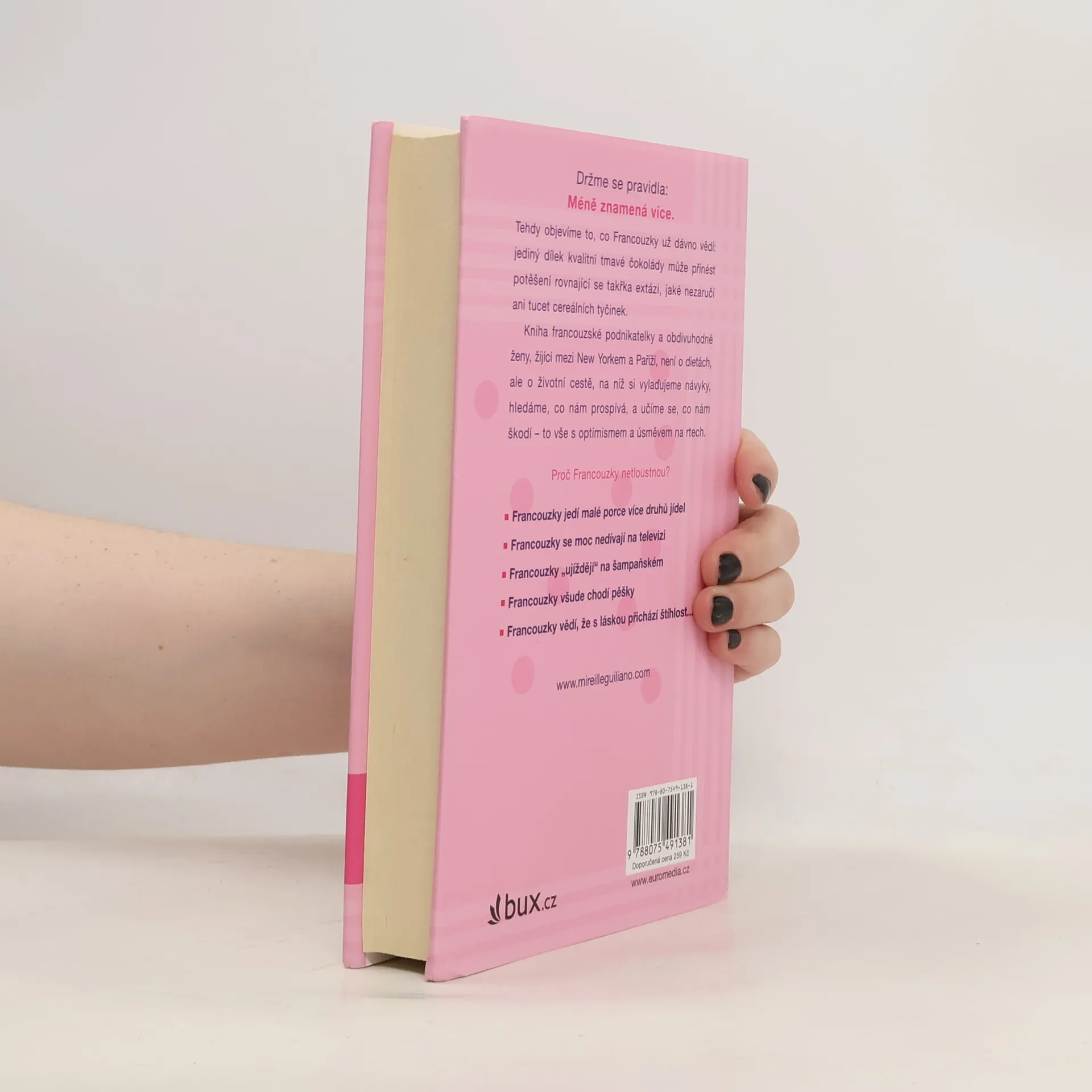 Mireille jednoho dne odjela jako mladá štíhlá studentka do Spojených států a po několika semestrech se vracela do Francie s nebývalou nadváhou. Díky rodinnému lékaři se jí brzy podařilo vrátit k původnímu stylu života - a také vzhledu. Autorka na vlastní zkušenosti odkrývá tajemství francouzského paradoxu, který spočívá v tom, že právě Francouzky, jež jsou známé svým požitkářstvím, zůstávají až do vysokého věku štíhlé a vitální. Nevnucuje čtenářům konkrétní způsob stravování či dodržování jakési módní redukční diety. Poučně, zábavně i rafinovaně se vyznává ze své radosti z jídla i ze života. Učí, jak naslouchat svým potřebám, jak je uspokojovat a vychutnávat s mírou to, co nám každý den i prostřený stůl nabízí. Autorka nezapře svou vášeň pro gastronomii, neboť vyprávění doplňují recepty, mnohé zajímavosti o různých potravinách a spousta triků jak si uchovat získanou štíhlost. Chvílemi k nám promlouvá také jako psycholožka, potom jako lékařka, ale vždy je to žena, která miluje krásu, harmonii pestrých chutí a neodolatelných vůní a jež si málokdy odepře potěšení z pečiva, čokolády a šampaňského. Netýrejme se "zaručenými" dietami, ale naučme se hýčkat tak, abychom byli zdraví, šťastní, usměvaví a neztráceli energii.