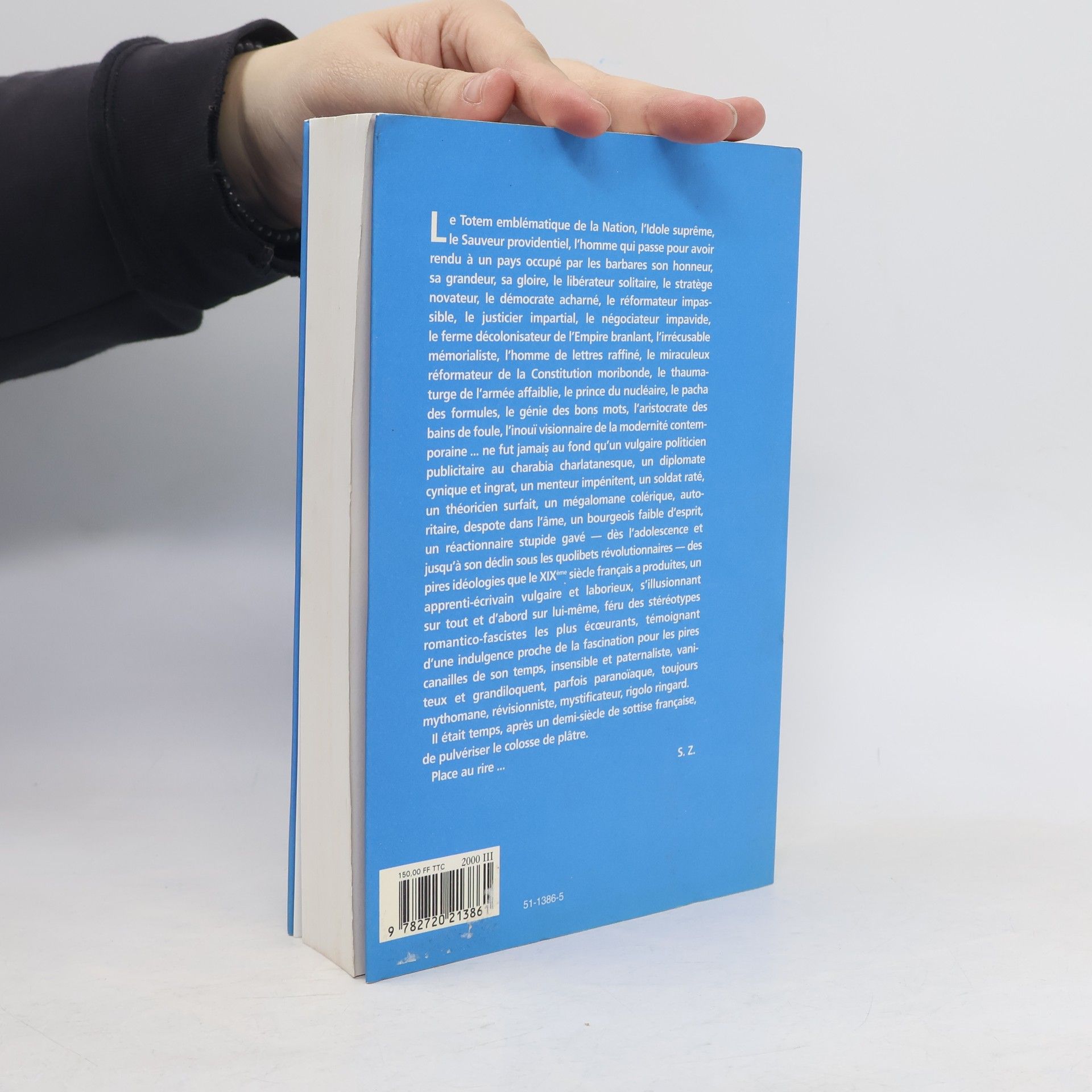 L e Totem emblématique de la Nation, l'Idole suprême, le Sauveur providentiel, l'homme qui passe pour avoir rendu à un pays occupé par les barbares son honneur, sa grandeur, sa gloire, le libérateur solitaire, le stratège novateur, le démocrate acharné, le réformateur impassible, le justicier impartial, le négociateur impavide, le ferme décolonisateur de l'Empire branlant, l'irrécusable mémorialiste, l'homme de lettres raffiné, le miraculeux réformateur de la Constitution moribonde, le thaumaturge de l'armée affaiblie, le prince du nucléaire, le pacha des formules, le génie des bons mots, l'aristocrate des bains de foule, l'inouï visionnaire de la modernité contemporaine ... ne fut jamais au fond qu'un vulgaire politicien publicitaire au charabia charlatanesque, un dipiomate cynique et ingrat, un menteur impénitent, un soldat raté, un théoricien surfait, un mégalomane colérique, autoritaire, despote dans l'âme, un bourgeois faible d'esprit, un réactionnaire stupide gavé - dès l'adolescence et jusqu'à son déclin sous les quolibets révolutionnaires - des pires idéologies que le XIXe siècle français a produites, un apprenti-écrivain vulgaire et laborieux, s'illusionnant sur tout et d'abord sur lui-même, féru des stéreotypes romantico-fascistes les plus écoeurants, témoignant d'une indulgence proche de la fascination pour les pires canailles de son temps, insensible et paternaliste, vanteux et grandiloquent, parfois paranoïaque, toujours mythomane, révisionniste, mystificateur, rigolo ringard.Il était temps, après un demi-siècle de sottise française, de pulvériser le colosse de plâtre.Place au rire ... S.Z.