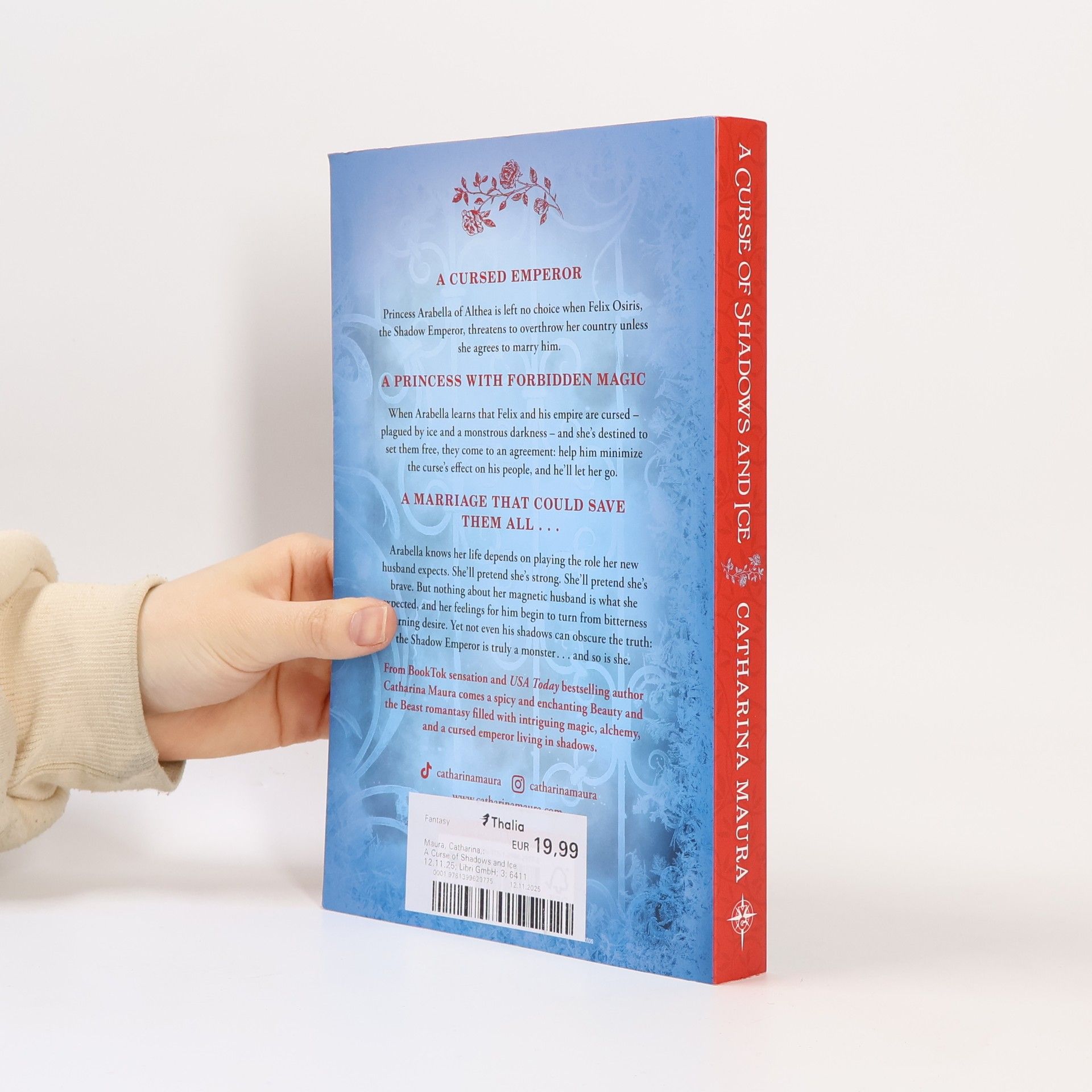 FROM BOOKTOK SENSATION AND USA TODAY BESTSELLING AUTHOR CATHARINA MAURA COMES A DARK ROMANTASY BEAUTY AND THE BEAST RETELLING... **** A CURSED EMPEROR Princess Arabella of Althea is left no choice when Felix Osiris, the fearsome Shadow Emperor known for his deadly powers and his thirst for conquest, threatens to overthrow her home unless she agrees to marry him. A PRINCESS WITH FORBIDDEN MAGIC When she learns that he and his empire are plagued by ice and a monstrous darkness and she's been prophesized to set them free, they come to an agreement: help him minimize the curse's effect on his people, and he'll let her go. A MARRIAGE THAT COULD SAVE THEM ALL... As Felix teaches Arabella how to control her forbidden and volatile magic, her feelings for him turn from hatred to passion... and she realizes that she must break the curse or she'll forever lose him and everyone they love to the ice and shadows. **** READERS LOVE A CURSE OF SHADOWS AND ICE 'I totally loved this book... I couldn't put the book down it's so well written. Loved it!'⭐⭐⭐⭐⭐ 'Beautiful, heartfelt, dark and dangerous at times, these two (Arabella and Felix) had a fiery passion and electric chemistry'⭐⭐⭐⭐⭐ 'Best book I have read in a while, totally engrossing'⭐⭐⭐⭐⭐