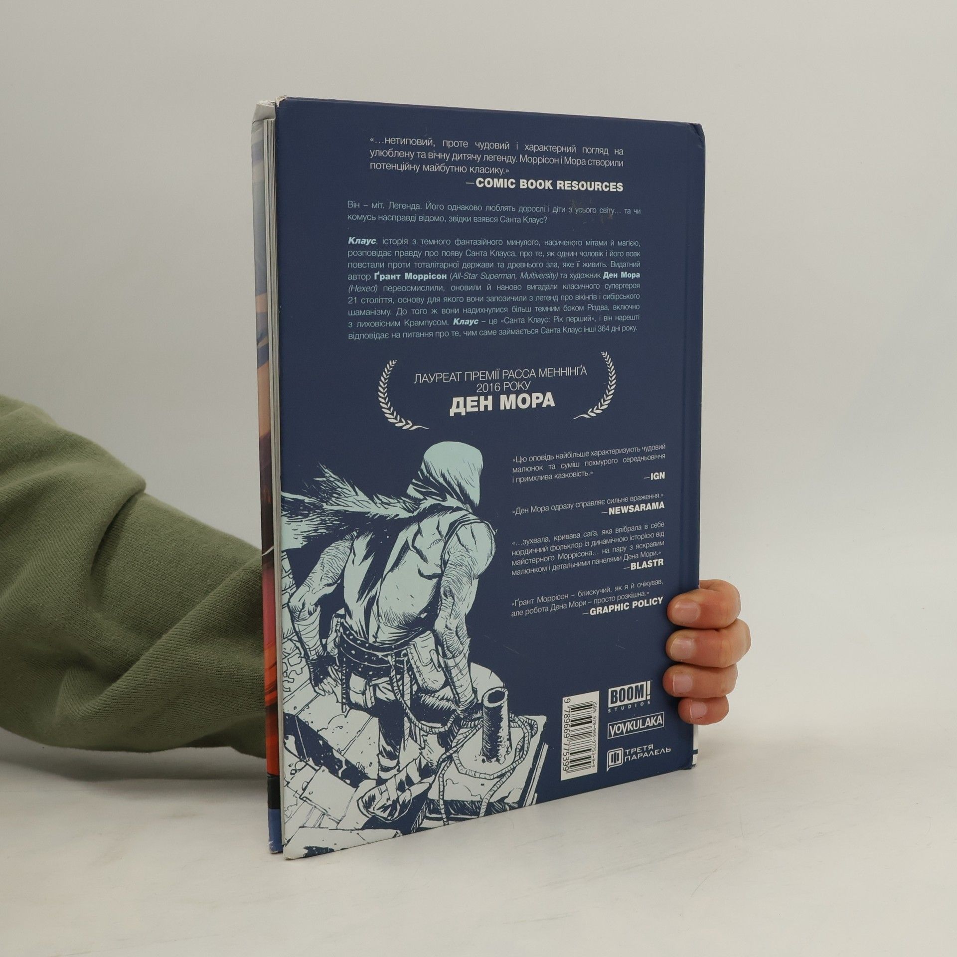 Він міф. Він легенда. Його люблять у всьому світі діти і дорослі … але чи справді хтось знає походження Святого Миколая? Із темного фантастичного минулого, сповненого міфів та магії, Клаус розповідає історію про те, як насправді став Святим Миколаєм – казку про одну людину та його вовка проти тоталітарної держави та давнього лиха, яке її підтримує. Автор – неймовірний Ґрант Моррісон і художник Ден Мора переосмислюють, винаходять і знов переосмислюють класичного супергероя ХХІ століття, спираючись на коріння Санта Клауса, епос вікінгів, сибірський шаманізм, щоб відповісти на головне питання всесвіту – чим же займаєтся Миколай решту 364 днів на рік?