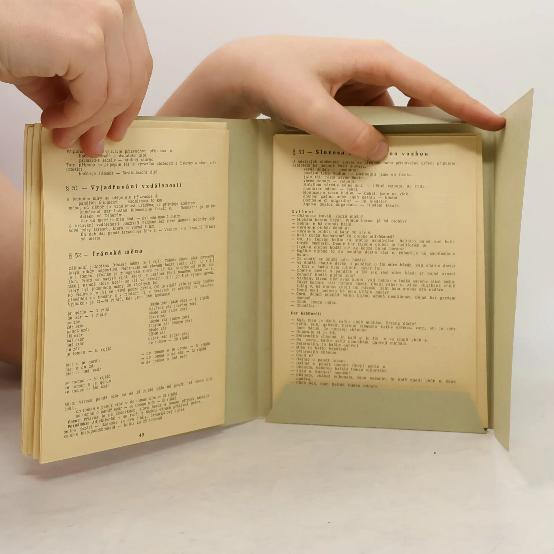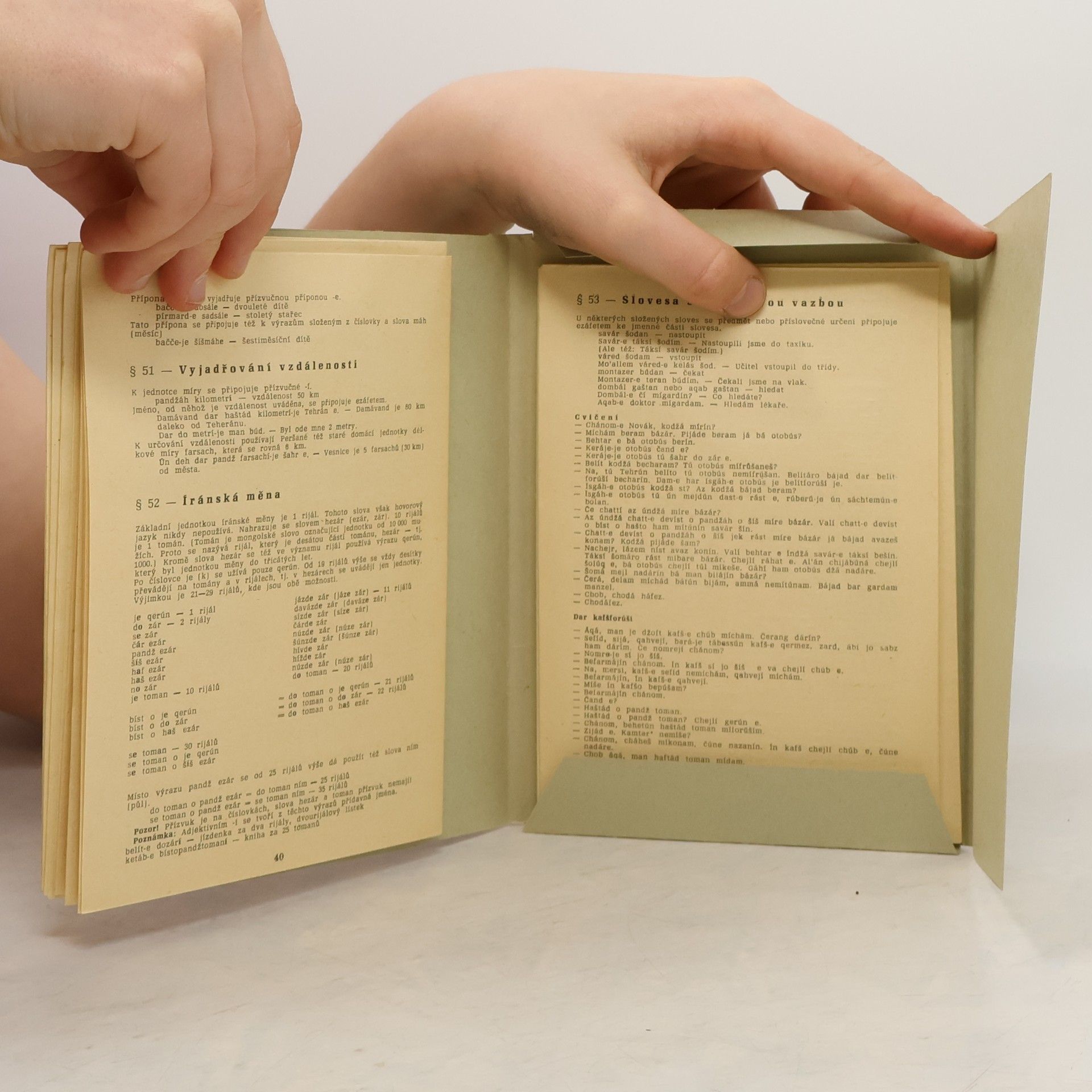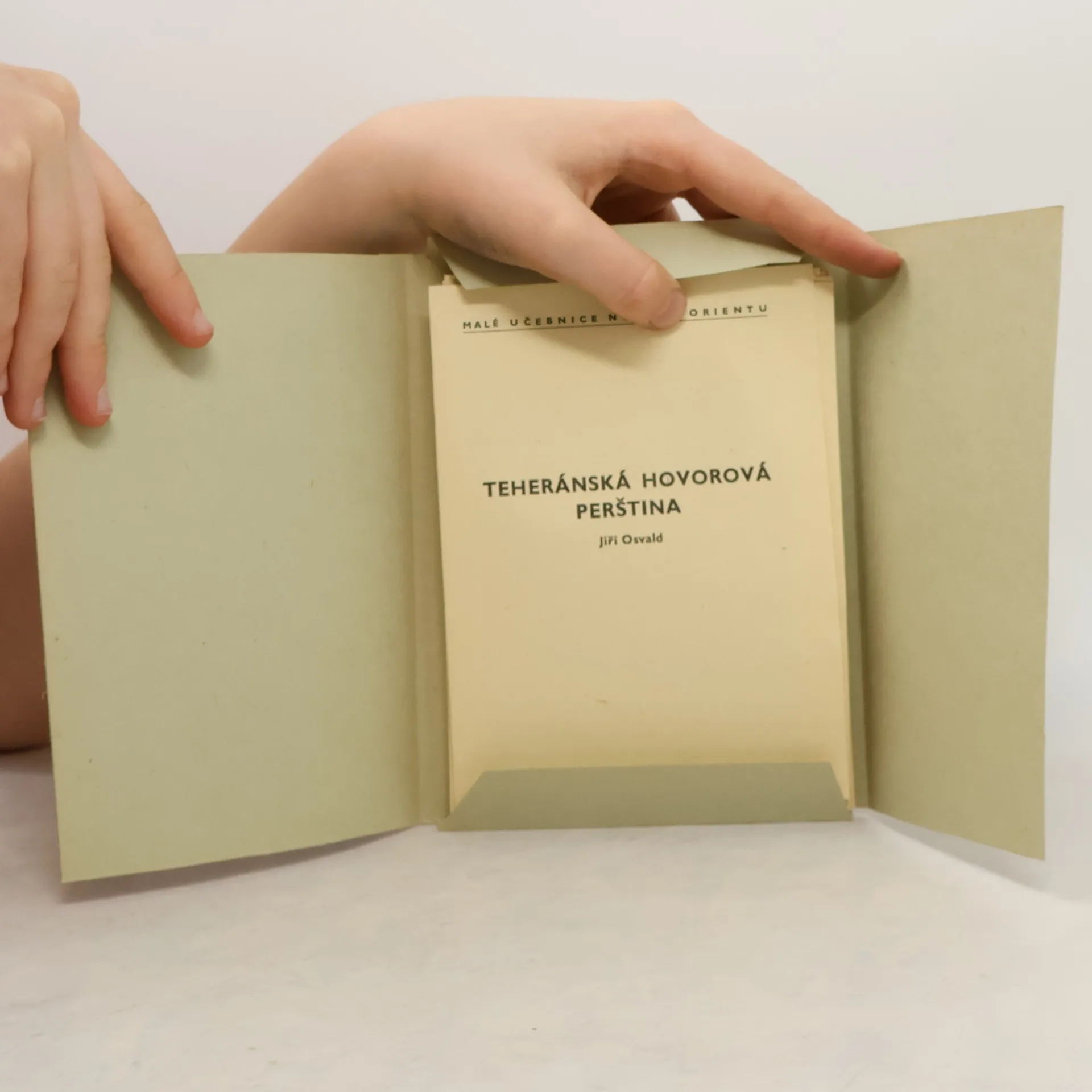 Malá učebnice praktického charakteru chce pomoci českým technikům, obchodníkům a diplomatům v situacích, kdy ve styku s Íránci nebudou moci uplatnit některý světový jazyk. V 15 lekcích zachycuje téměř všechny gramatické tvary a uvádí 700 slovíček a frazeologických obratů z teheránskéhovorové perštiny, přičemž cvičné věty jsou co do tématu z oblasti nákupu, cestování, městské dopravy, domácích záležitostí apod. Brožuru doplňuje Klíč k překladům z češtiny do perštiny a 3 přílohy seznamující s arabským písmem, s nápisy na dopravních značkách apod. a s termíny označujícími příbuzenské vztahy.