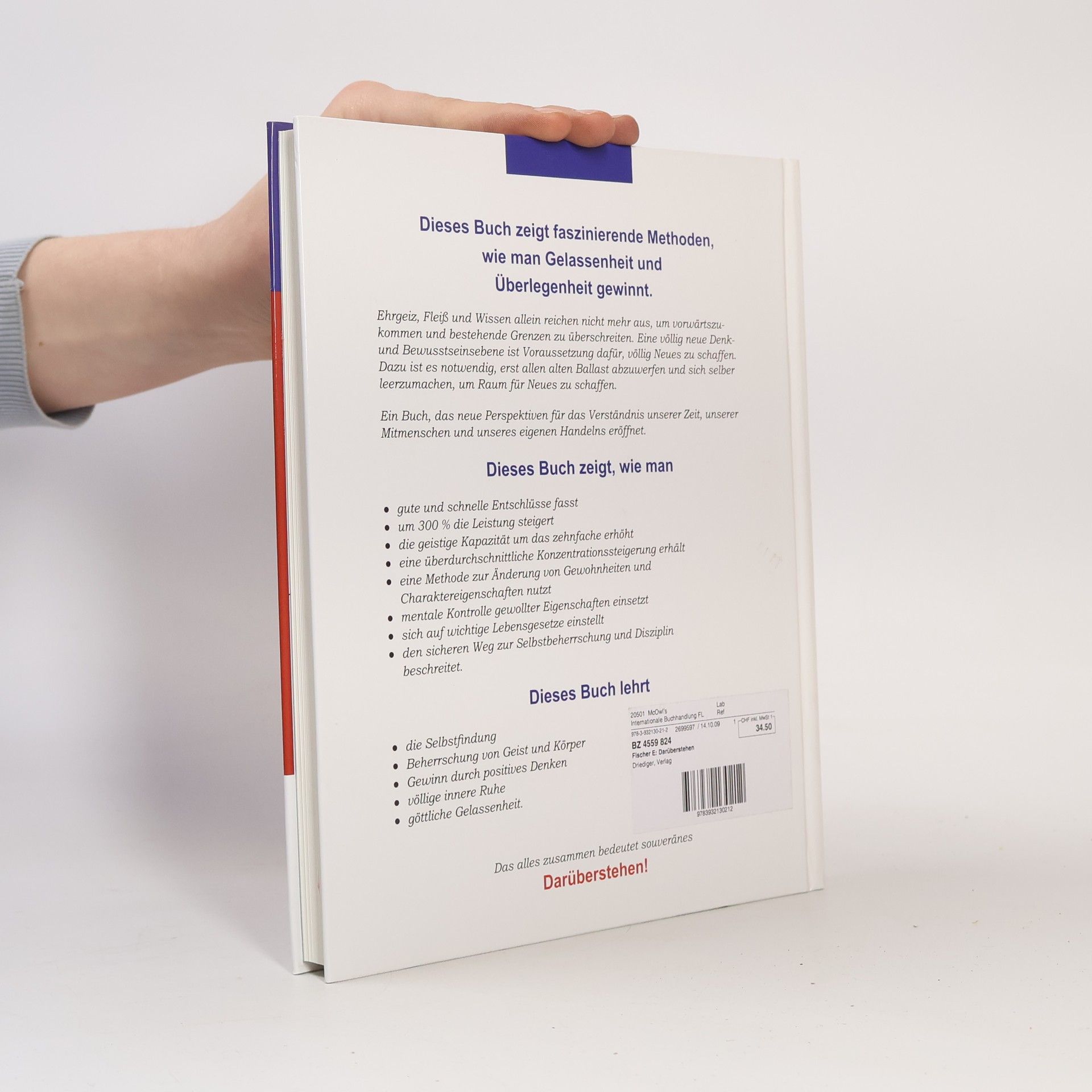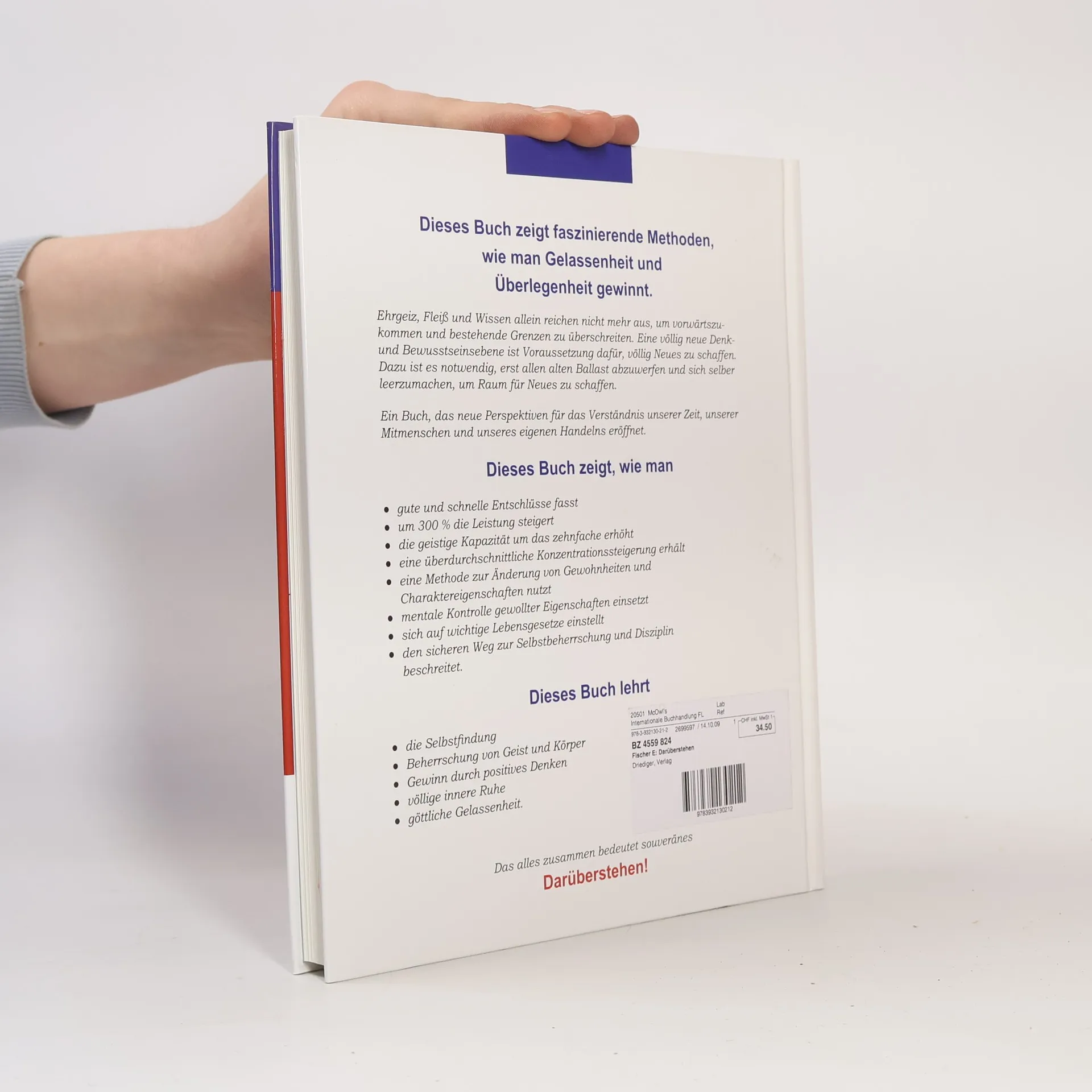 Dieses Buch zeigt faszinierende Methoden, wie man Gelassenheit und Überlegenheit gewinnt. Ehrgeiz, Fleiß und Wissen allein reichen nicht mehr aus, um vorwärtszukommen und bestehende Grenzen zu überschreiten. Eine völlig neue Denk- und Bewusstseinsebene ist Voraussetzung dafür, völlig Neues zu schaffen. Dazu ist es notwendig, erst allen alten Ballast abzuwerfen und sich selber leerzumachen, um Raum für Neues zu schaffen. Ein Buch, das neue Perspektiven für das Verständnis unserer Zeit, unserer Mitmenschen und unseres eigenen Handelns eröffnet. Dieses Buch zeigt, wie man - gute und schnelle Entschlüsse fasst - um 300 % die Leistung steigert - die geistige Kapazität um das zehnfache erhöht - eine überdurchschnittliche Konzentrationssteigerung erhält - eine Methode zur Änderung von Gewohnheiten und Charaktereigenschaften nutzt - mentale Kontrolle gewollter Eigenschaften einsetzt - sich auf wichtige Lebensgesetze einstellt - den sicheren Weg zur Selbstbeherrschung und Disziplin beschreitet. Das alles zusammen bedeutet souveränes Darüberstehen!
