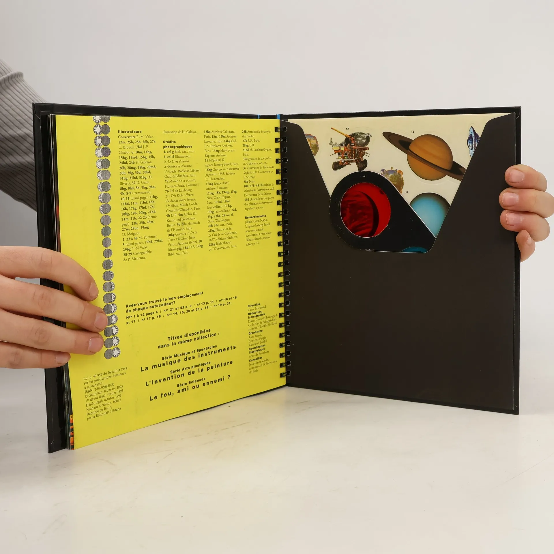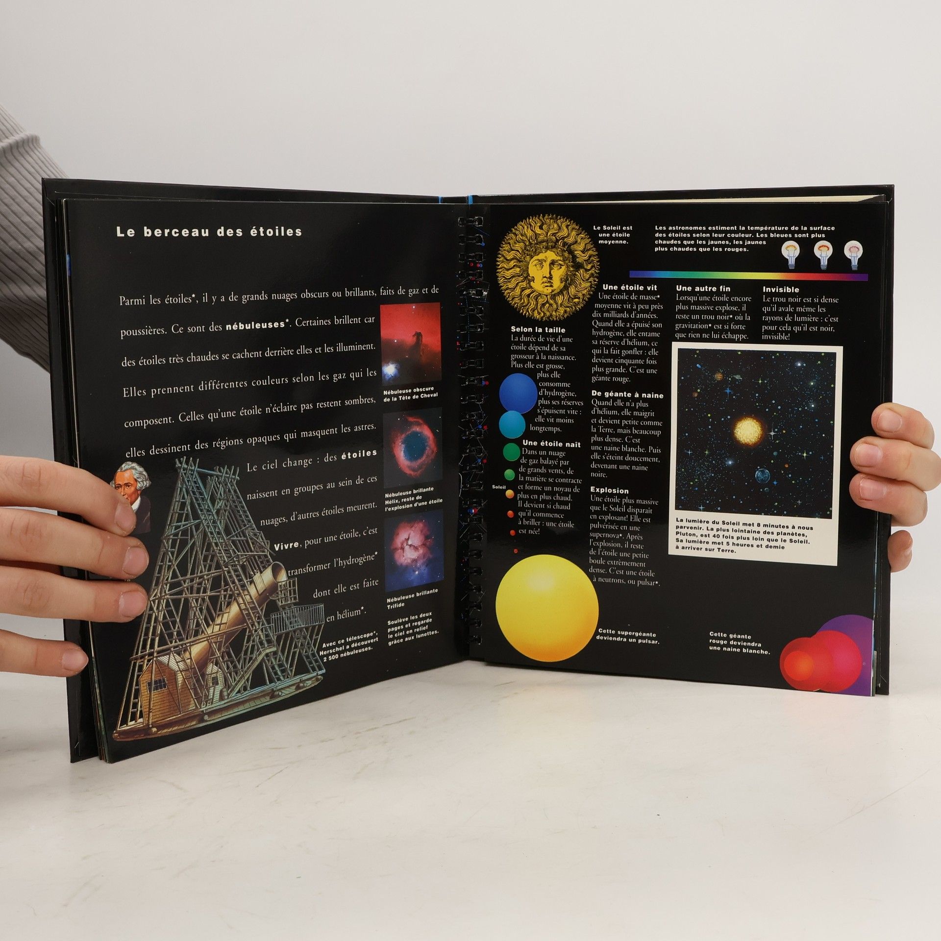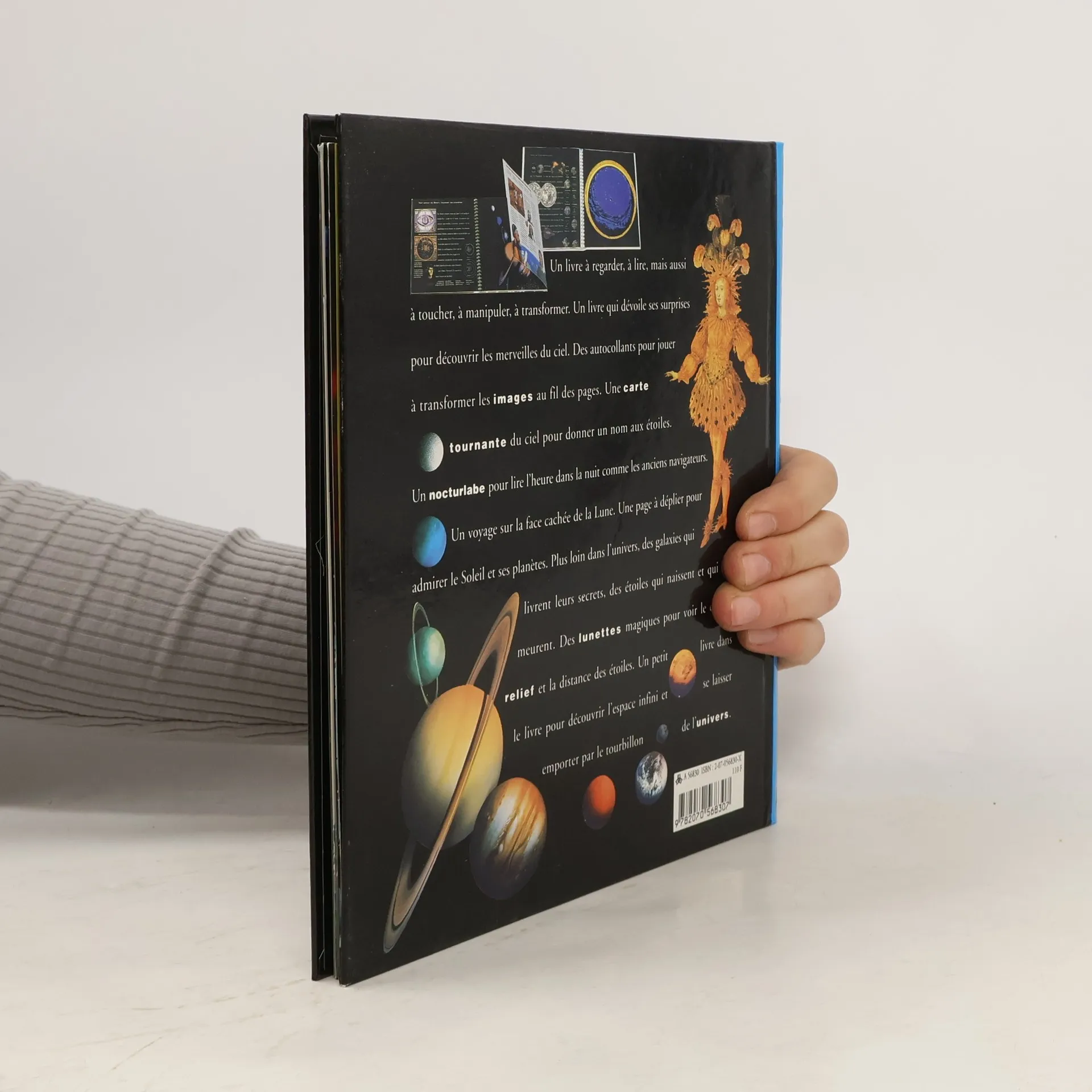 Un livre qui dévoile ses surprises pour découvrir les merveilles du ciel. Des autocollants pour jouer à transformer les images au fil des pages. Une carte tournante du ciel pour donner un nom aux étoiles. Un nocturlabe pour lire l'heure dans la nuit comme les anciens navigateurs. Un voyage sur la face cachée de la Lune. Une page à déplier pour admirer le Soleil et ses planètes. Plus loin dans l'univers, des galaxies qui livrent leurs secrets, des étoiles qui naissent et qui meurent. Des lunettes magiques pour voir le ciel en relief et la distance des étoiles. Un petit livre dans le livre pour découvrir l'espace infini et se laisser emporter par le tourbillon de l'univers.