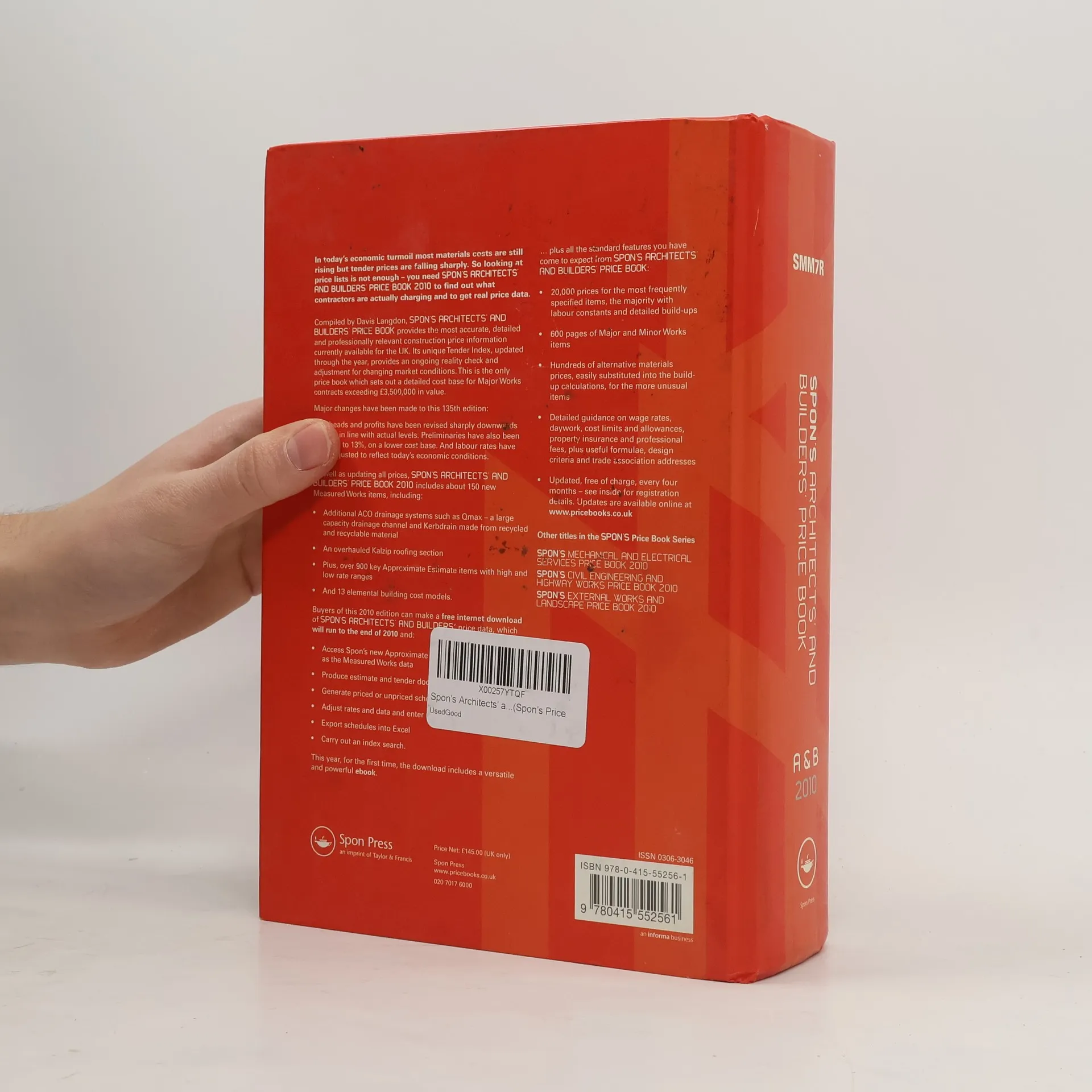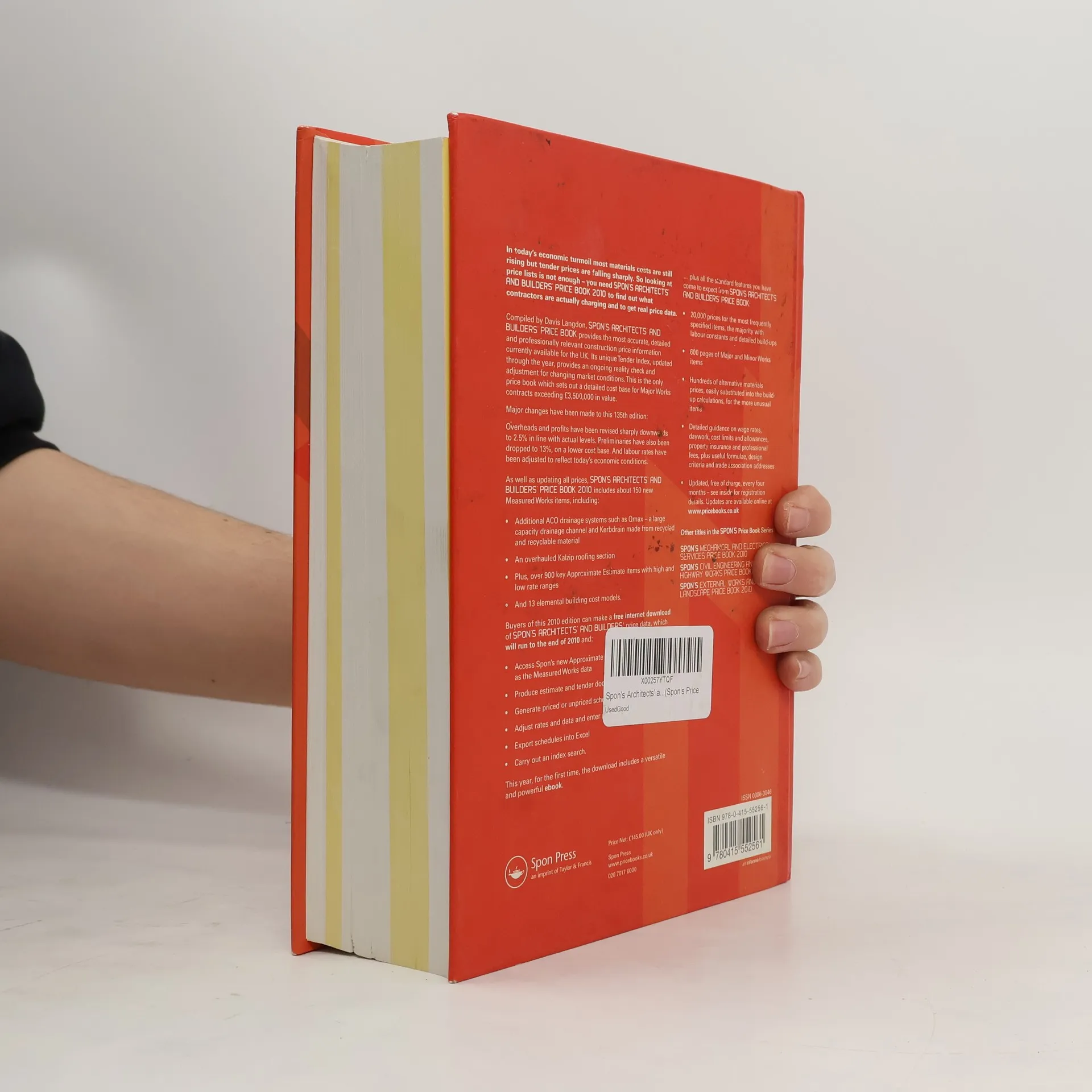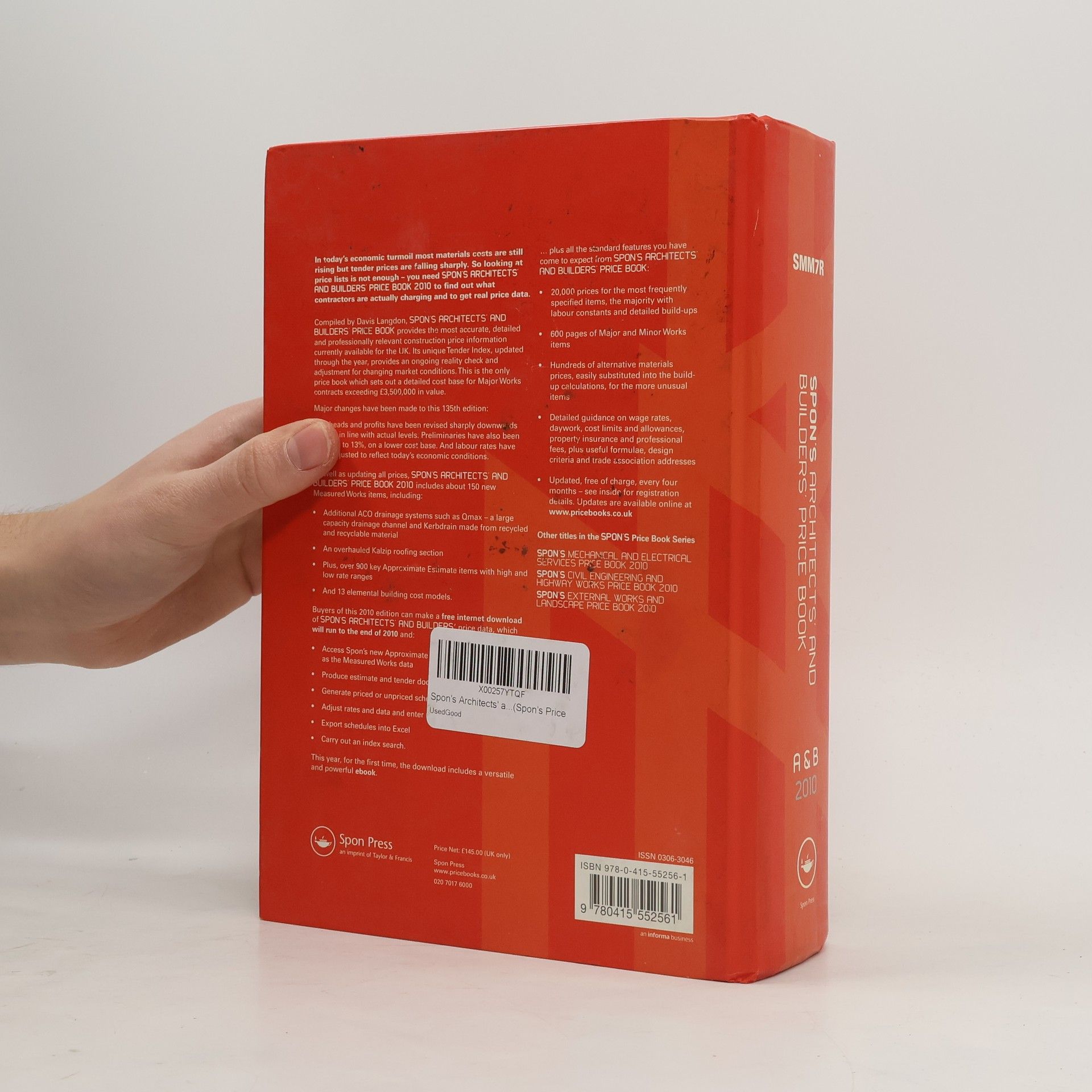 In today s economic turmoil most materials costs are still rising but tender prices are falling sharply. So looking at price lists is not enough you need Spon s Architects and Builders Price Book 2010 to find out what contractors are actually charging and to get for real price data.Compiled by Davis Langdon, Spon s Architects and Builders Price Book provides the most accurate, detailed and professionally relevant construction price information currently available for the UK. Its unique Tender Index, updated through the year, provides an ongoing reality check and adjustment for changing market conditions. This is the only price book which sets out a detailed cost base for Major Works contracts exceeding 3,500,000 in value.Major changes have been made to this 135th edition:Overheads and profits have been revised sharply downwards to 2.5% in line with actual levels. Preliminaries have also been dropped to 13%, on a lower cost base. And labour rates have been adjusted to reflect today s economic conditions.As well as updating all prices, Spon s Architects and Builders Price Book 2010 includes about 150 new Measured Works items, including:Additional ACO drainage systems such as Qmax a large capacity drainage channel and Kerbdrain made from recycled and recyclable materialAn overhauled Kalzip roofing sectionPlus, over 900 key Approximate Estimate items with high & low rate rangesAnd 13 elemental building cost modelsBuyers of this 2010 edition can make a free internet download of Spon s Architects and Builders price data, which will run to the end of 2010 and:Access Spon s new Approximate Estimates rate data, as well as the Measured Works dataProduce estimate and tender documentsGenerate priced or unpriced schedulesAdjust rates and data and enter rogue itemsExport schedules into ExcelCarry out an index searchThis year, for the first time, the download includes a versatile and powerful ebook.plus all the standard features you have come to expect from Spon s Architects and Builders Price Book20,000 prices for the most frequently specified items, the majority with labour constants and detailed build-ups600 pages of Major and Minor Works itemsHundreds of alternative materials prices, easily substituted into the build-up calculations, for the more unusual itemsDetailed guidance on wage rates, daywork, cost limits and allowances, property insurance and professional fees, plus useful formulae, design criteria and trade association addressesUpdated, free of charge, every four months see insider for registration details. Updates are available online at www.pricebooks.co.uk