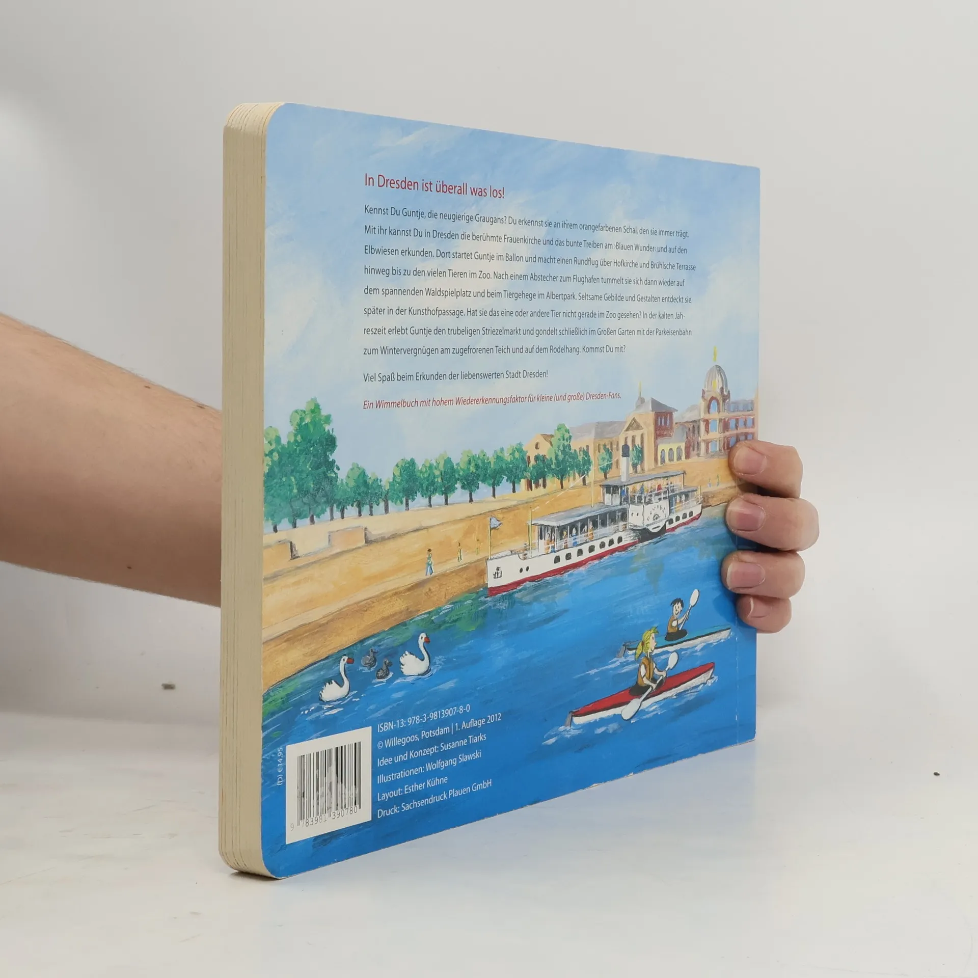 In Dresden ist überall etwas los! In diesem liebevoll illustrierten Wimmelbuch können Kinder zusammen mit der neugierigen Graugans Guntje die reizende Stadt Dresden einmal quer durch alle Jahreszeiten entdecken. Der Bilderbogen spannt sich vom Frühlingserwachen am Blauen Wunder und vor der Frauenkirche über Ansichten vom Zoo bis hin zum Flughafen. Sommerliches Treiben zeigen die Bilder von den Elbwiesen und der Hofkirche mit der Brühlschen Terrasse. Im Herbst geht’s auf dem Abenteuerspielplatz im Albertpark zu und winterlich wird’s auf dem Striezelmarkt oder beim Schneevergnügen im Großen Garten. Auf den Abbildungen der Originalschauplätze mit hohem Wiedererkennungswert machen kleine und große Dresdner und ihre Gästen immer wieder neue spannende und witzige Entdeckungen. Viele Erzählanlässe und für Dresden typische Einzelheiten machen das Buch auch nach vielen Betrachtungen noch interessant und fördern Sprachkompetenz und Konzentration der kleinen Stadtentdecker. Ein Stadtplan, der zeigt, wo die Szenen zu finden sind, rundet das Bilderbuch ab.