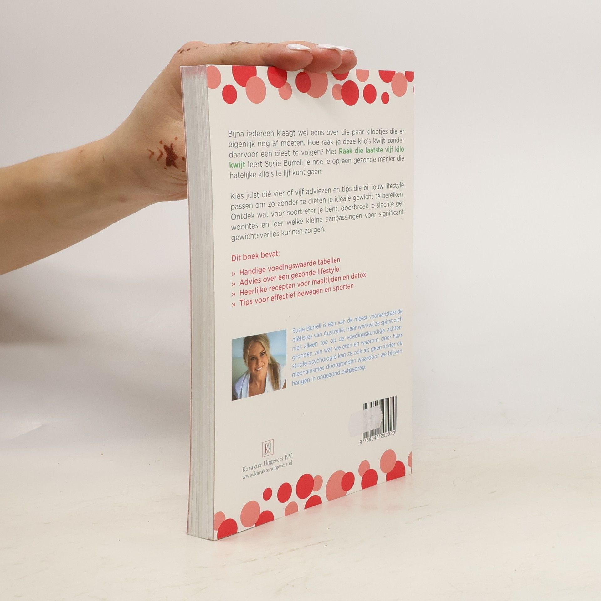 Bijna iedereen klaagt wel eens over die paar kilootjes die er eigenlijk nog af moeten. Hoe raak je deze kilo's kwijt zonder daarvoor een dieet te volgen? Met Raak die laatste 5 kilo kwijt leert Susie Burrell je hoe je op een gezonde manier die hatelijke kilo's te lijf kunt gaan. Kies juist díé vier of vijf adviezen en tips die bij jouw lifestyle passen om zo zonder te diëten je ideale gewicht te bereiken. Ontdek wat voor soort eter je bent, doorbreek je slechte gewoontes en leer welke kleine aanpassingen voor significant gewichtsverlies kunnen zorgen. Dit boek bevat: - Handige voedingswaarde tabellen - Advies over een gezonde lifestyle - Heerlijke recepten voor maaltijden en detox - Tips voor effectief bewegen en sporten.