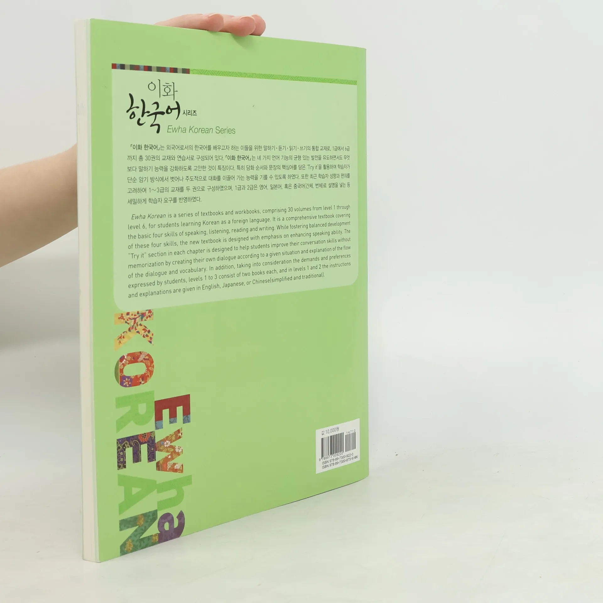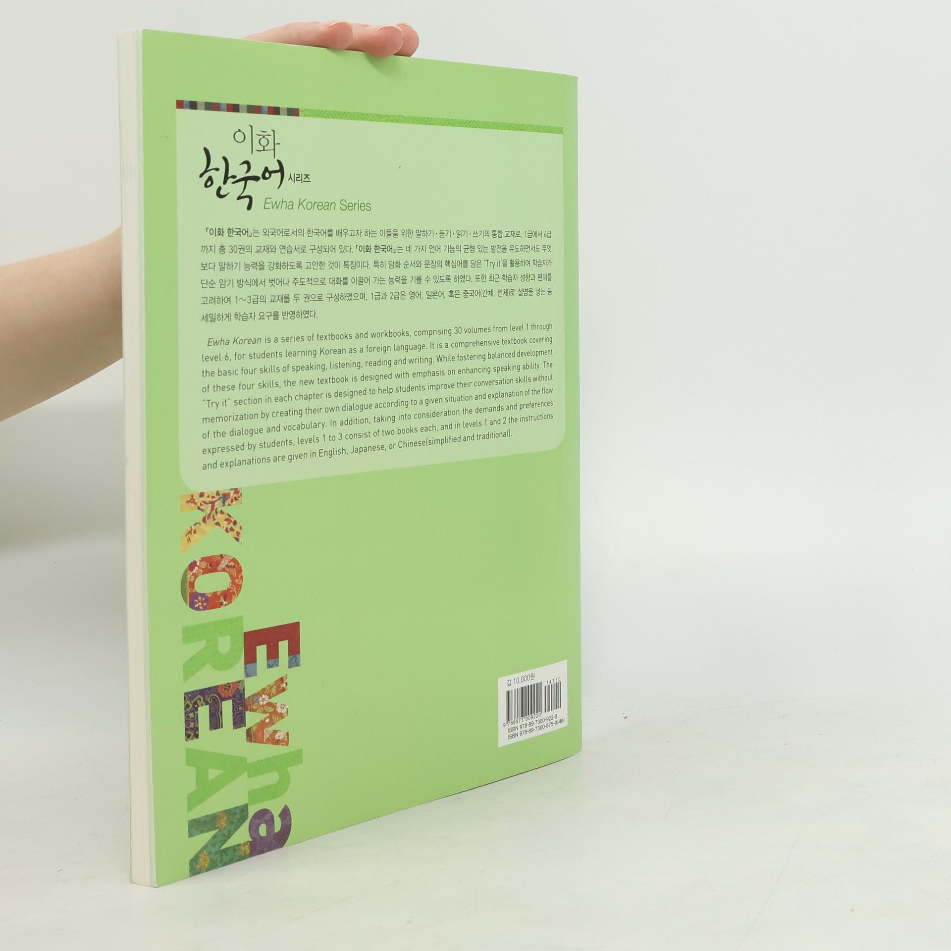 Ewha Korean is a series of textbooks and workbooks, comprising 26 volumes from level 1 through level 6, for students learning Korean as a foreign language. It is a comprehensive textbook covering the basic four skills of speaking, listening, reading and writing. While fostering balanced development of these four skills, the new textbook is designed with an emphasis on enhancing speaking ability. The "Try it" section in each chapter is designed to help students improve their conversation skills without memorization by creating their own dialogue according to a given situation and explanation of the flow of the dialogue and vocabulary. In addition, taking into consideration the demands and preferences expressed by students
