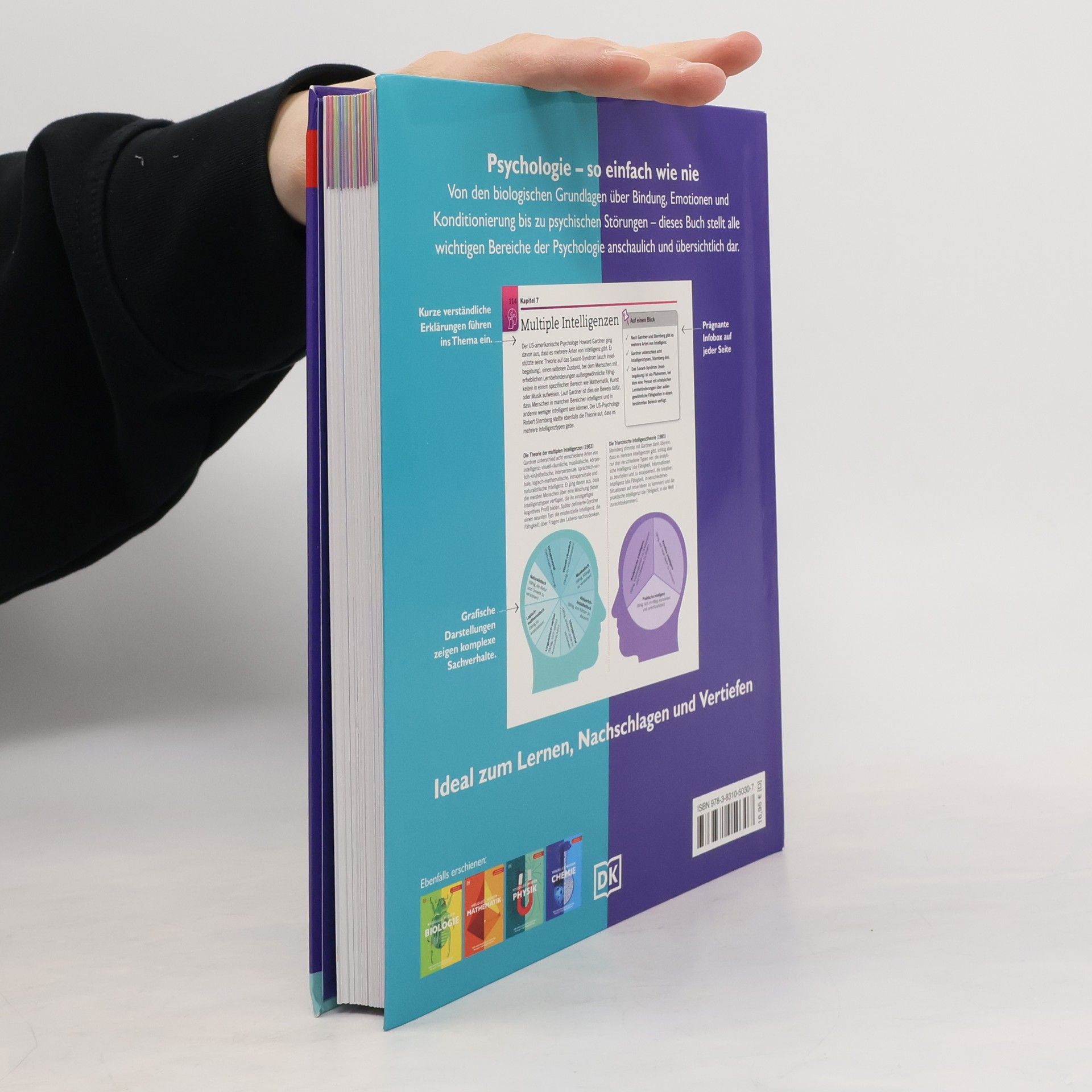 Die Grundlagen der Psychologie - einzigartig visuell aufbereitet • Psychologie einfach erklärt : Ein kompakter Einstieg in ein komplexes Thema • Fundierte Antworten auf wichtige Fragen: Wo verarbeiten wir Emotionen? Wie entstehen Depressionen ? Welche psychischen Störungen gibt es? • Anschaulich aufbereitet mit verständlichen Texten und ansprechenden Grafiken • Von Entwicklungs - bis Kriminalpsychologie : Ein fundierter Überblick in 17 Kapiteln Psychologie für Anfänger*innen Egal, ob wir Entscheidungen treffen oder mit anderen Menschen interagieren - unsere Psyche ist immer mit im Spiel. Dieses umfassende und leicht verständliche Buch enthält die Grundlagen der Psychologie und gibt Ihnen einen fundierten Überblick über die ganze Breite des Fachgebietes. Von Bindungsangst über bipolare Störungen bis hin zur Positiven Psychologie : In 17 Kapiteln werden alle wesentlichen Bereiche der Psychologie kompakt und strukturiert auf 1-2 Seiten dargestellt. Mit prägnanten Texten und ansprechenden Grafiken wird die komplexe Welt der Psychologie einfach erklärt . Visuelles Wissen: Psychologie eignet sich hervorragend für alle, die sich mit der Psychologie des Menschen vertraut machen möchten und eine anschauliche Einstiegslektüre suchen. Das kompakte Psychologie-Nachschlagewerk zum Lernen und Verstehen Dieses Buch ist ein Teil der DK-Erfolgsreihe „Visuelles Wissen“.