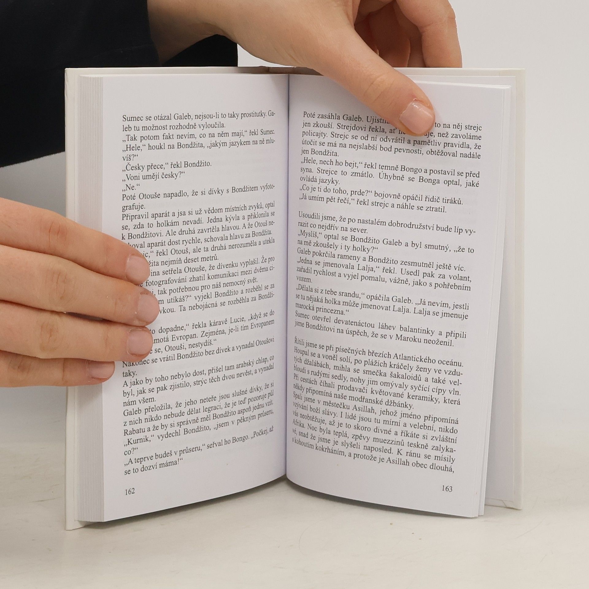 Vzduch se třepetal horkem pořád víc a víc a jediné, čemu se v tom kraji přeludů dalo věřit, byla skutečnost, že tady, mezi Vysokým Atlasem a Antiatlasem ocitla se Bílá příšera na nejjižnějším bodě svého kovového života. Bongo ji poplácal po volantu a obrátil k nejvyšším horám na severu. - Potom jsme se opojeni, dojati i vystrašeni dlouhé hodiny vznášeli nad barevnými propastmi. Shlíželi jsme na kužele a mamutí hřbety všech tvarů: kopce hnědé, fialové, černé a jásavě hnědé, ba i zelené, nikoli však od trávy, nýbrž od barvy kamení. Pluli jsme ve výšinách, jako by Bílá příšera byla ptákem a kroužila podél kolmých stěn, na levoboku svobodného povětří.