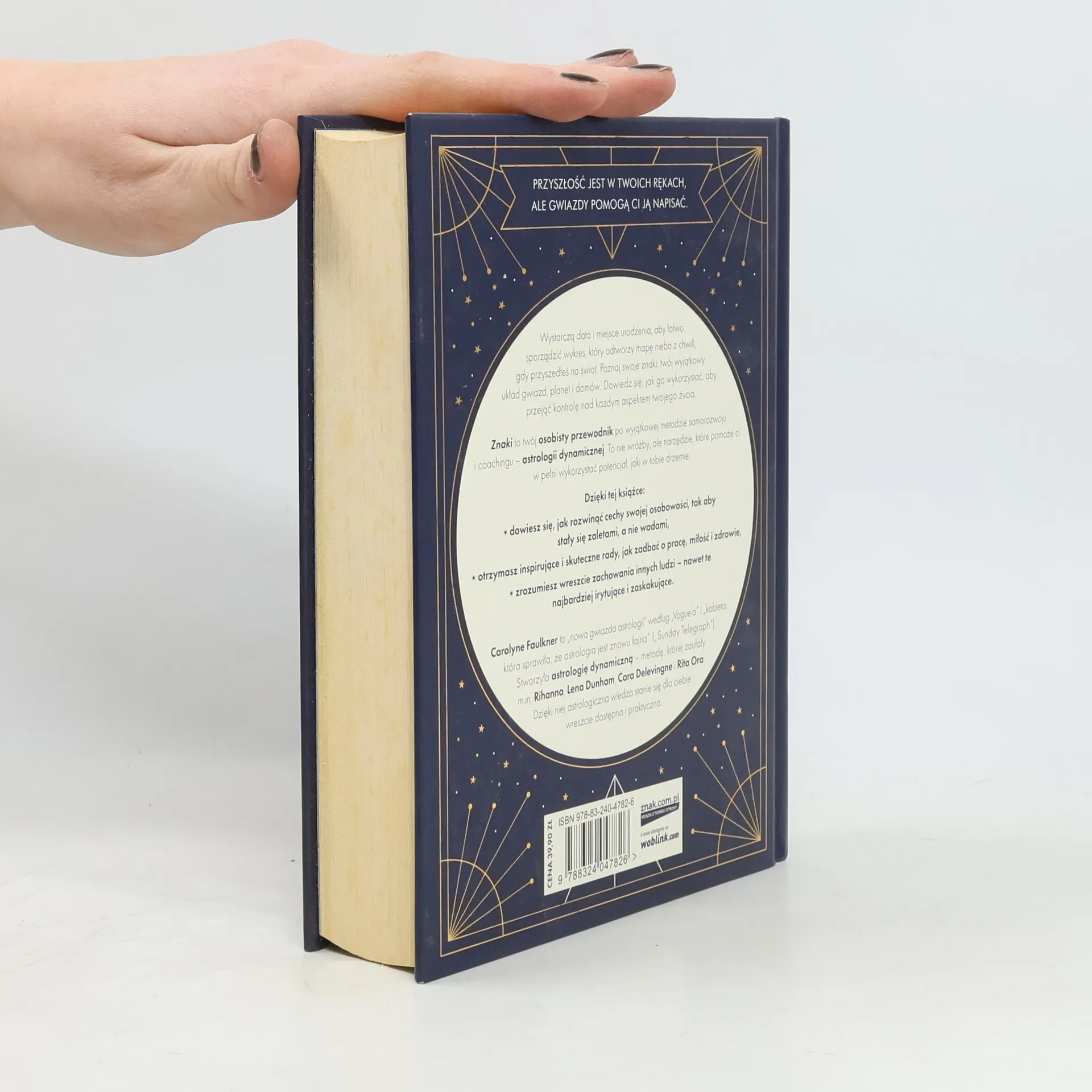 Przyszłość jest w twoich rękach, ale gwiazdy pomogą ci ją napisać.Wystarczy data i miejsce urodzenia, aby łatwo sporządzić wykres, kt�ry odtworzy mapę nieba z chwili, gdy przyszedłeś na świat. Poznaj swoje znaki: tw�j wyjątkowy układ gwiazd, planet i dom�w. Dowiedz się, jak go użyć, aby przejąć kontrolę nad każdym aspektem twojego życia. Znaki to tw�j osobisty przewodnik po wyjątkowej metodzie samorozwoju i coachingu ? astrologii dynamicznej. To nie wr�żby, ale narzędzie, kt�re pomoże ci w pełni wykorzystać potencjał, jaki w tobie drzemie. Dzięki tej książce:? dowiesz się, jak rozwinąć cechy swojej osobowości tak, aby stały się� � � � zaletami, a nie wadami,? dostaniesz inspirujące i skuteczne rady, jak zadbać o pracę, miłość i zdrowie,? zrozumiesz wreszcie zachowania innych ludzi ? nawet te najbardziej irytujące i zaskakujące.Carolyne Faulkner to ?nowa gwiazda astrologii? według ?Vogue?a? i ?kobieta, kt�ra sprawiła, że astrologia jest znowu fajna? (?Sunday Telegraph?). Stworzyła astrologię dynamiczną ? metodę, kt�rej zaufały m.in. Rihanna, Lena Dunham, Cara Delevingne i Cara Ora. Dzięki niej astrologiczna wiedza stanie się dla ciebie wreszcie dostępna i praktyczna.