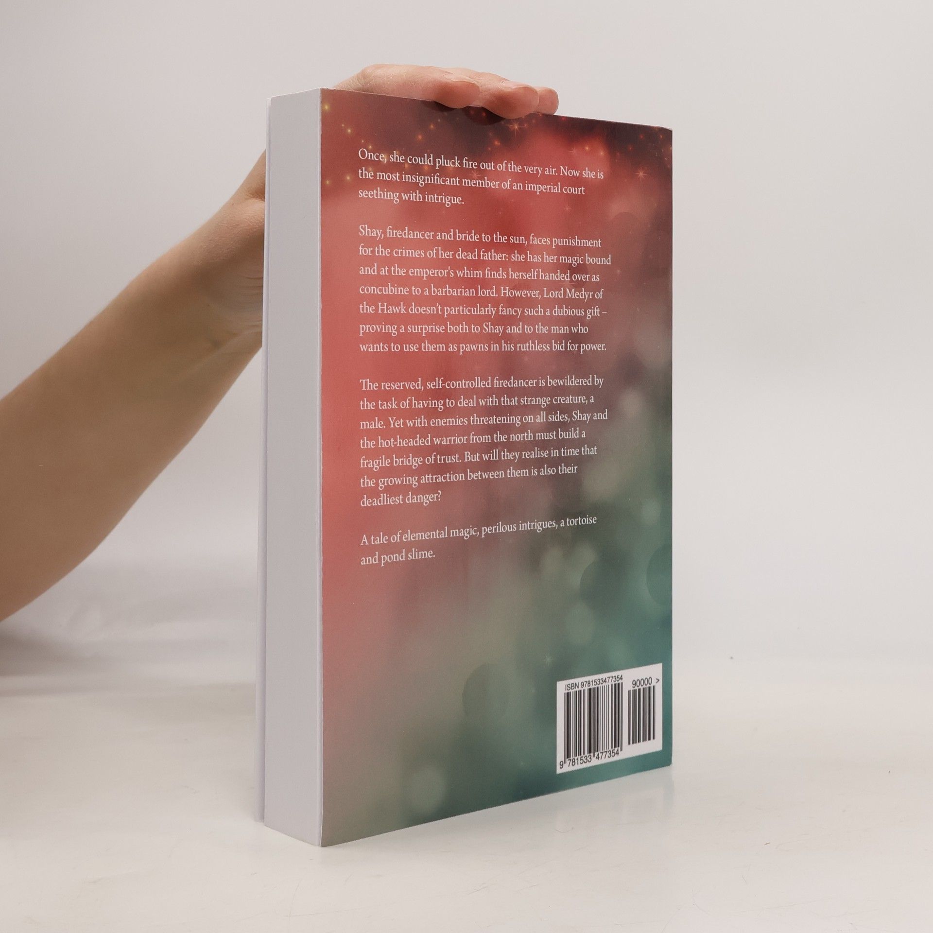 Once, she could pluck fire out of the very air. Now she is the most insignificant member of an imperial court seething with intrigue.Shay, firedancer and bride to the sun, faces punishment for the crimes of her dead she has her magic bound and at the emperor's whim finds herself handed over as concubine to a barbarian lord. However, Lord Medyr of the Hawk doesn’t particularly fancy such a dubious gift – proving a surprise both to Shay and to the man who wants to use them as pawns in his ruthless bid for power.The reserved, self-controlled firedancer is bewildered by the task of having to deal with that strange creature, a male. Yet with enemies threatening on all sides, Shay and the hot-headed warrior from the north must build a fragile bridge of trust. But will they realise in time that the growing attraction between them is also their deadliest danger?A tale of elemental magic, perilous intrigues, a tortoise and pond slime.
