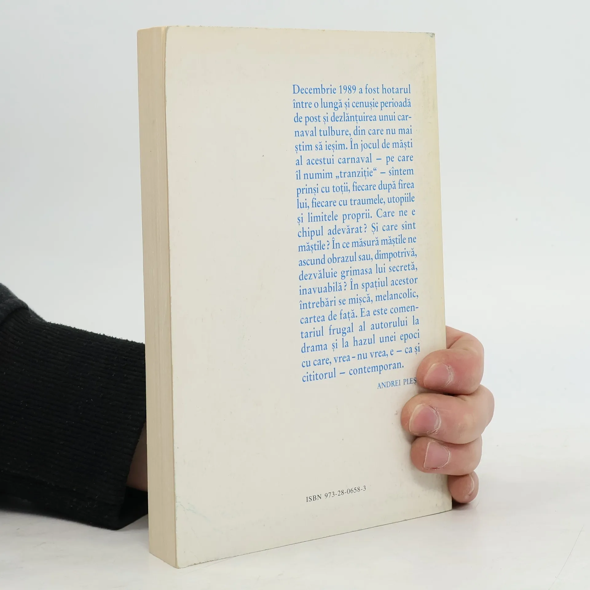 "Decembrie 1989 a fost hotarul intre o lunga si cenusie perioada de post si dezlantuirea unui carnaval tulbure, din care nu mai stim sa iesim. In jocul de masti al acestui carnaval - pe care il numim "tranzitie" - suntem prinsi cu totii, fiecare dupa firea lui, fiecare cu traumele, utopiile si limitele proprii. Care ne e chipul adevarat? Si care sunt mastile? In ce masura mastile ne ascund obrazul sau, dimpotriva, dezvaluie grimasa lui secreta, inavuabila? In spatiul acestor intrebari se misca, melancolic, cartea de fata. Ea este comentariul frugal al autorului la drama si la hazul unei epoci cu care, vrea-nu vrea, e - ca si cititorul - contemporan." - Andrei Plesu