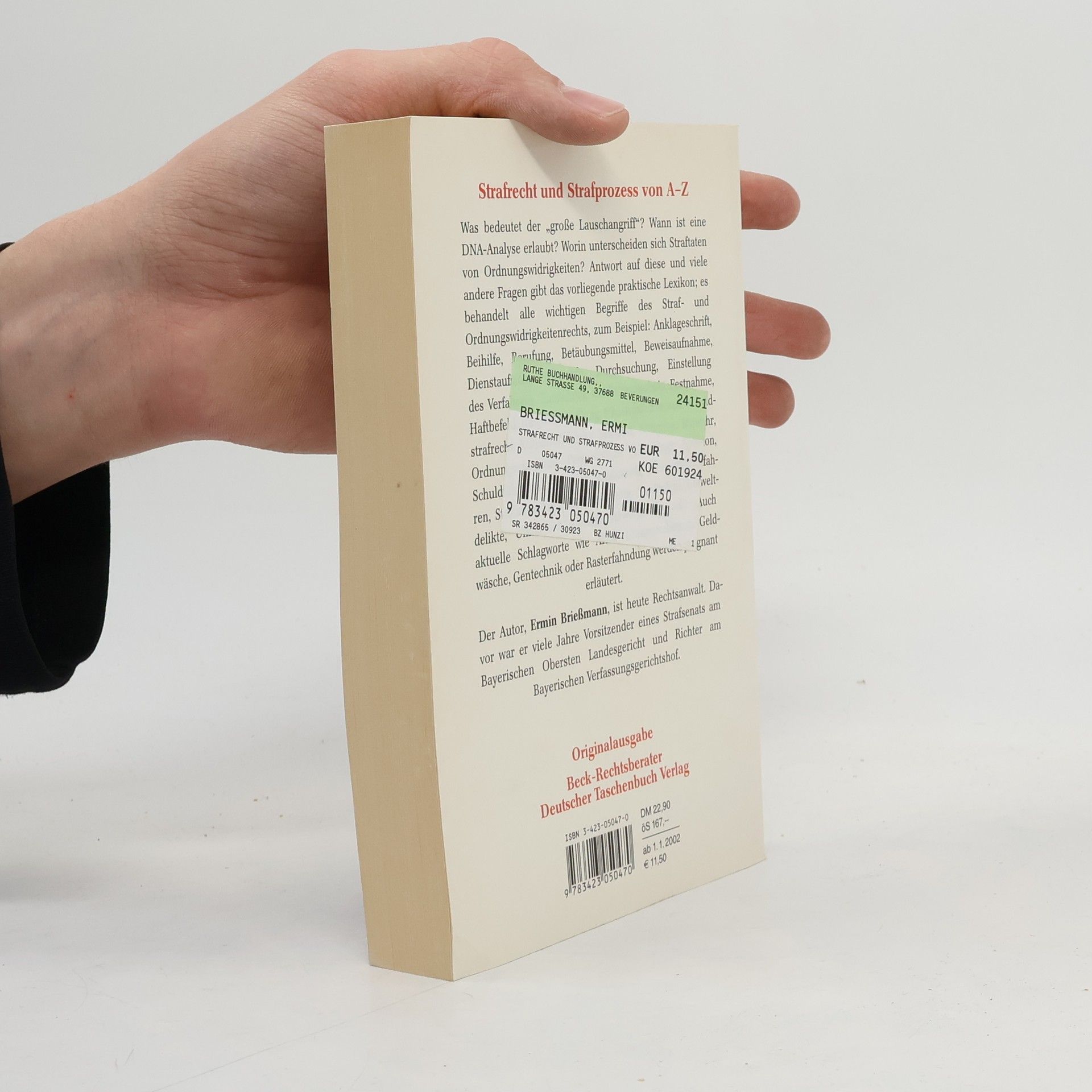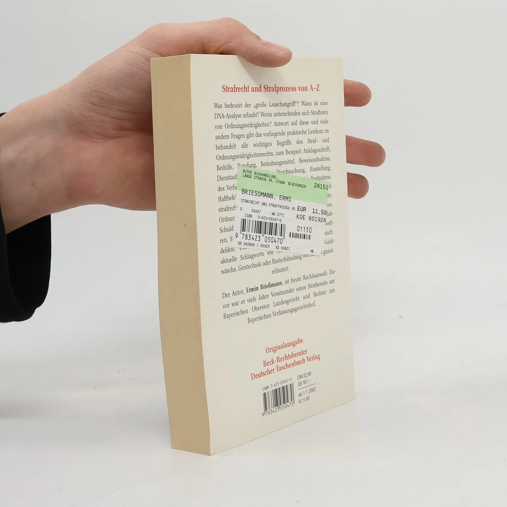 Was bedeutet der „große Lauschangriff“? Wann ist eine DNA-Analyse erlaubt? Worin unterscheiden sich Straftaten von Ordnungswidrigkeiten? Antwort auf diese und viele andere Fragen gibt das vorliegende praktische Lexikon; es behandelt alle wichtigen Begriffe des Straf- und Ordnungswidrigkeitenrechts, zum Beispiel: Anklageschrift, Beihilfe, Berufung, Betäubungsmittel, Beweisaufnahme, Dienstaufsichtsbeschwerde, Durchsuchung, Einstellung des Verfahrens, Entziehung der Fahrerlaubnis, Festnahme, Haftbefehl, Hauptverhandlung, Hausfriedensbruch, Jugendstrafrecht, Körperverletzung, Meineid, Nötigung, Notwehr, Ordnungswidrigkeit, Pressedelikte, Privatklage, Revision, Schuldfähigkeit, Sexueller Missbrauch, Steuerstrafverfahren, Strafaussetzung zur Bewährung, Strafbefehl, Umweltdelikte, Unfallflucht, Zeugnisverweigerungsrecht. Auch aktuelle Schlagworte wie AIDS, Computerbetrug, Geldwäsche, Gentechnik oder Rasterfahndung werden prägnant erläutert.