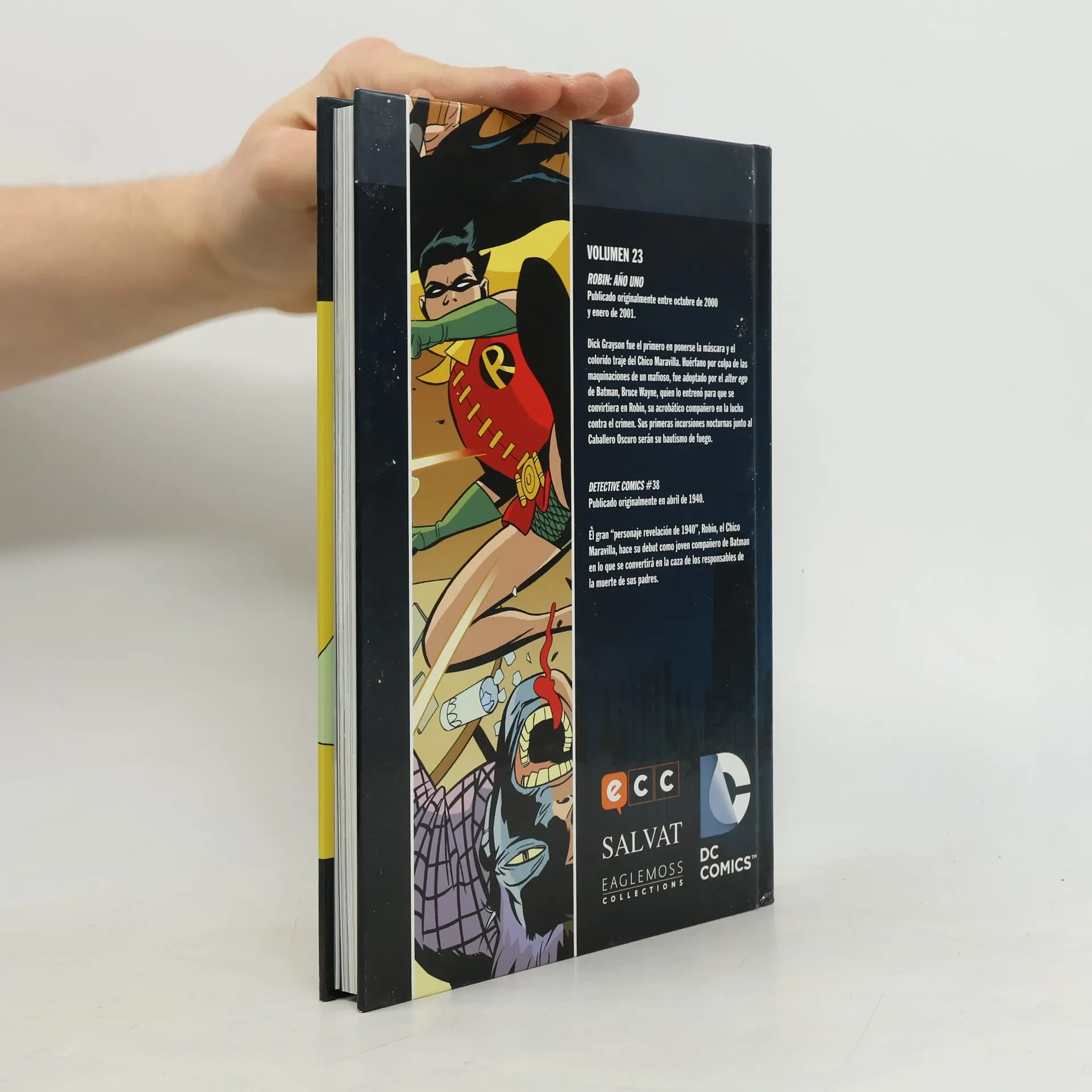 ROBIN: AÑO UNO Dick Grayson fue el primero en ponerse la máscara y el colorido traje del Chico Maravilla. Huérfano por culpa de las maquinaciones de un mafioso, fue adoptado por el alter ego de Batman, Bruce Wayne, quien lo entrenó para que se convirtiera en Robin, su acrobático compañero en la lucha contra el crimen. Sus primeras incursiones nocturnas junto al Caballero Oscuro serán su bautismo de fuego. DETECTIVE COMICS #38 El gran "personaje revelación de 1940", Robin, el Chico Maravilla, hace su debut como joven compañero de Batman en lo que se convertirá en la caza de los responsables de la muerte de sus padres.