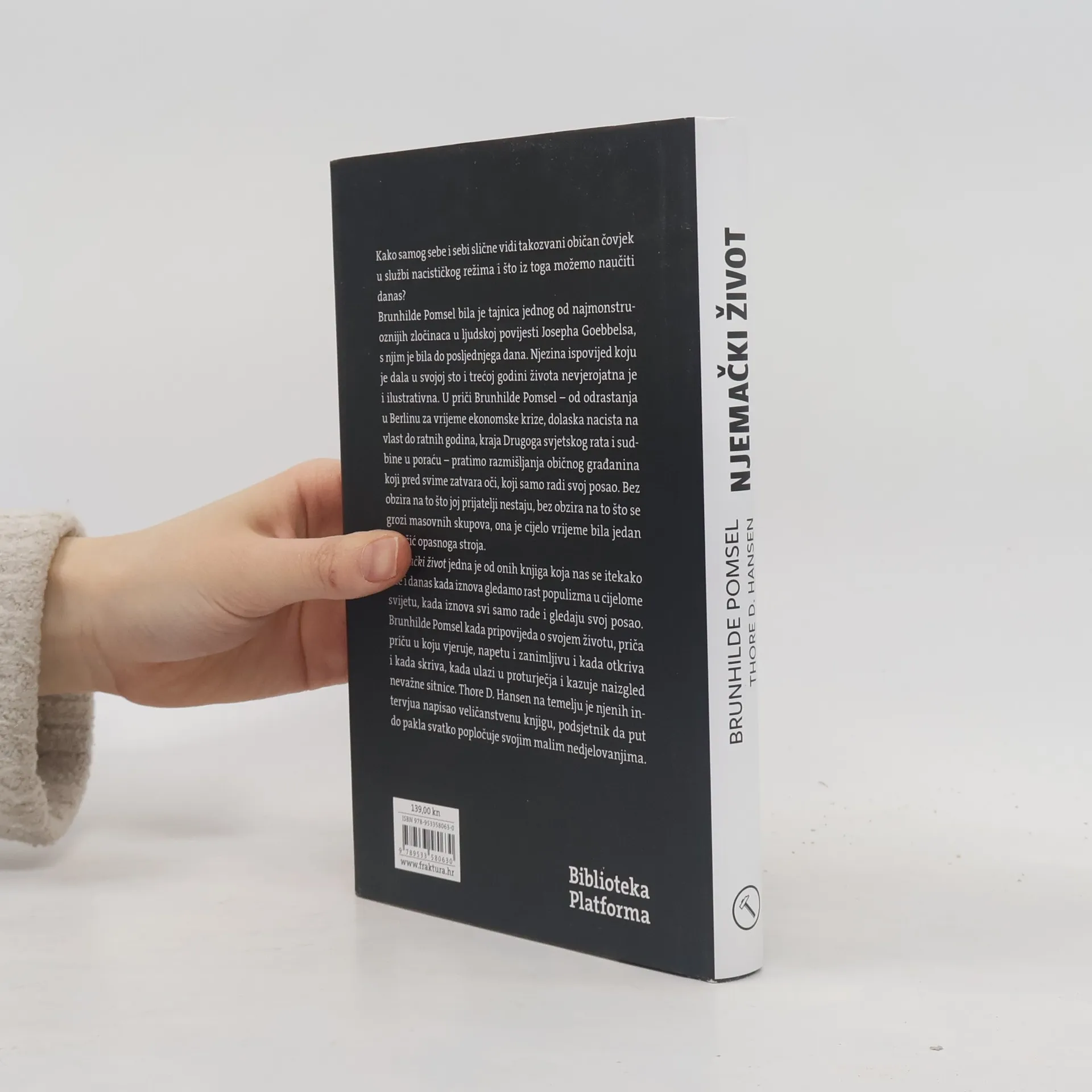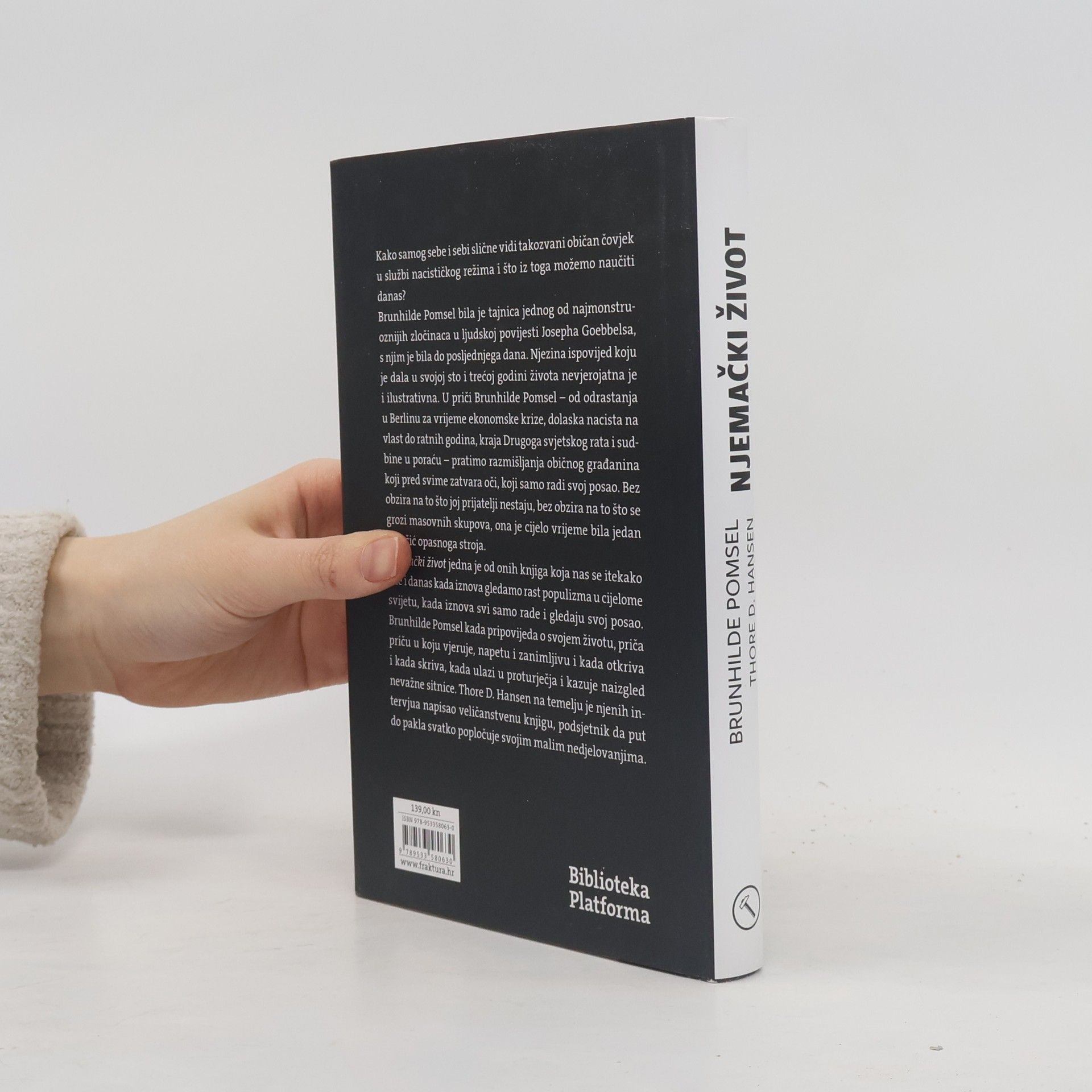 Kako samog sebe i sebi slične vidi takozvani običan čovjek u službi nacističkog režima i što iz toga možemo naučiti danas? Brunhilde Pomsel bila je tajnica jednog od najmonstruoznijih zločinaca u ljudskoj povijesti Josepha Goebbelsa, s njim je bila do posljednjega dana. Njezina ispovijed koju je dala u svojoj sto i trećoj godini života nevjerojatna je i ilustrativna. U priči Brunhilde Pomsel – od odrastanja u Berlinu za vrijeme ekonomske krize, dolaska nacista na vlast do ratnih godina, kraja Drugoga svjetskog rata i sudbine u poraću – pratimo razmišljanja običnog građanina koji pred svime zatvara oči, koji samo radi svoj posao. Bez obzira na to što joj prijatelji nestaju, bez obzira na to što se grozi masovnih skupova, ona je cijelo vrijeme bila jedan kotačić opasnoga stroja. Njemački život jedna je od onih knjiga koja nas se itekako tiče i danas kada iznova gledamo rast populizma u cijelome svijetu, kada iznova svi samo rade i gledaju svoj posao. Brunhilde Pomsel kada pripovijeda o svojem životu, priča priču u koju vjeruje, napetu i zanimljivu i kada otkriva i kada skriva, kada ulazi u proturječja i kazuje naizgled nevažne sitnice. Thore D. Hansen na temelju je njenih intervjua napisao veličanstvenu knjigu, podsjetnik da put do pakla svatko popločuje svojim malim nedjelovanjima.