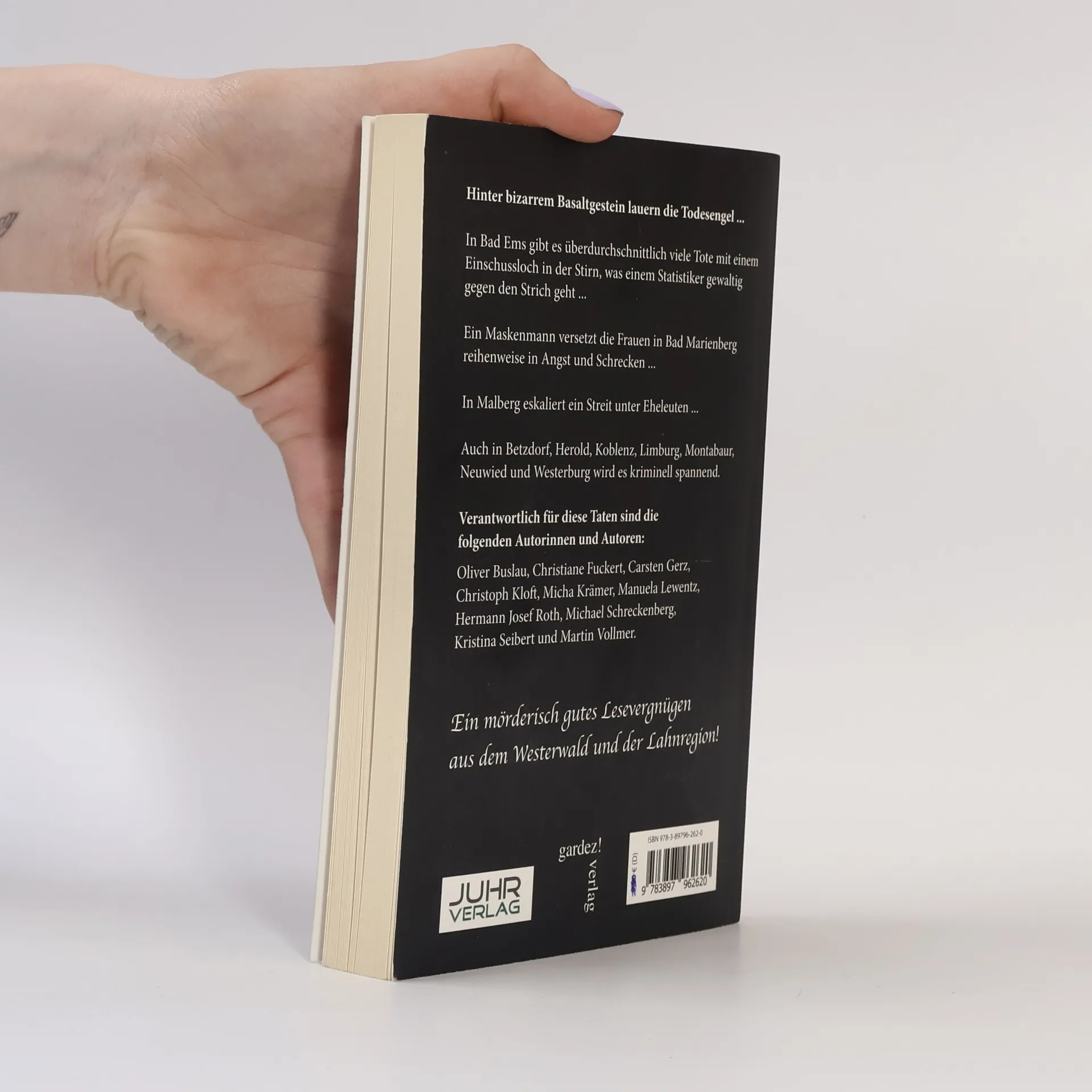 Hinter bizarrem Basaltgestein lauern die Todesengel ... In Bad Ems gibt es überdurchschnittlich viele Tote mit einem Einschussloch in der Stirn, was einem Statistiker gewaltig gegen den Strich geht ... Ein Maskenmann versetzt die Frauen in Bad Marienberg reihenweise in Angst und Schrecken ... In Malberg eskaliert eine Streit unter Eheleuten ... Auch in Betzdorf, Herold, Koblenz, Limburg, Montabaur, Neuwied und Westerburg wird es kriminell spannend. Verantwortlich für diese Taten sind die folgenden Autorinnen und Autoren: Oliver Buslau, Christiane Fuckert, Carsten Gerz, Christoph Kloft, Micha Krämer, Manuela Lewentz, Hermann Josef Roth, Michael Schreckenberg, Kristina Seibert und Martin Vollmer. Ein mörderisch gutes Lesevergnügen aus dem Westerwald und der Lahnregion!