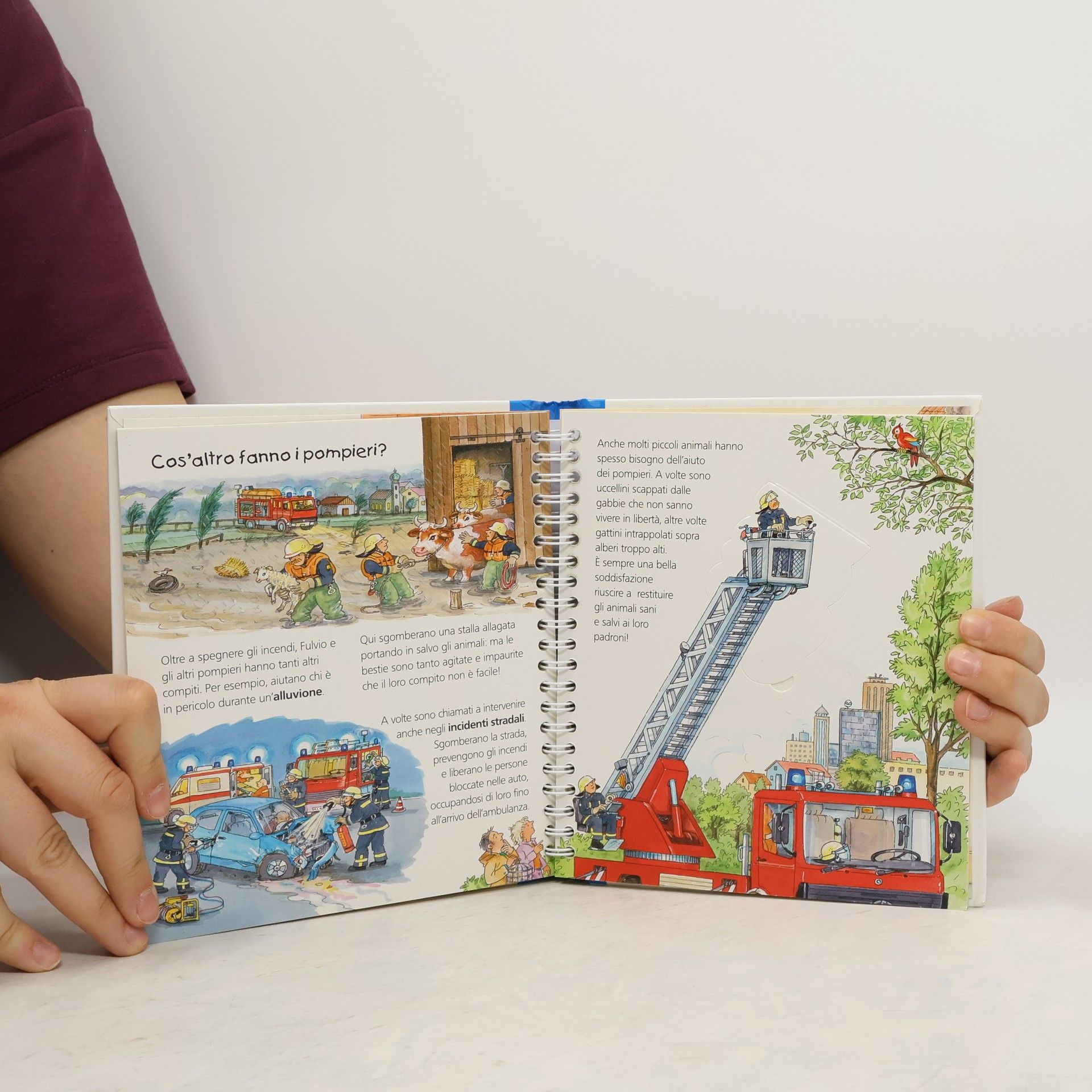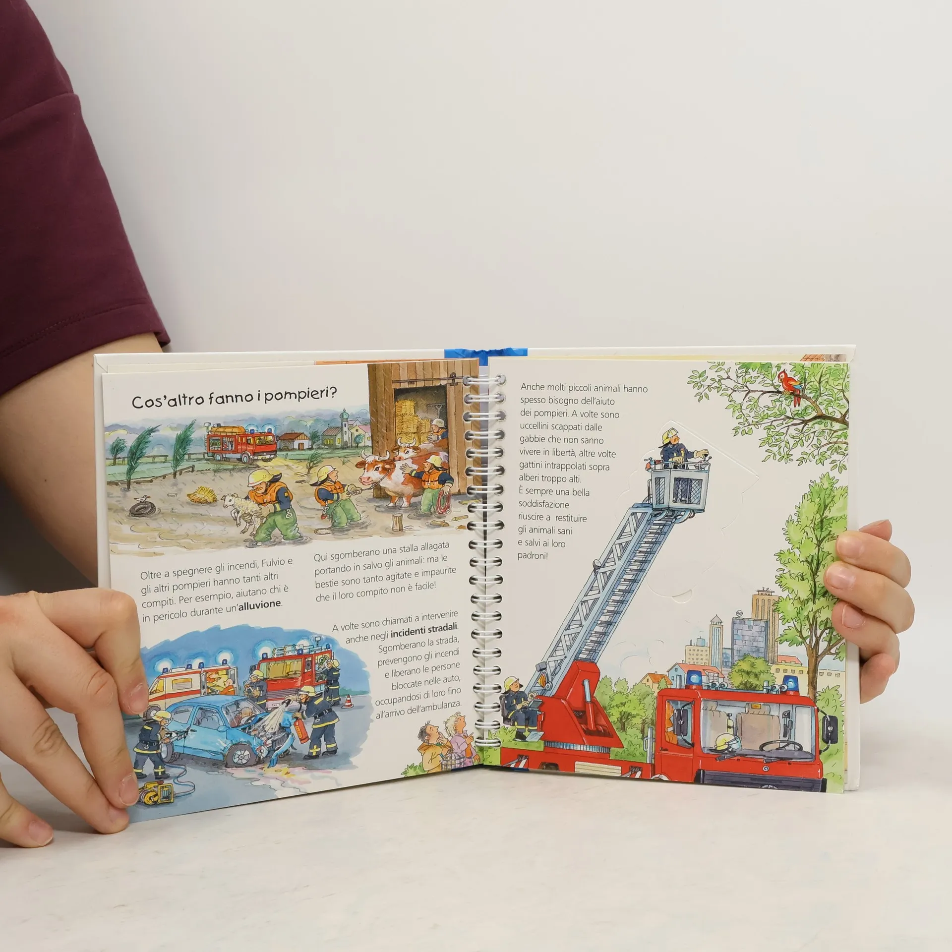 Come si spegne un incendio? Quali mezzi usano i pompieri? Che divise indossano? Un libro tutto illustrato che aiuta a capire il mondo, offrendo risposte chiare ed esaurienti alle mille domande dei bambini. Osservando le immagini e scoprendo cosa si nasconde sotto i grandi flap, ogni pagina è una bella avventura! Età di da 4 anni.