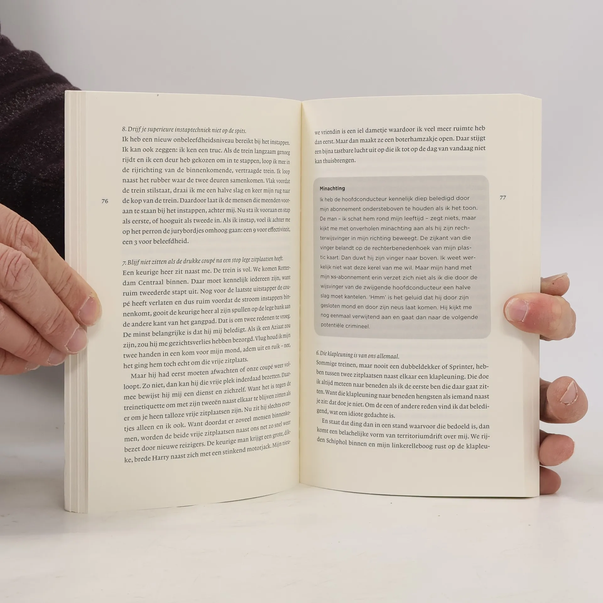 Belevenissen in de trein: je zou er een boek over kunnen schrijven. Dat is dan nu gebeurd! Op een vlotte onderhoudende manier verhaalt de schrijver, journalist van de Volkskrant, als forens over de dagelijkse bekommernissen bij 'het spoor' op dagboekachtige wijze; niet zelden hilarisch waar treurnis heerst, want er gaat veel mis op ons nationale geprivatiseerde en gesegmenteerde spoorwegnet. Ook een pragmatisch boek, vol handige tips voor de (aspirant) reiziger. Een must voor de collega-forens, want kommer en kwel verbroedert. W.J.M. Leideritz