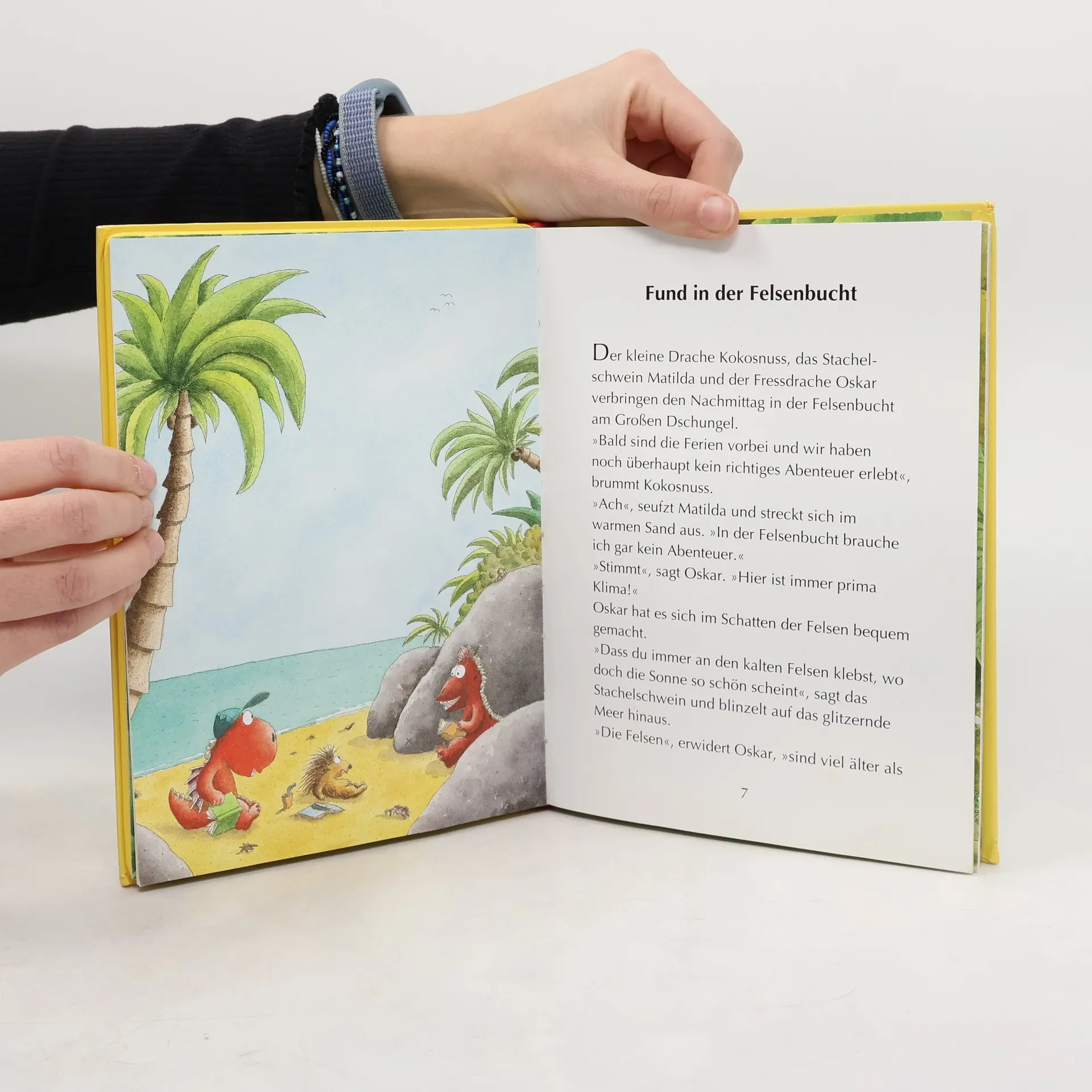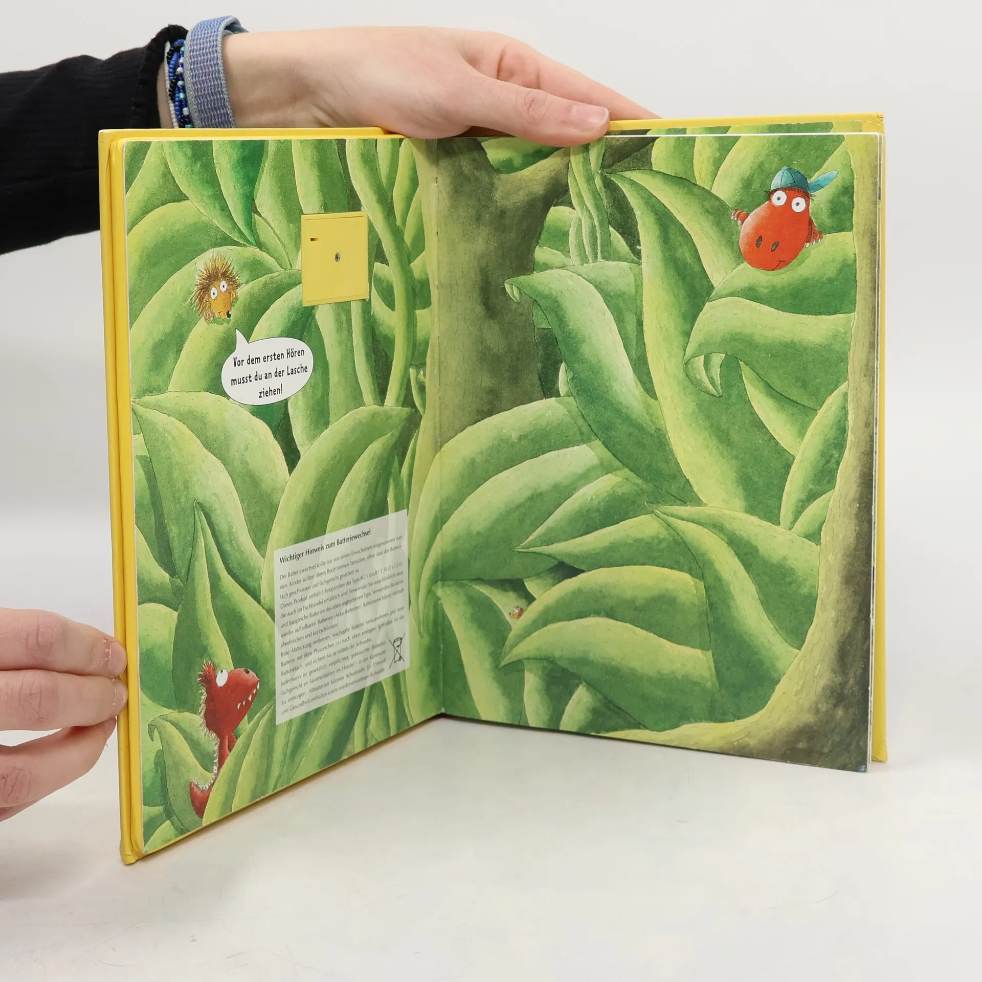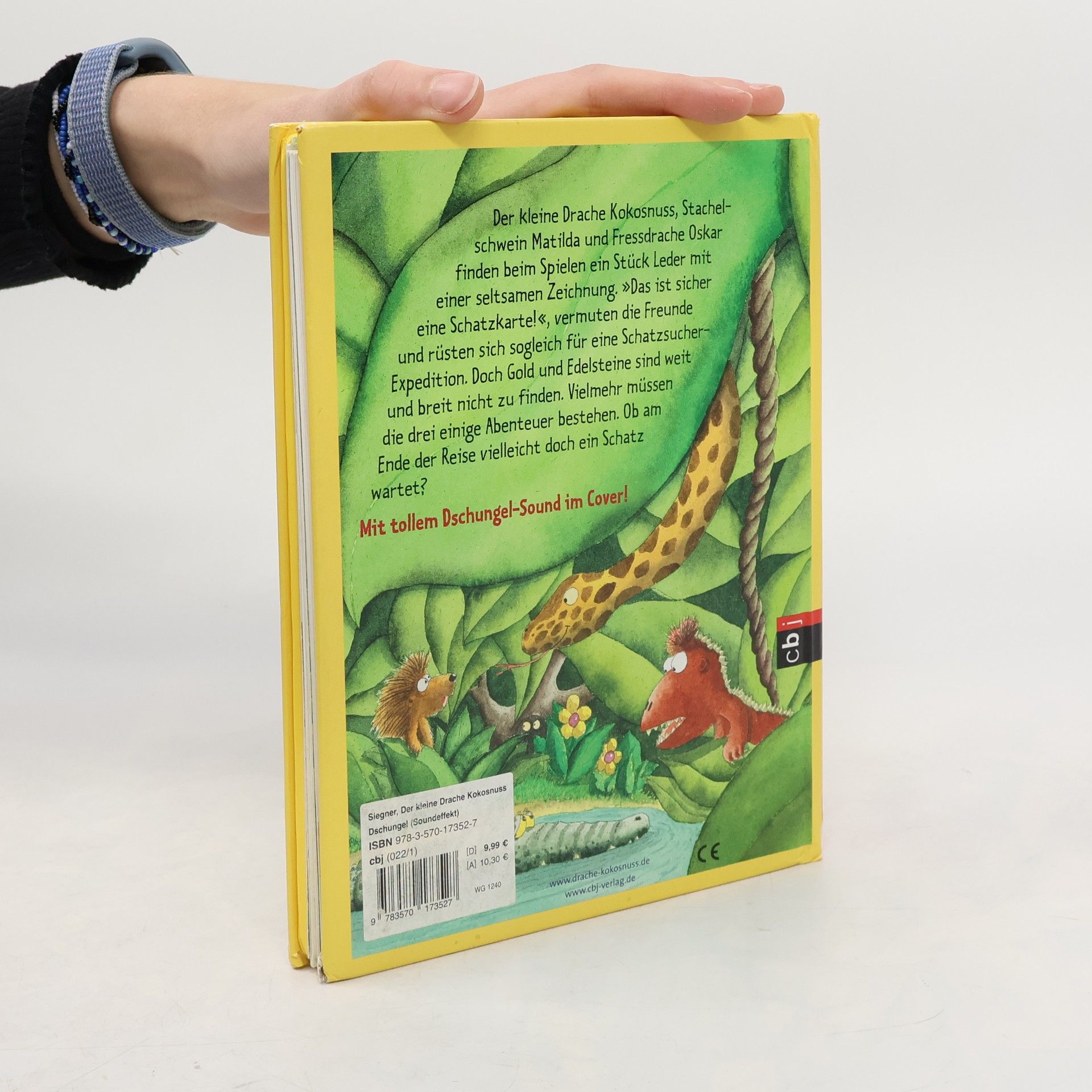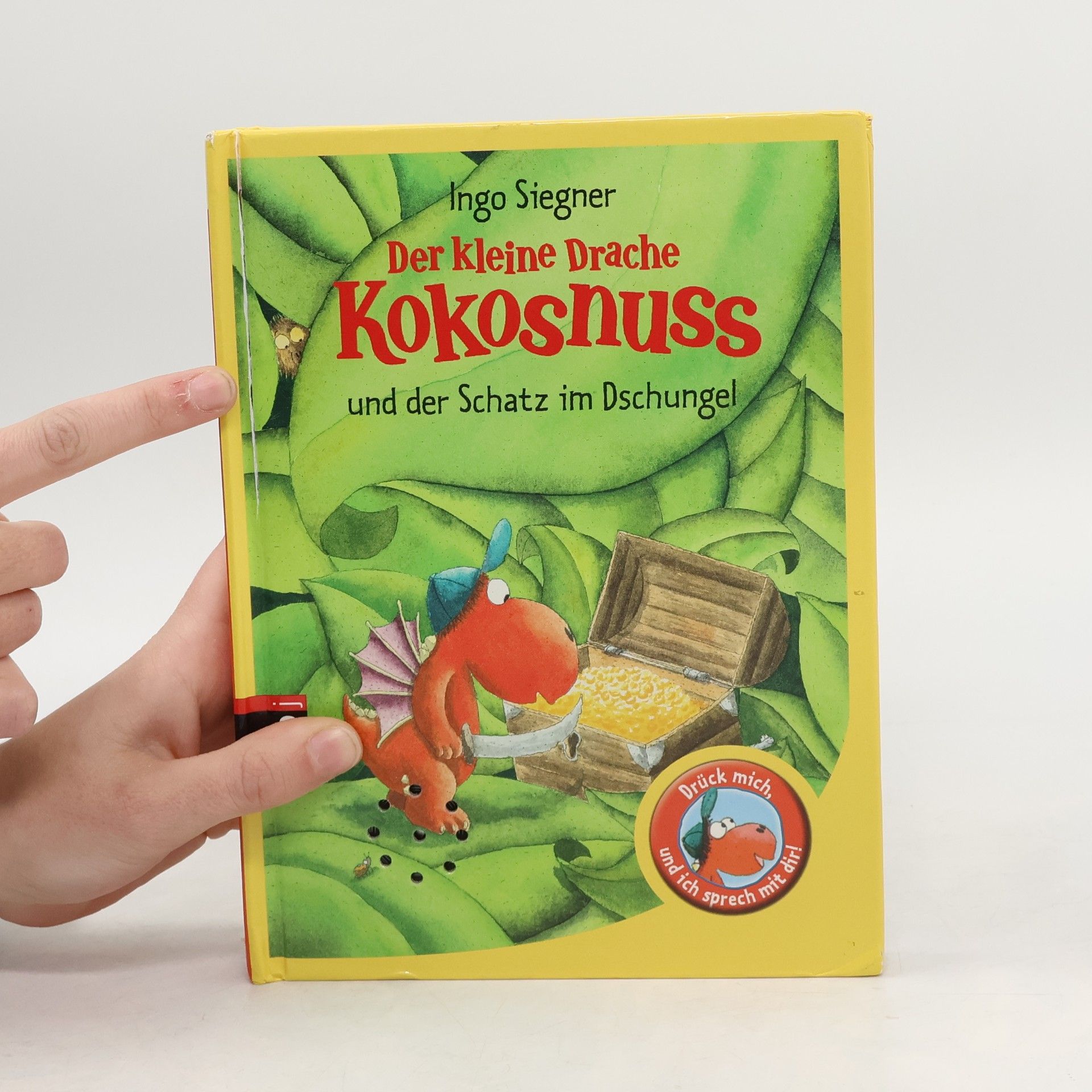 Ab in den Dschungel! Beim Spielen finden der kleine Drache Kokosnuss und seine Freunde Matilda und Oskar eine alte Schatzkarte. Diese führt sie mitten in einen gefährlichen Dschungel, wo Würgeschlangen, Tiger und Krokodile auf sie warten. Die drei müssen all ihren Mut zusammennehmen, doch am Ende ihrer abenteuerlichen Reise wartet eine große Überraschung … Drück den Button: Mit spannenden Dschungel-Geräuschen Ausstattung: Mit fbg. Illustrationen