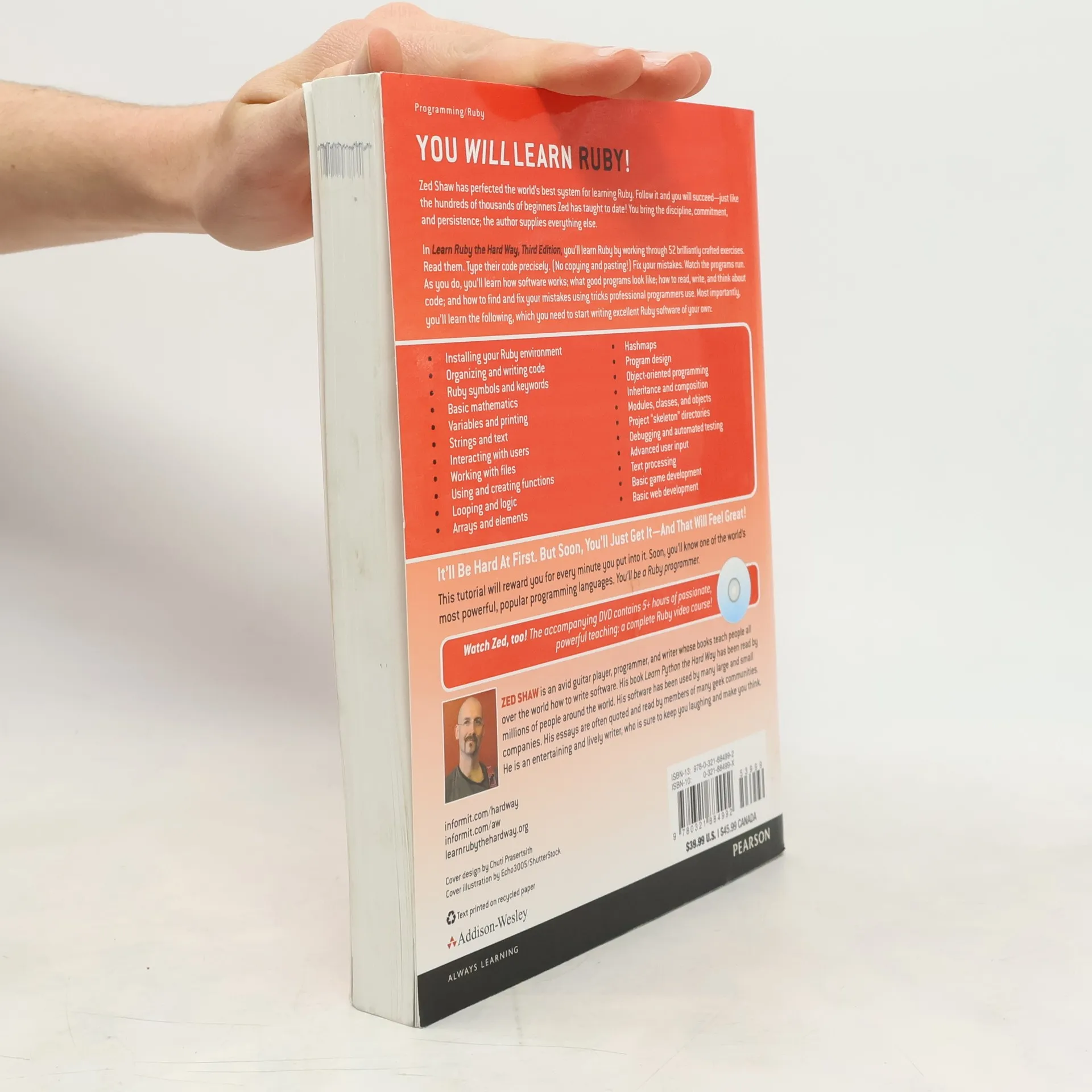 Master Ruby and become a programmer, even if you never thought you could! This breakthrough book and CD help anyone get started in programming. While it’s called "The Hard Way," the approach is straightforward. The "hard" part involves discipline, practice, and persistence. Zed A. Shaw teaches Ruby through a series of well-crafted exercises, all consistently formatted and no longer than two pages (including "extra credit"). By reading, typing the sample code precisely (no copy-and-paste!), and making the programs run, you'll learn how software and programming work, what good programs look like, and how to read, write, and see code. You’ll cover Ruby logic, input/output, variables, and functions, ultimately building complete web applications. Most importantly, you’ll develop the attention to detail essential for successful programming. Initially, it may be challenging, but it gets easier. Shaw provides over 5 hours of teaching videos on the accompanying CD for extra guidance. His thousands of online fans can attest to the moment you just "get it" — and it feels "great." Nothing worthwhile comes without hard work and focus, but with this package, if you bring those qualities, you will master Ruby and enjoy the rewards that follow!