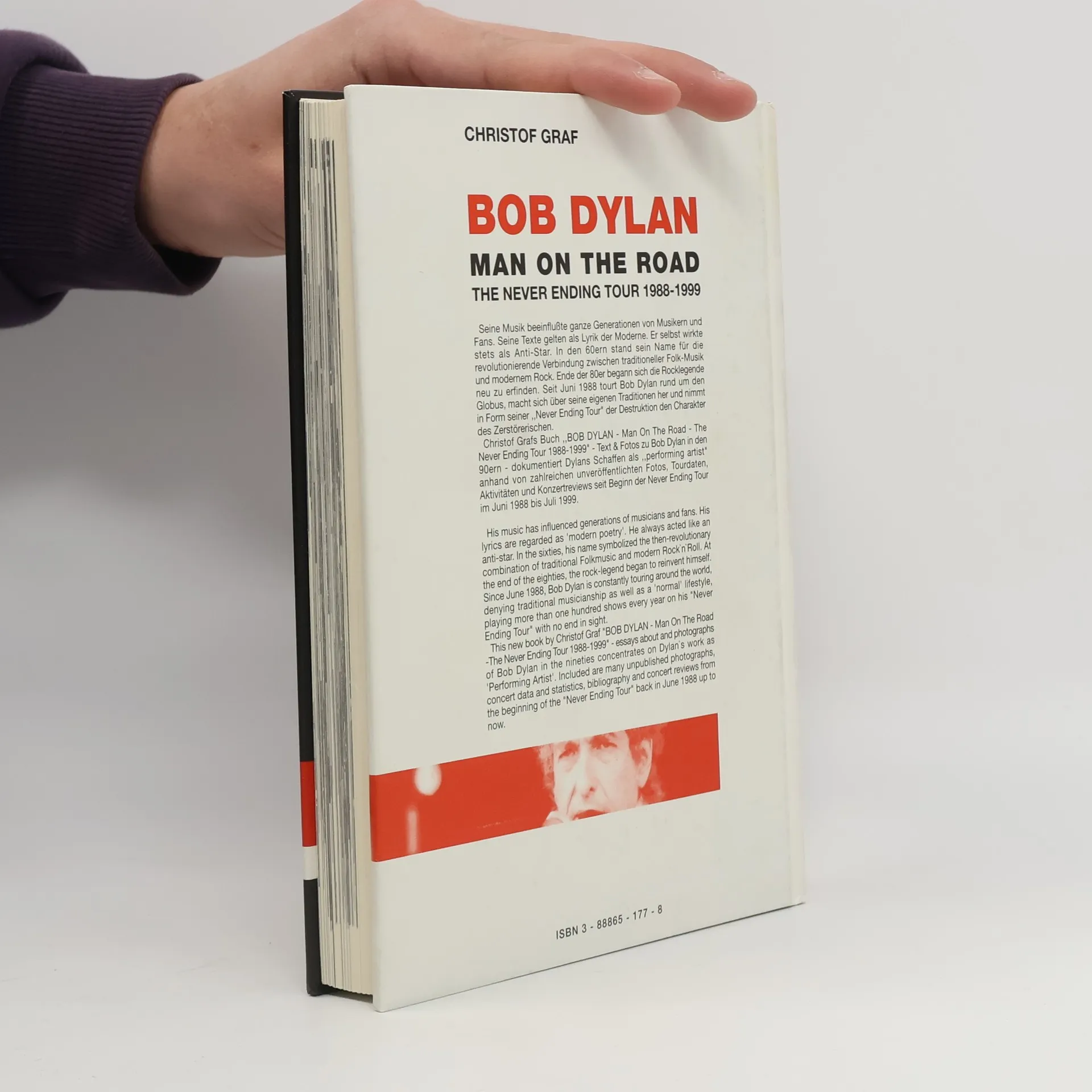 This book by Christof Graf documents Bob Dylan's work as a "performing artist" from July 1988 to July 1999, featuring unpublished photos, tour dates, activities, and concert reviews. It highlights Dylan's influence on generations and his evolution during the "Never Ending Tour."