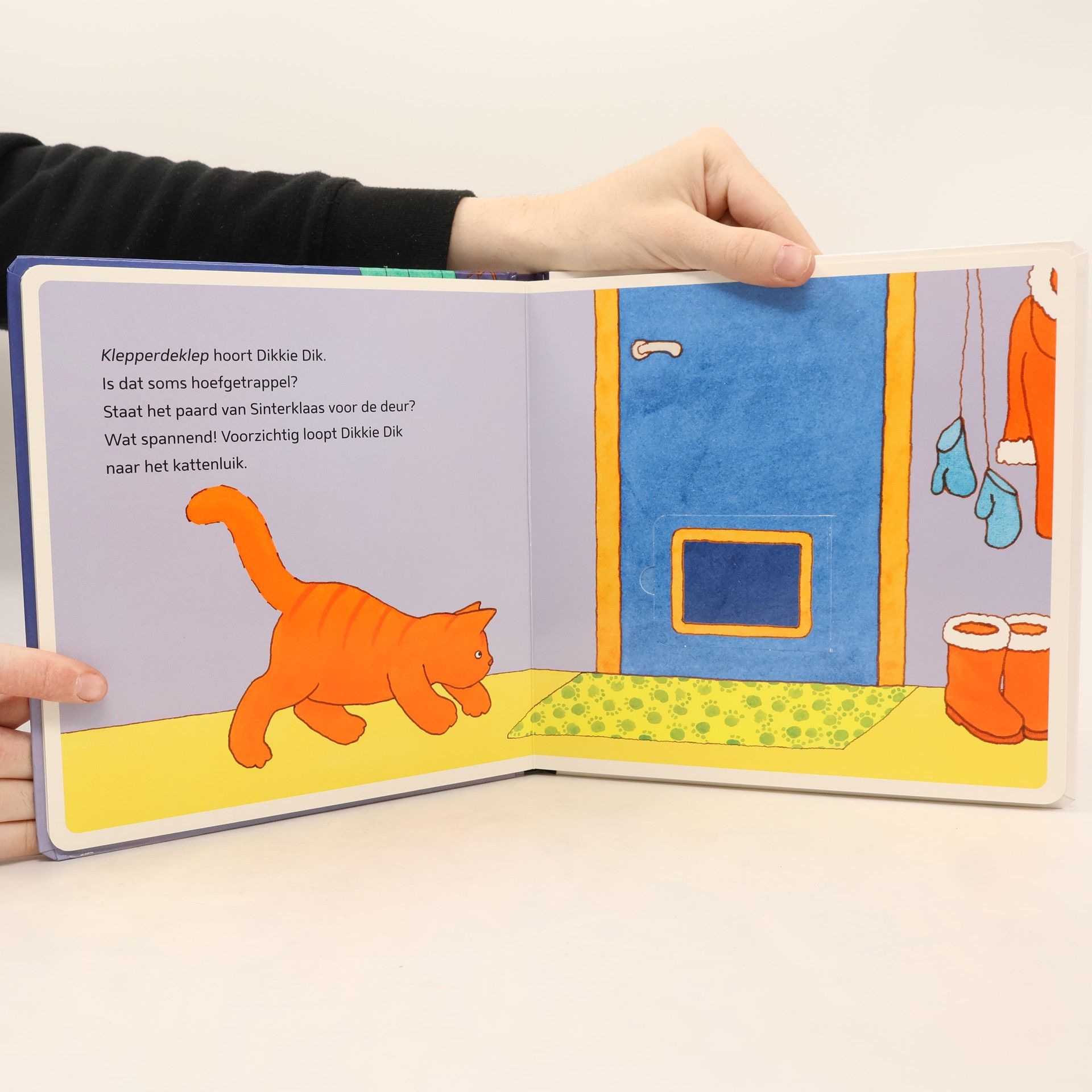 Een Sinterklaasverhaaltje over de favoriete kater van Nederlandse en Vlaamse peuters! In het flapjesboek ‘Dikkie Dik wacht op Sinterklaas’ van Jet Boeke wil Dikkie Dik nog lang niet slapen. Wat als hij slaapt als Sinterklaas langskomt? In dit kartonboek wacht Dikkie Dik vol verwachting of hij de hoeven het paard van Sinterklaas al hoort op het dak. Maar telkens als hij denkt hem te horen is het een ander dier. En daar wordt Dikkie Dik zo slaperig van… Een Sinterklaasboek over de favoriete kater van Nederlandse en Vlaamse peuters! En omdat we weten dat Dikkie Dik-fans zo dol zijn op flappen, zit er op elke spread wel eentje om iets achter te ontdekken.