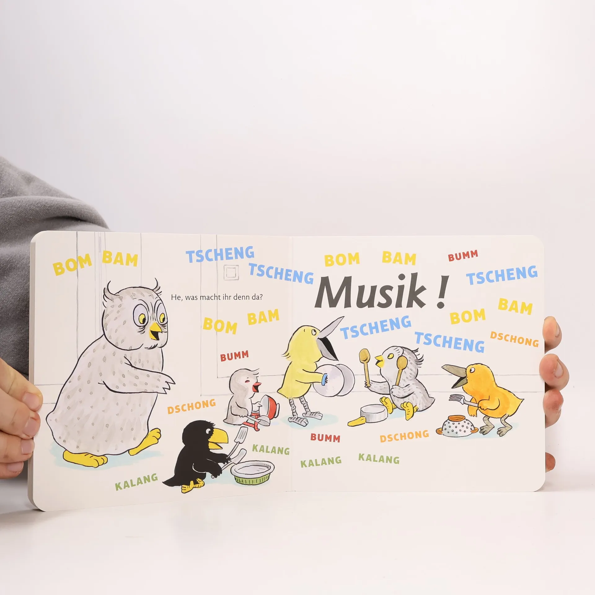 Mit allem lässt sich Musik machen! Das zeigt dieses Pappbilderbuch aufs Schönste. Im Küchenschrank stehen die besten Musikinstrumente: Töpfe, Deckel, Blechsiebe, Schalen, dazu Holzlöffel, Gabeln oder Schöpfkellen. Damit lässt sich tolle Musik machen: DSCHONG KALANG DSCHONG KALANG – TSCHENG BAM BUMM. Aber irgendwann wird es zu viel: Mama sammelt zum großen Bedauern aller kleinen Musiker die Instrumente ein - und bringt zum Ausgleich Kuchen. Doch kaum ist der verzehrt, stellt sich die Frage, was man nun spielen könne … In dieses Pappbilderbuch kann man sich prompt verlieben, denn es ist so nah an Kindern und deren Spielfreude, wie man sich das nur wünschen kann.