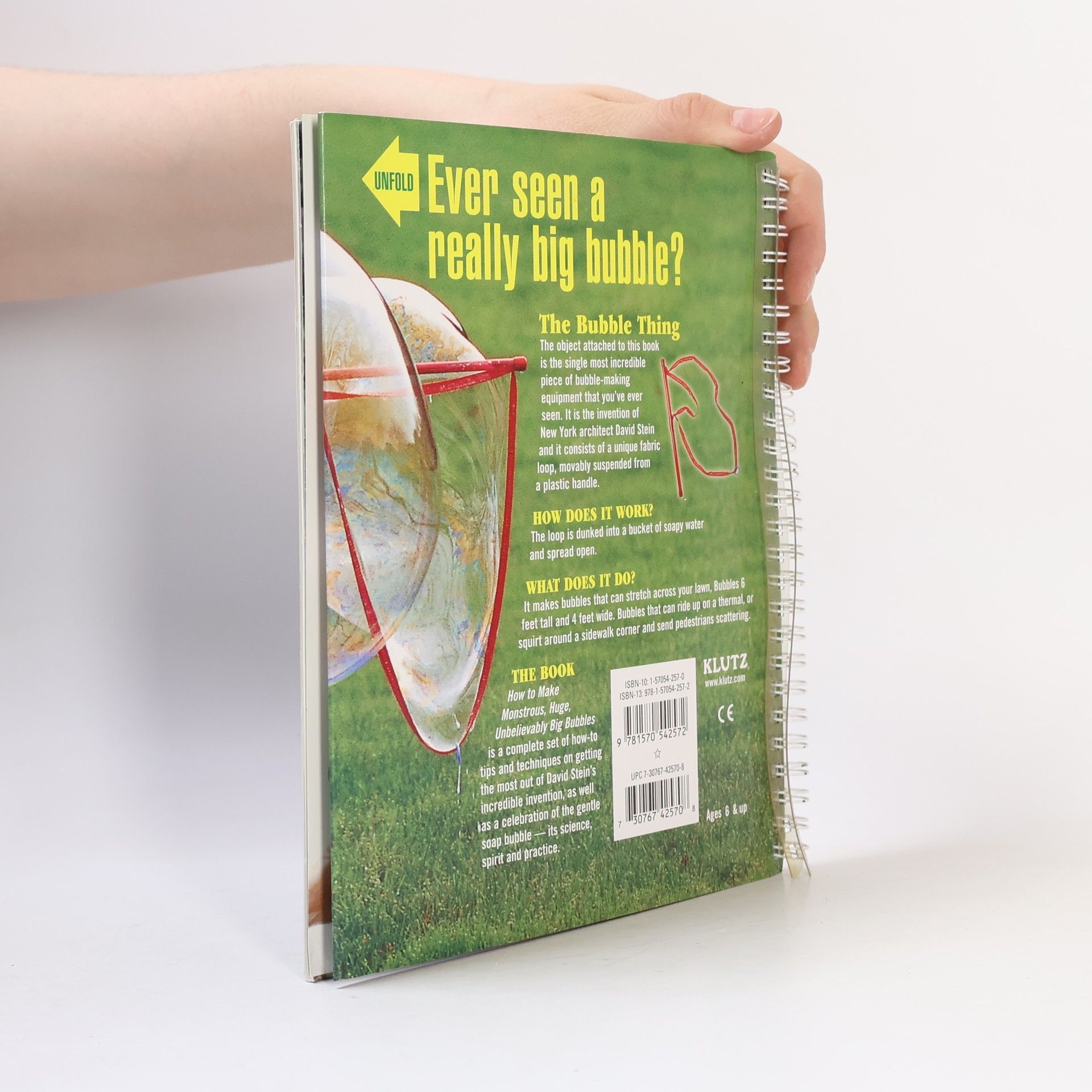 These aren't just big bubbles: these are the original, humongous, giant bubbles! Big Bubbles comes with the original Bubble Thing, the top-selling bubble maker that lets you make bubbles so big you'll want to climb right inside them. The book of instructions, tips, and techniques helps you create the most enormous, huge, rainbow-colored bubbles ever.Comes with: 38 page book, the Bubble Thing toy