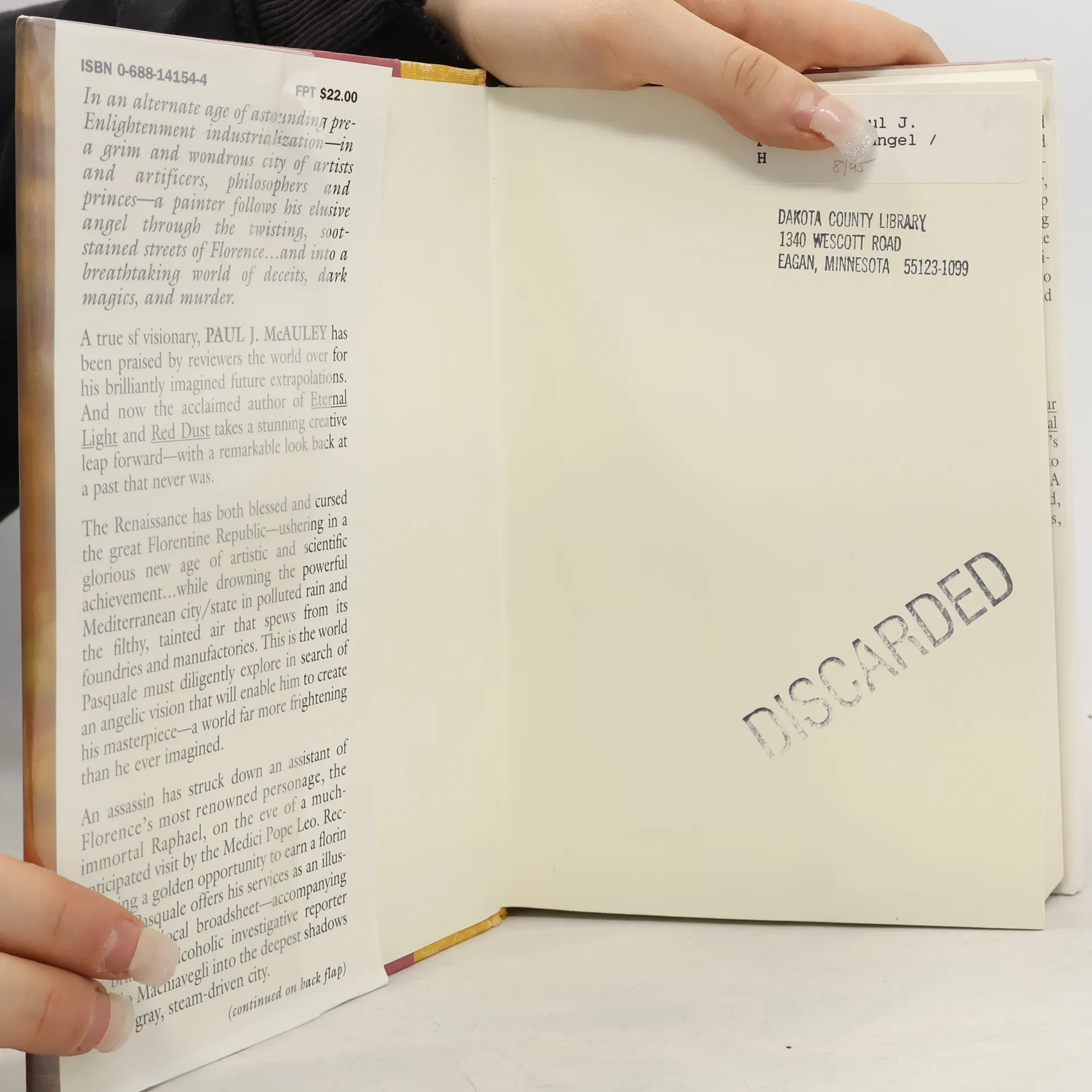 On the eve of the Medici Pope's visit, an assassin has struck down an assistant to the immortal Raphael. It is a crime that draws a young artist named Pasquale and the investigative reporter Niccolo Macchiaveglia into the deepest shadows of their gray city--where there are fouler deaths to follow, and grave intrigues of war, withccraft and science. HC: AvoNova.