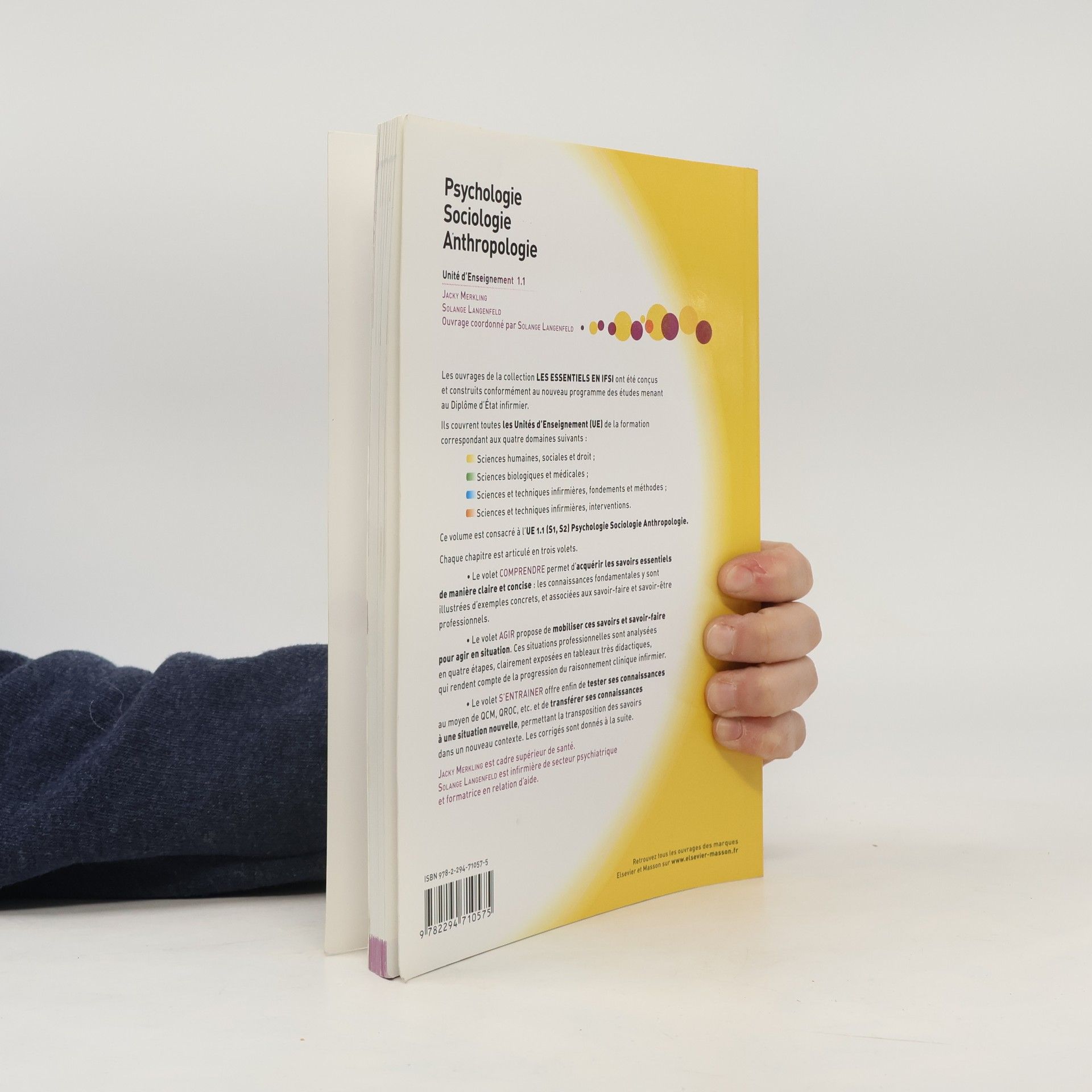 Les ouvrages de la collection Les essentiels en IFSI ont été conçus et construits conformément au nouveau programme des études menant au Diplôme d'État infirmier. Ils couvrent toutes les Unités d'Enseignement (UE) de la formation correspondant aux quatre domaines suivants : Sciences humaines, sociales et droit ; Sciences biologiques et médicales ; Sciences et techniques infirmières, fondements et méthodes ; Sciences et techniques infirmières, interventions. Ce volume est consacré à l'UE 1.1 (S1, S2) Psychologie Sociologie Anthropologie. Chaque chapitre est articulé en trois volets. Le volet " Comprendre " permet d'acquérir les savoirs essentiels de manière claire et concise : les connaissances fondamentales y sont illustrées d'exemples concrets, et associées aux savoir-faire et savoir-être professionnels. Le volet " Agir " propose de mobiliser ces savoirs et savoir-faire pour agir en situation. Ces situations professionnelles sont analysées en quatre étapes, clairement exposées en tableaux très didactiques, qui rendent compte de la progression du raisonnement clinique infirmier. Le volet " S'entraîner " offre enfin de tester ses connaissances au moyen de QCM, QROC, etc. et de transférer ses connaissances à une situation nouvelle, permettant la transposition des savoirs dans un nouveau contexte. Les corrigés sont donnés à la suite.